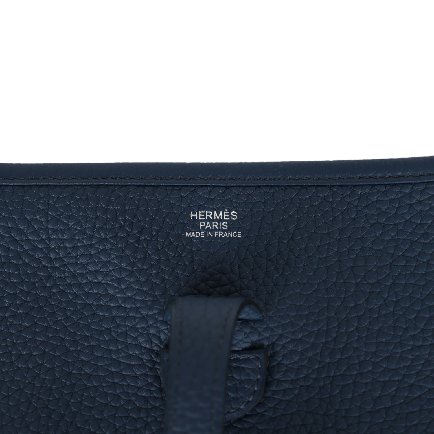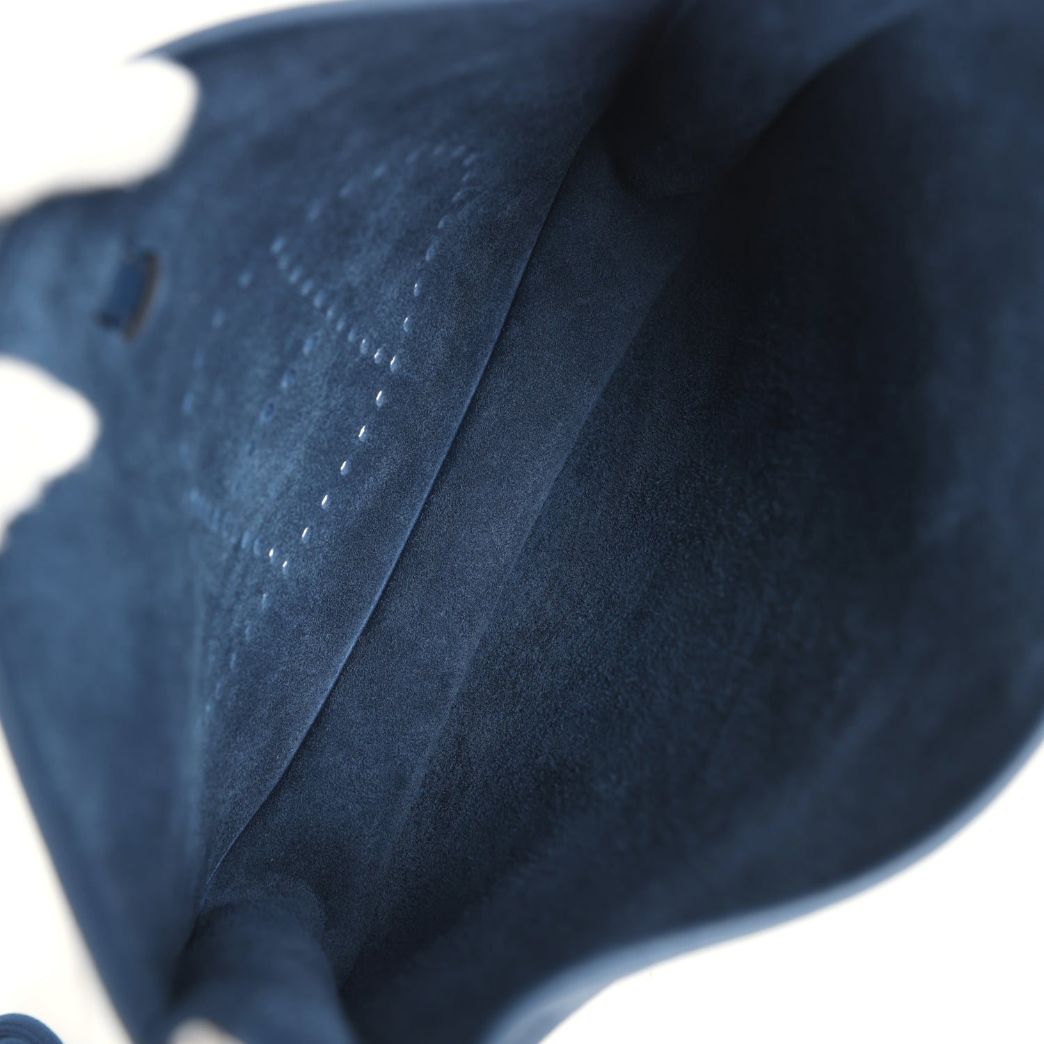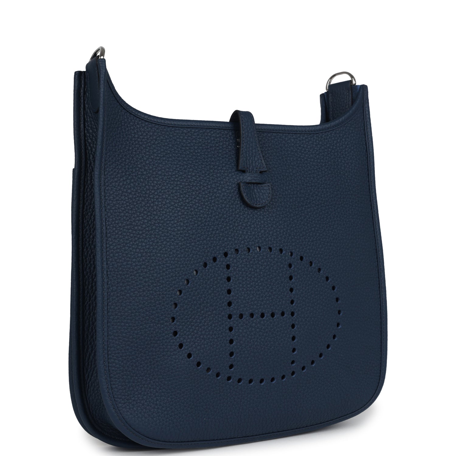 This Evelyne is in Bleu de Prusse clemence leather with palladium hardware, featuring tonal stitching, large perforated H in circle (front), pull tab top snap closure and removable Bleu De Prusse shoulder/crossbody strap, with exterior back pocket.