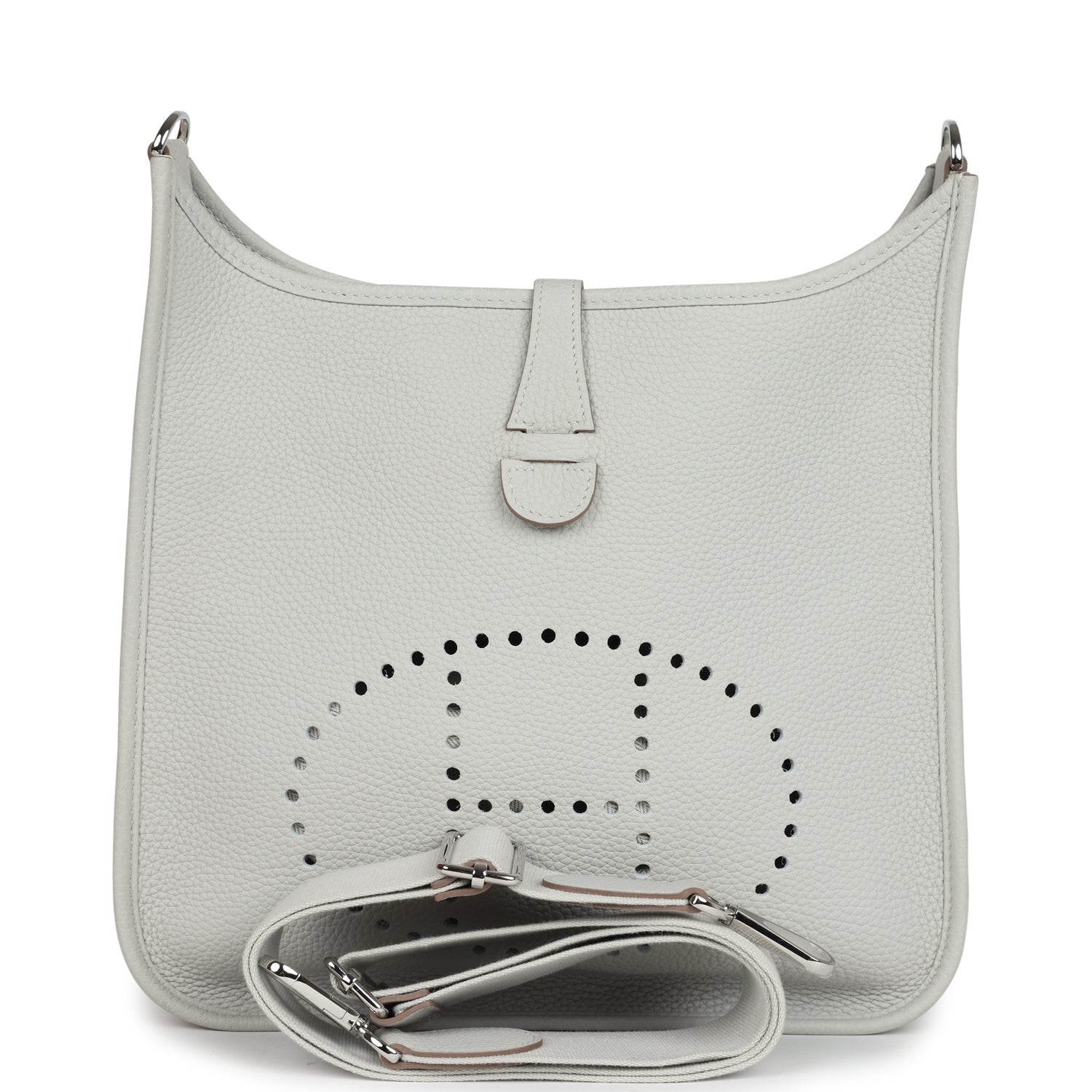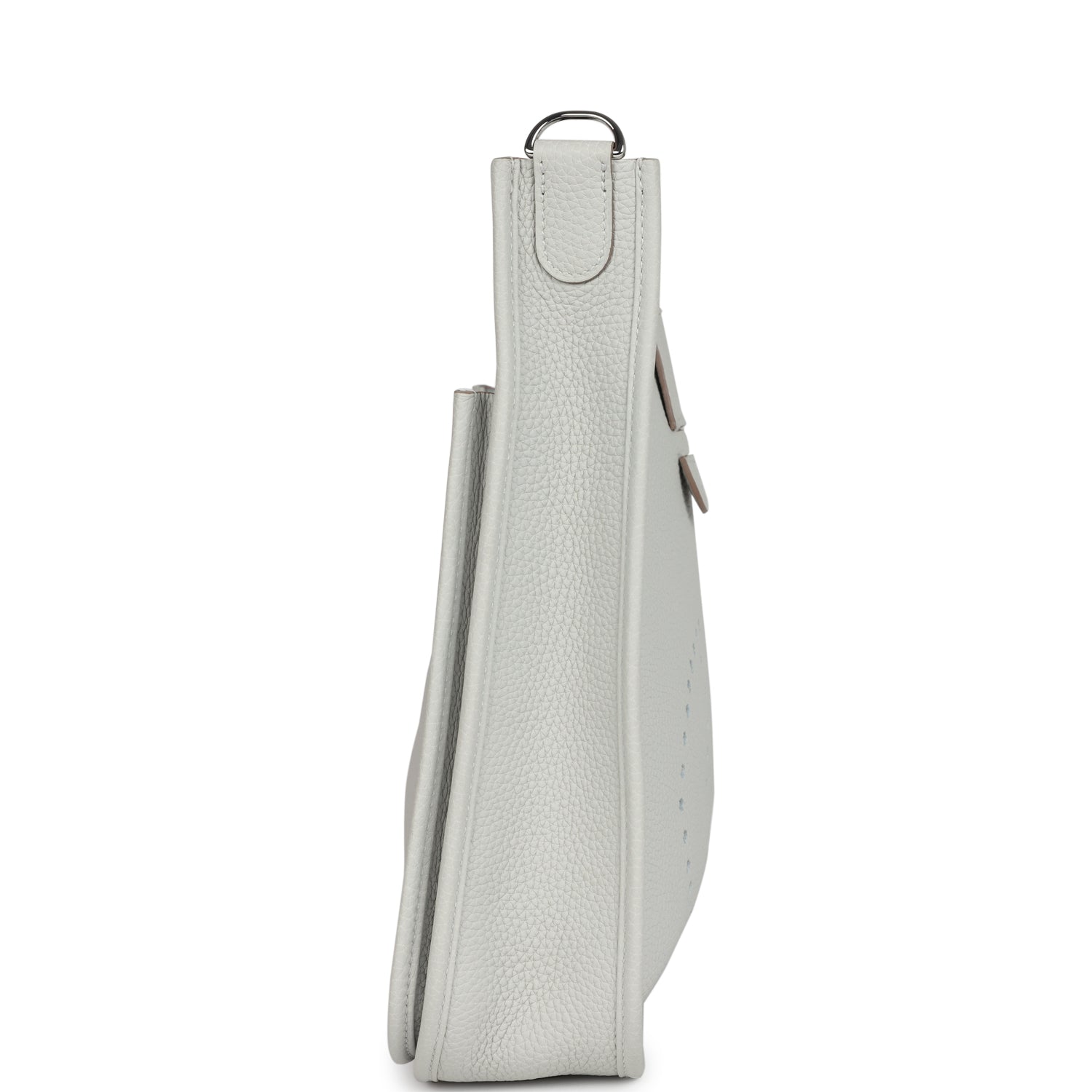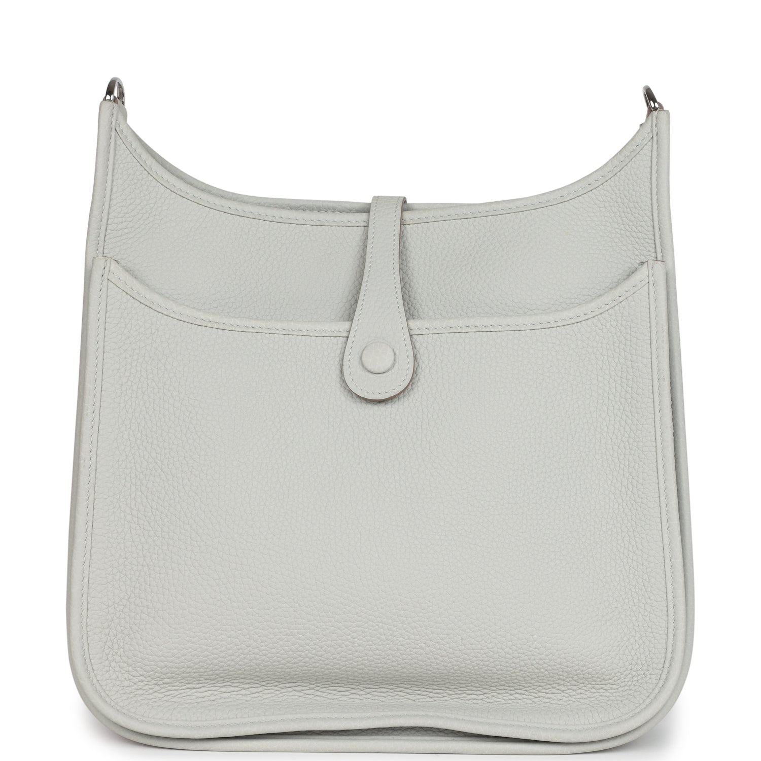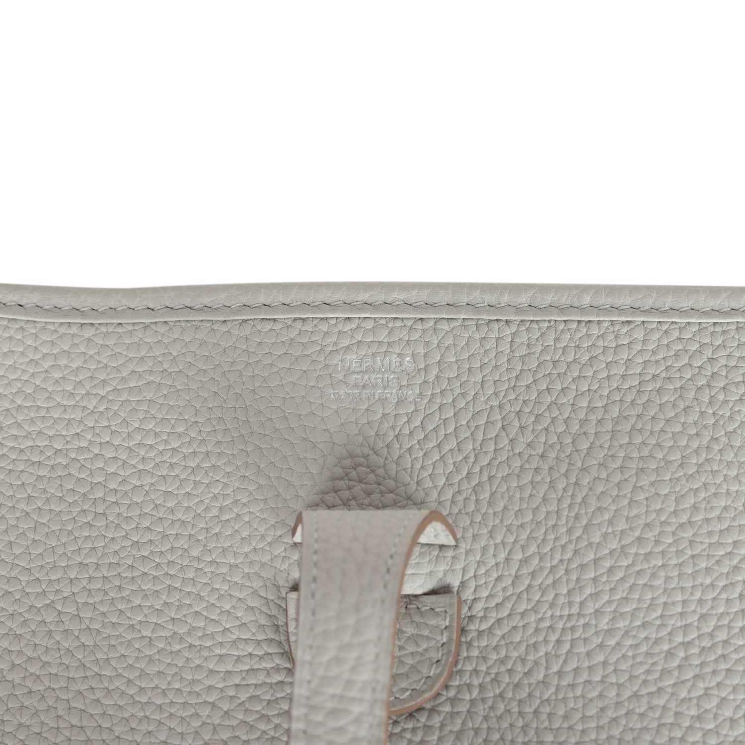 This Evelyne is in Gris Perle clemence leather with palladium hardware and has tonal stitching, pull tab top closure and Gris Perle removable canvas and leather shoulder/crossbody strap.