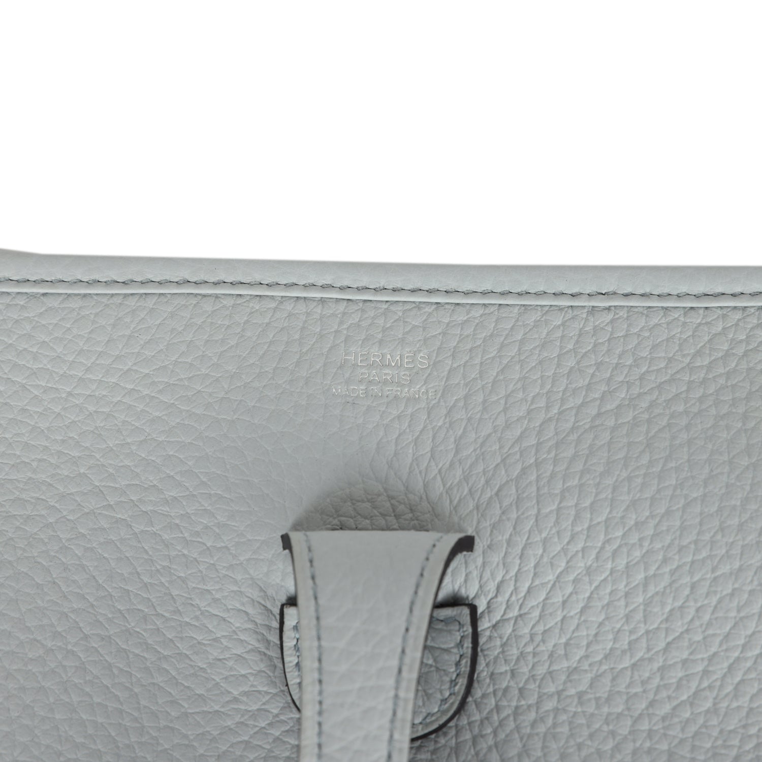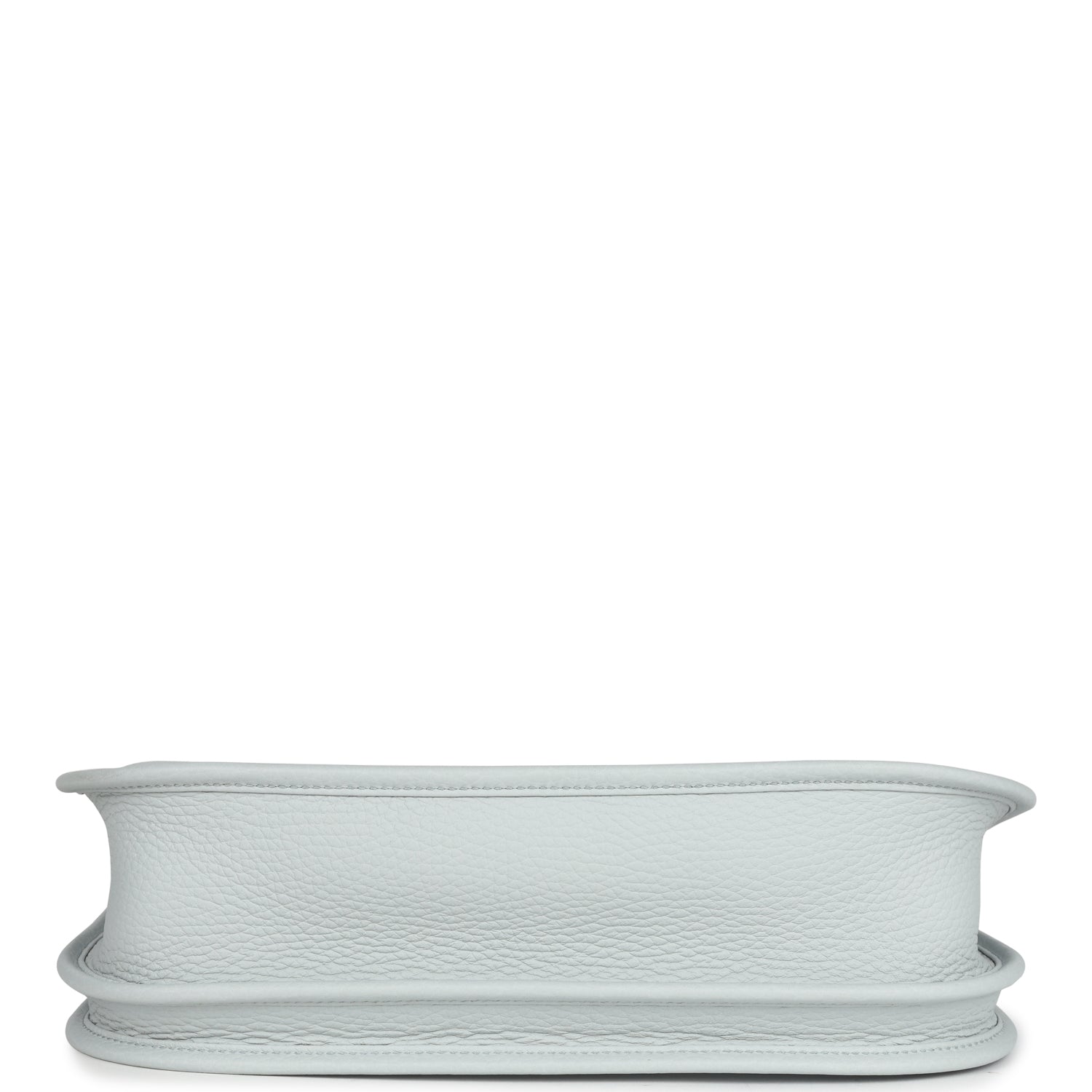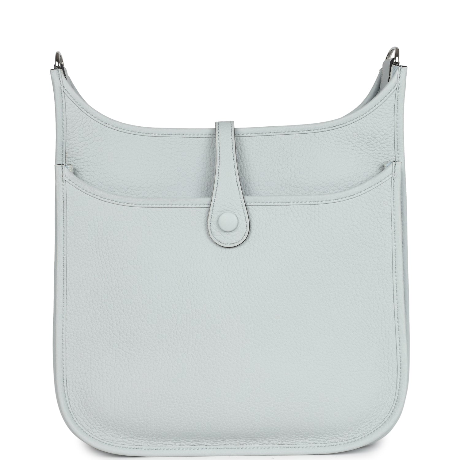 This Evelyne is in Bleu Pale clemence leather with palladium hardware and has tonal stitching, pull tab top closure and Bleu Pale removable canvas and leather shoulder/crossbody strap.