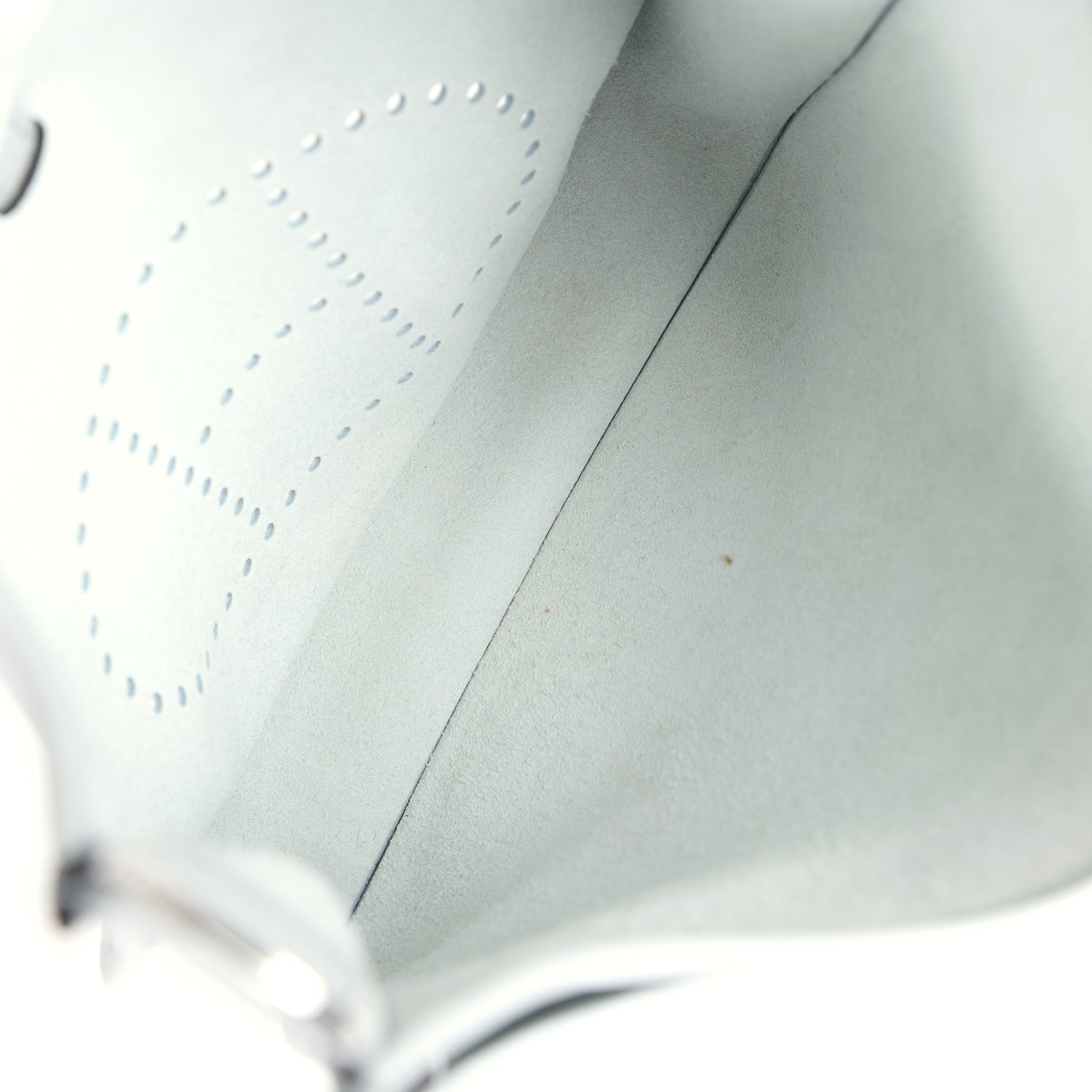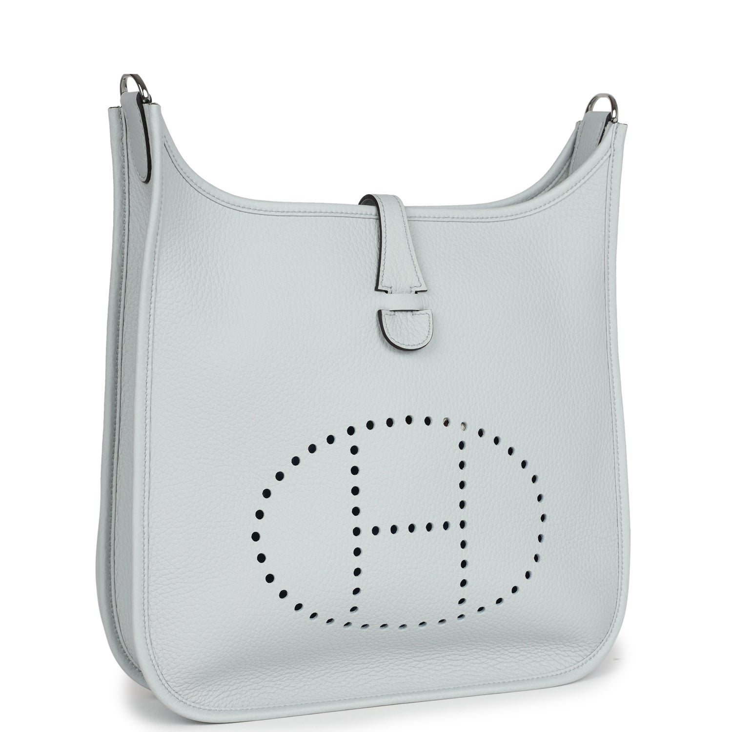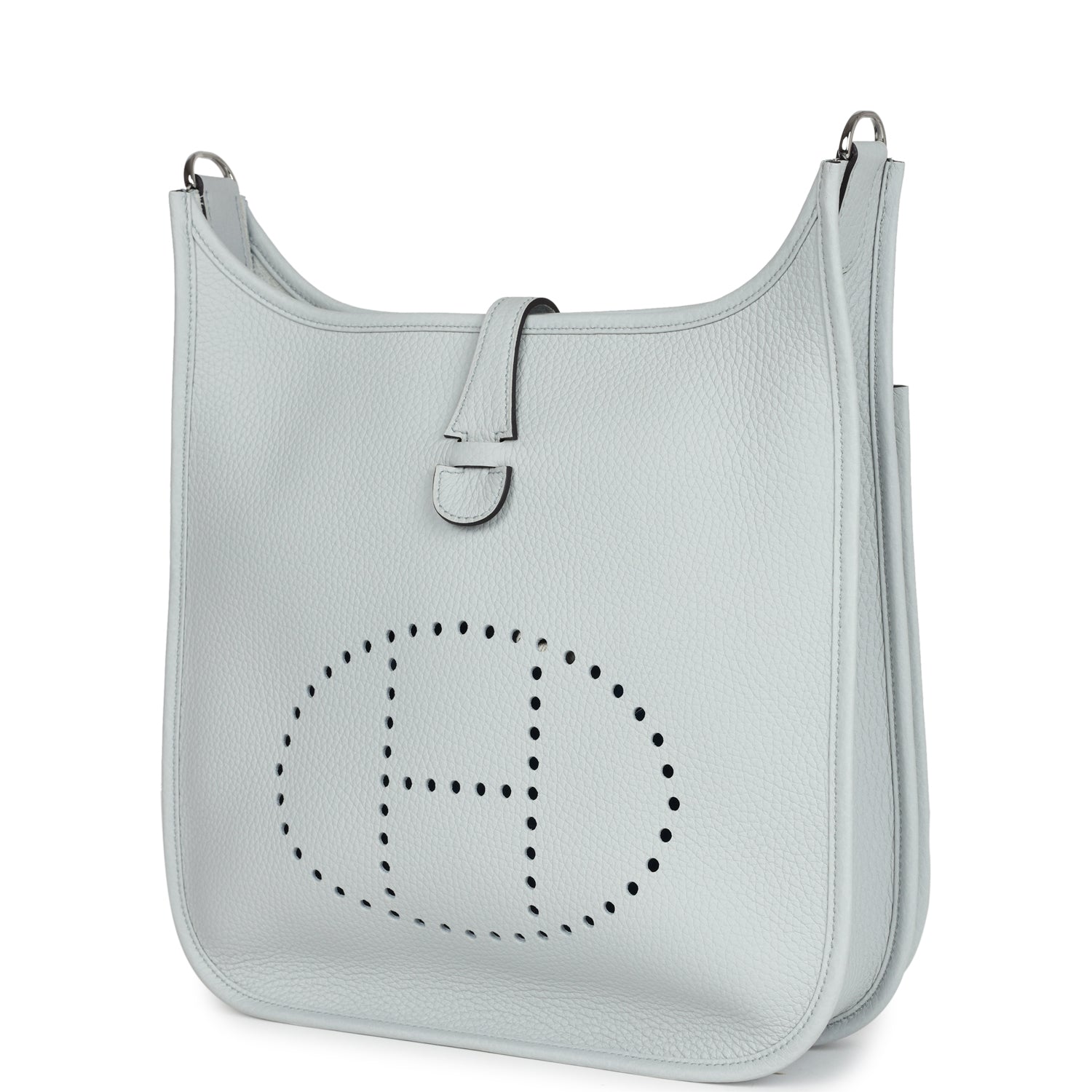 This Evelyne is in Bleu Pale clemence leather with palladium hardware and has tonal stitching, pull tab top closure and Bleu Pale removable canvas and leather shoulder/crossbody strap.