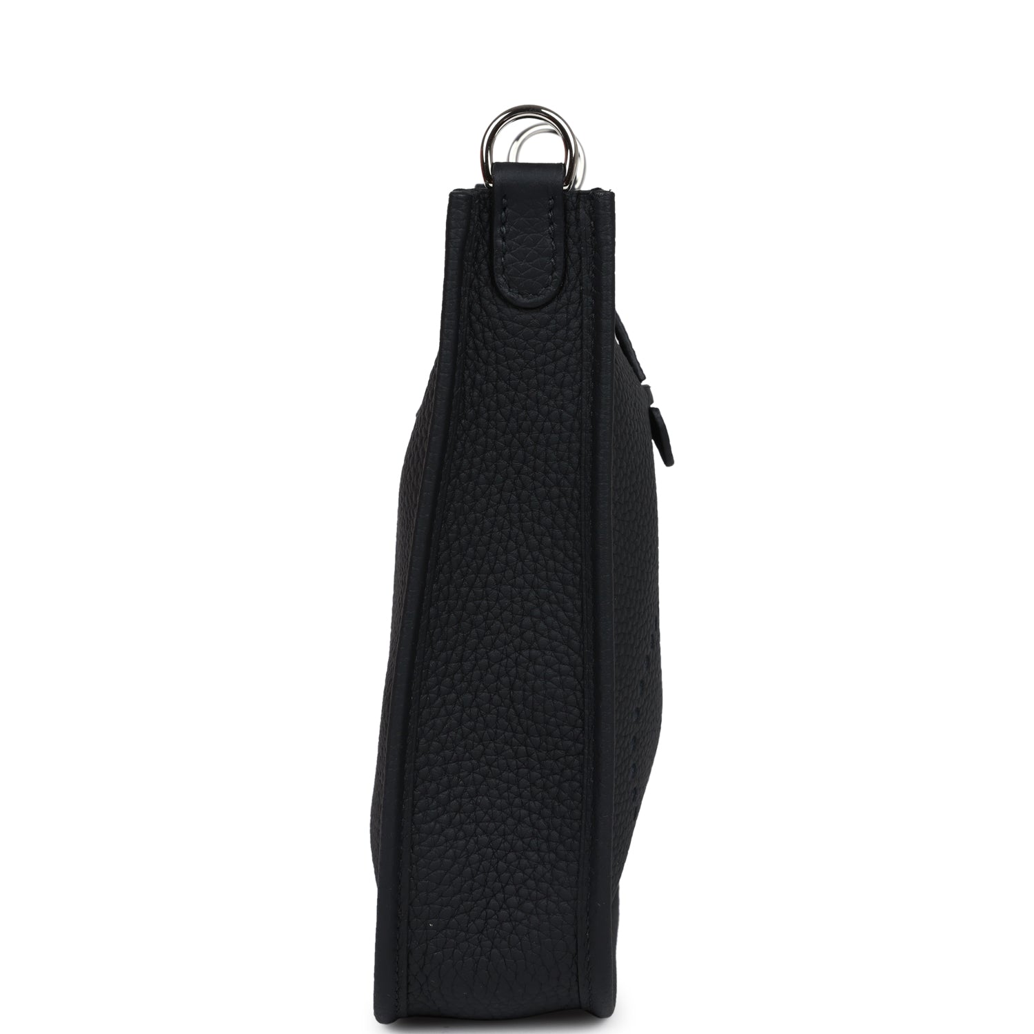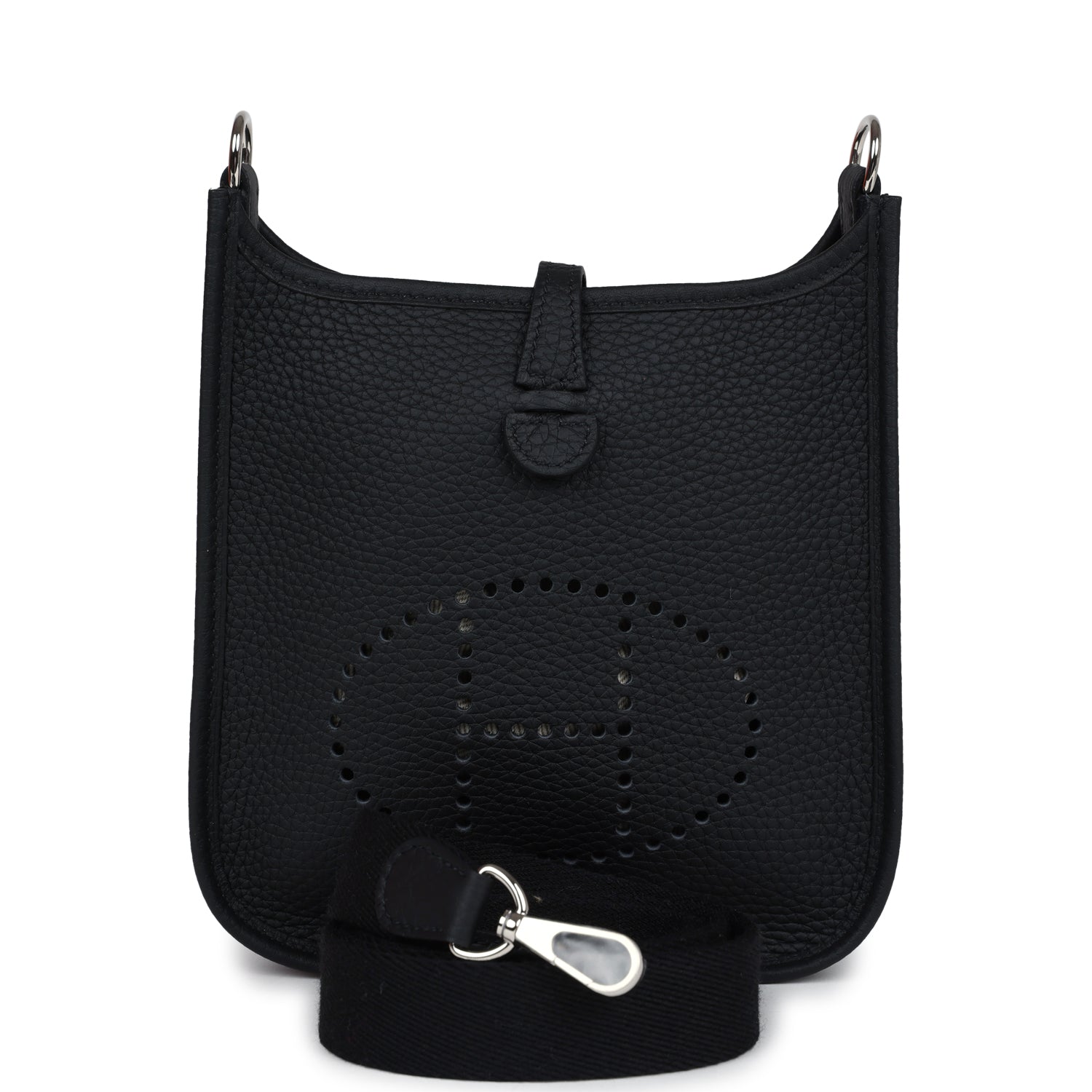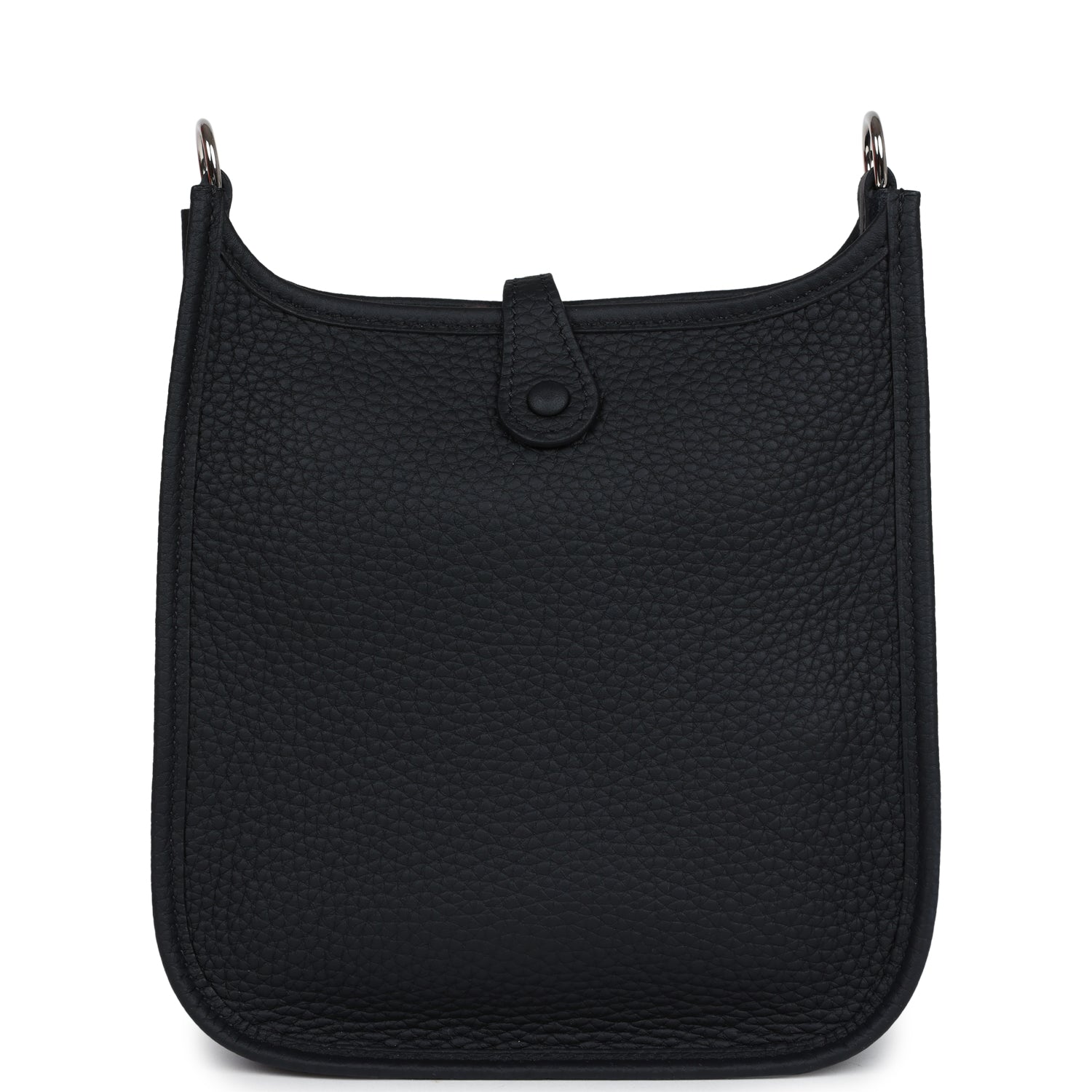 This Evelyne TPM is in Black clemence leather with palladium hardware and features tonal stitching stitching, pull tab top closure and a removable Black canvas and leather shoulder/crossbody strap.
