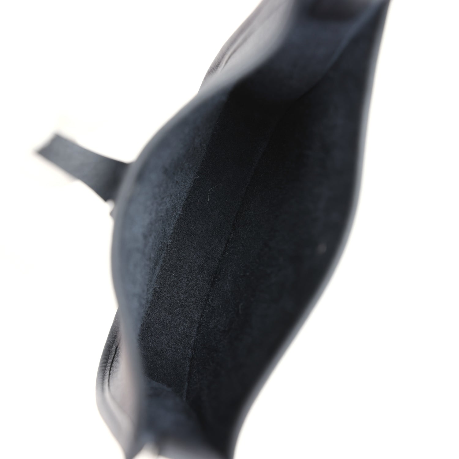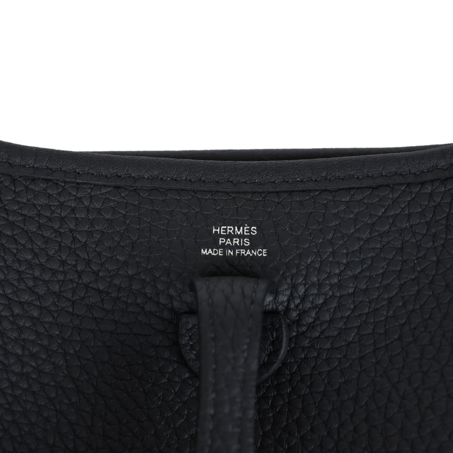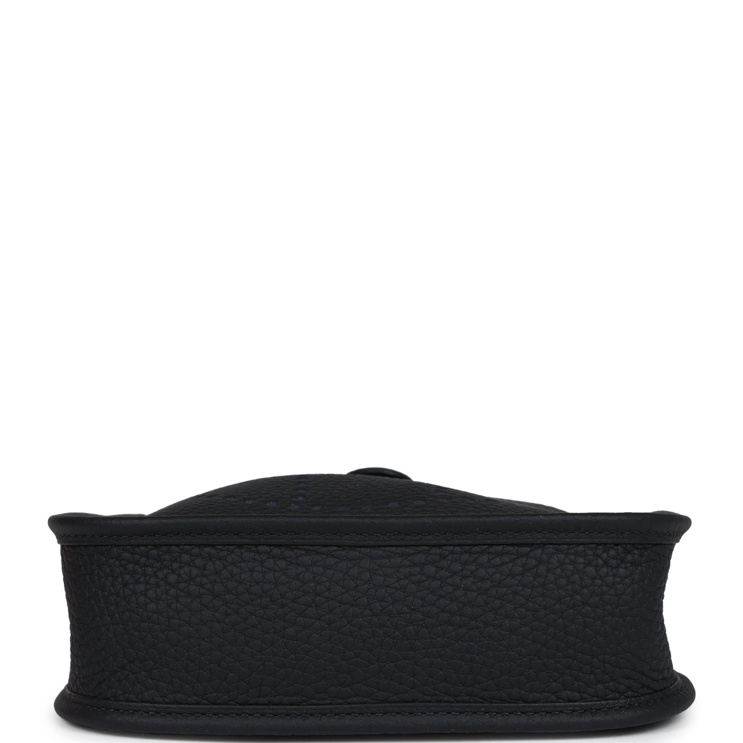 This Evelyne TPM is in Black clemence leather with palladium hardware and features tonal stitching stitching, pull tab top closure and a removable Black canvas and leather shoulder/crossbody strap.