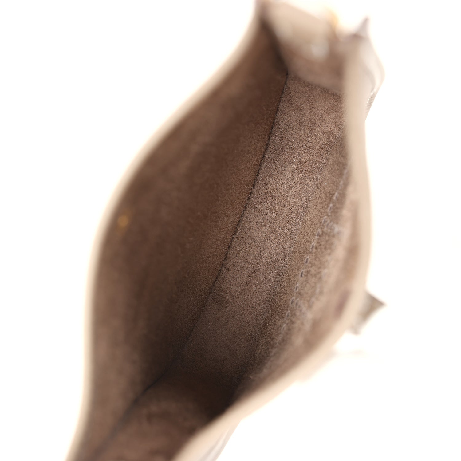 This Evelyne TPM is in Etoupe clemence leather with gold hardware and has contrast stitching, pull tab top closure and a removable canvas and leather shoulder/crossbody strap.