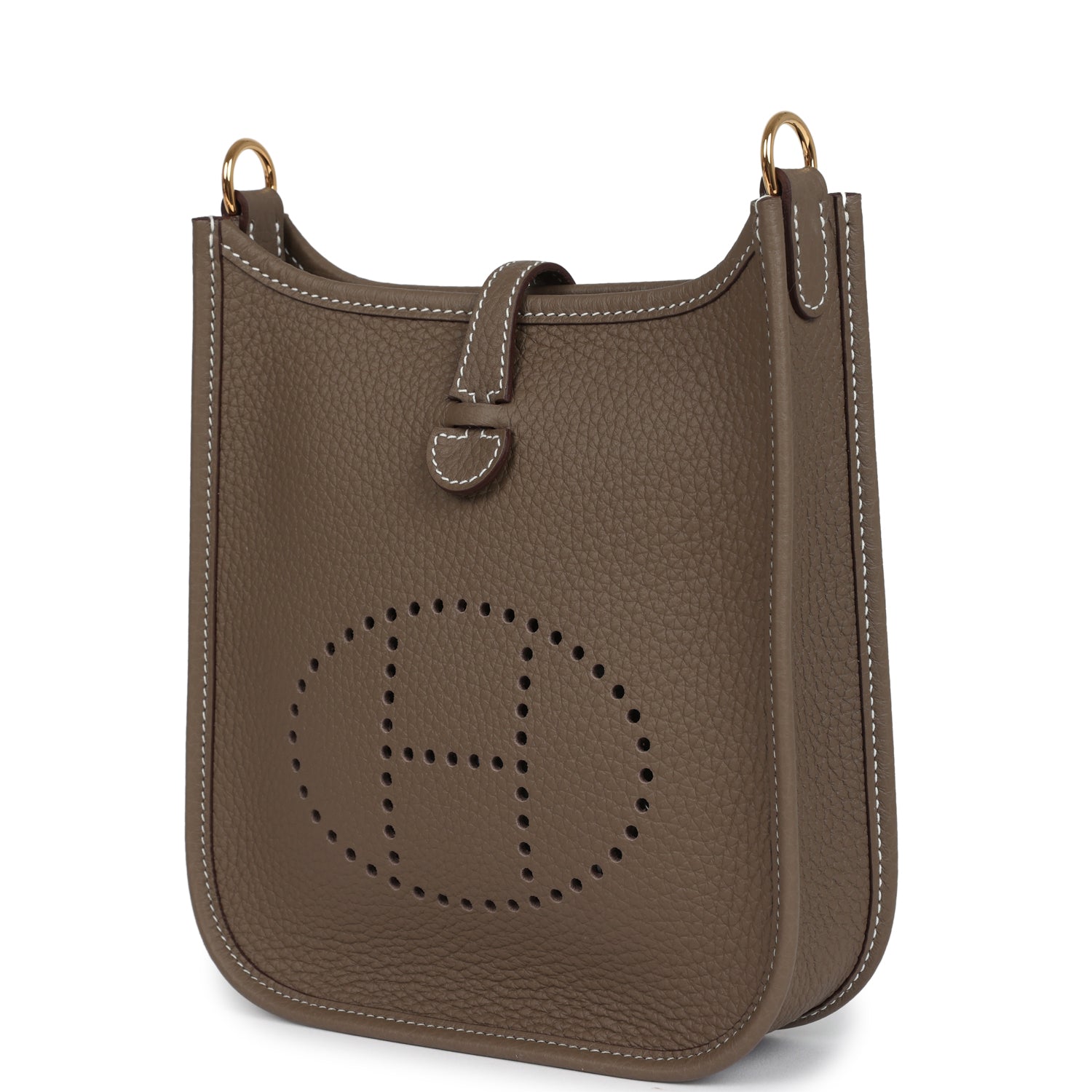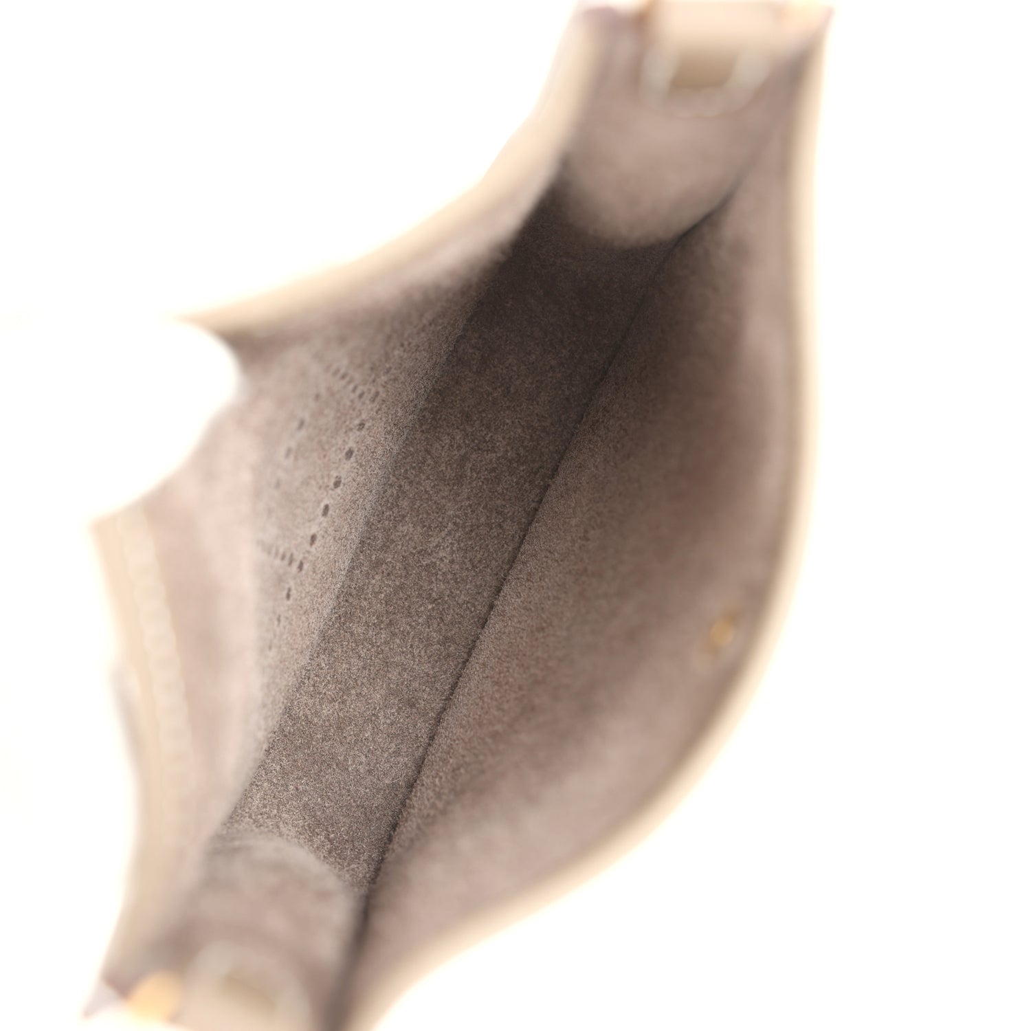 This Evelyne TPM is in Etoupe clemence leather with gold hardware and has contrast stitching, pull tab top closure and a removable canvas and leather shoulder/crossbody strap.