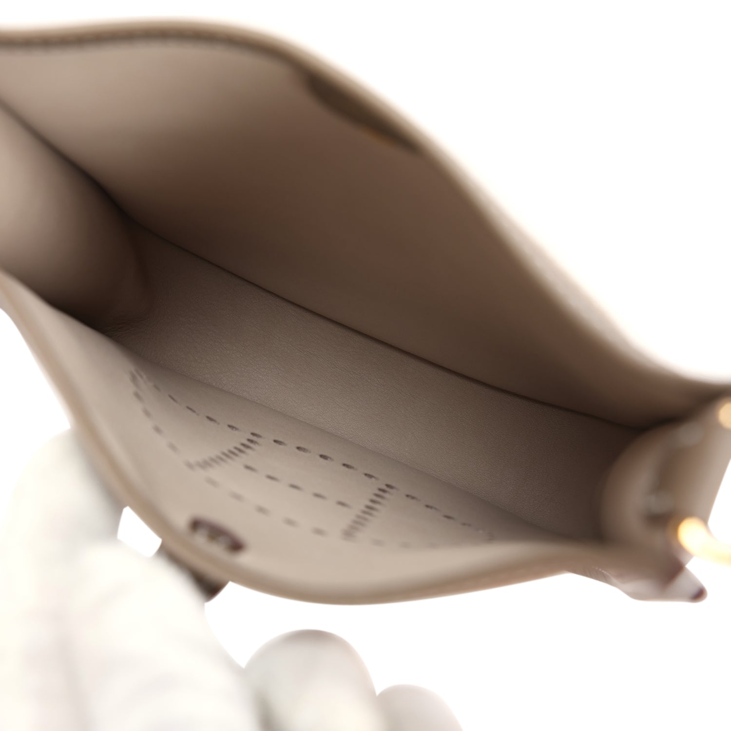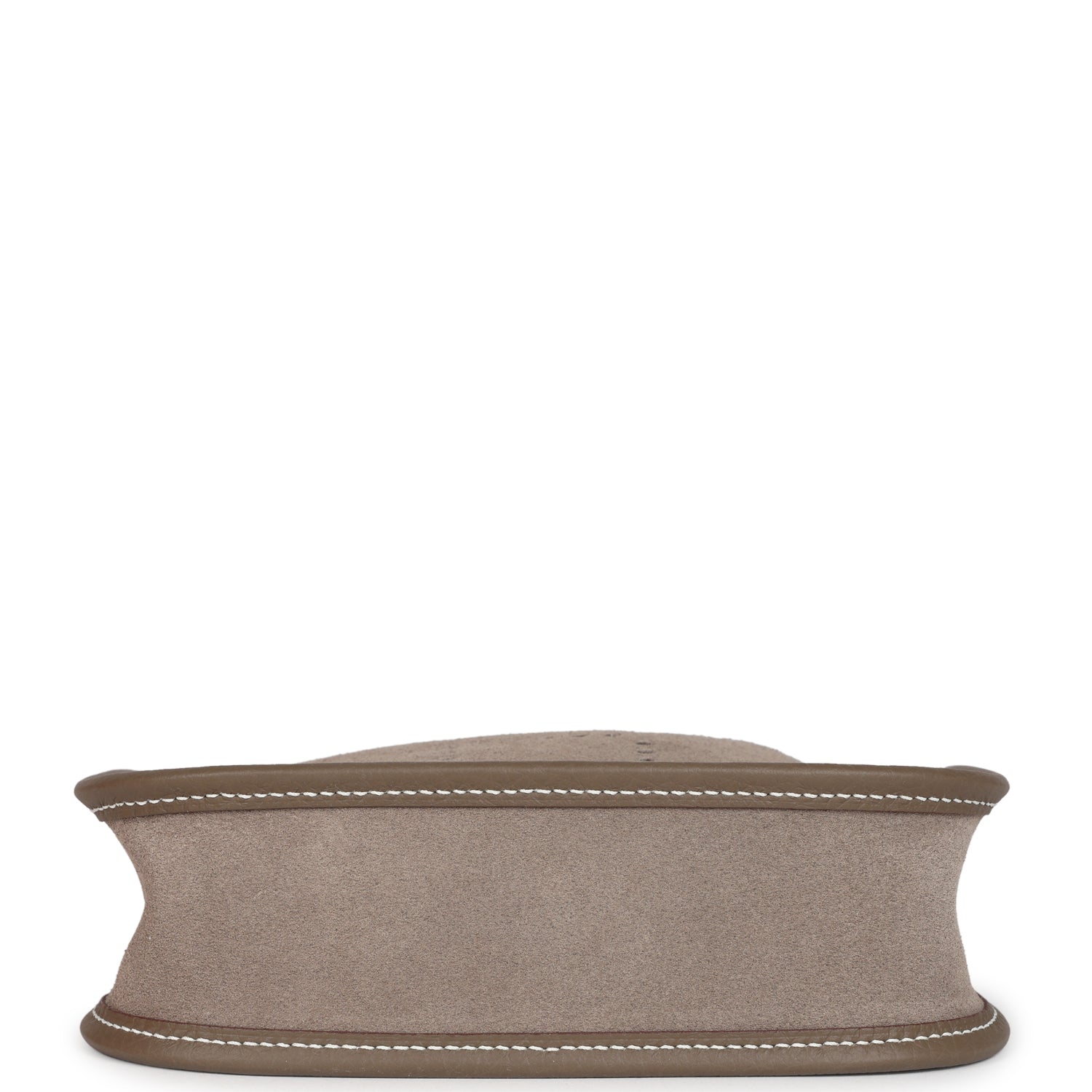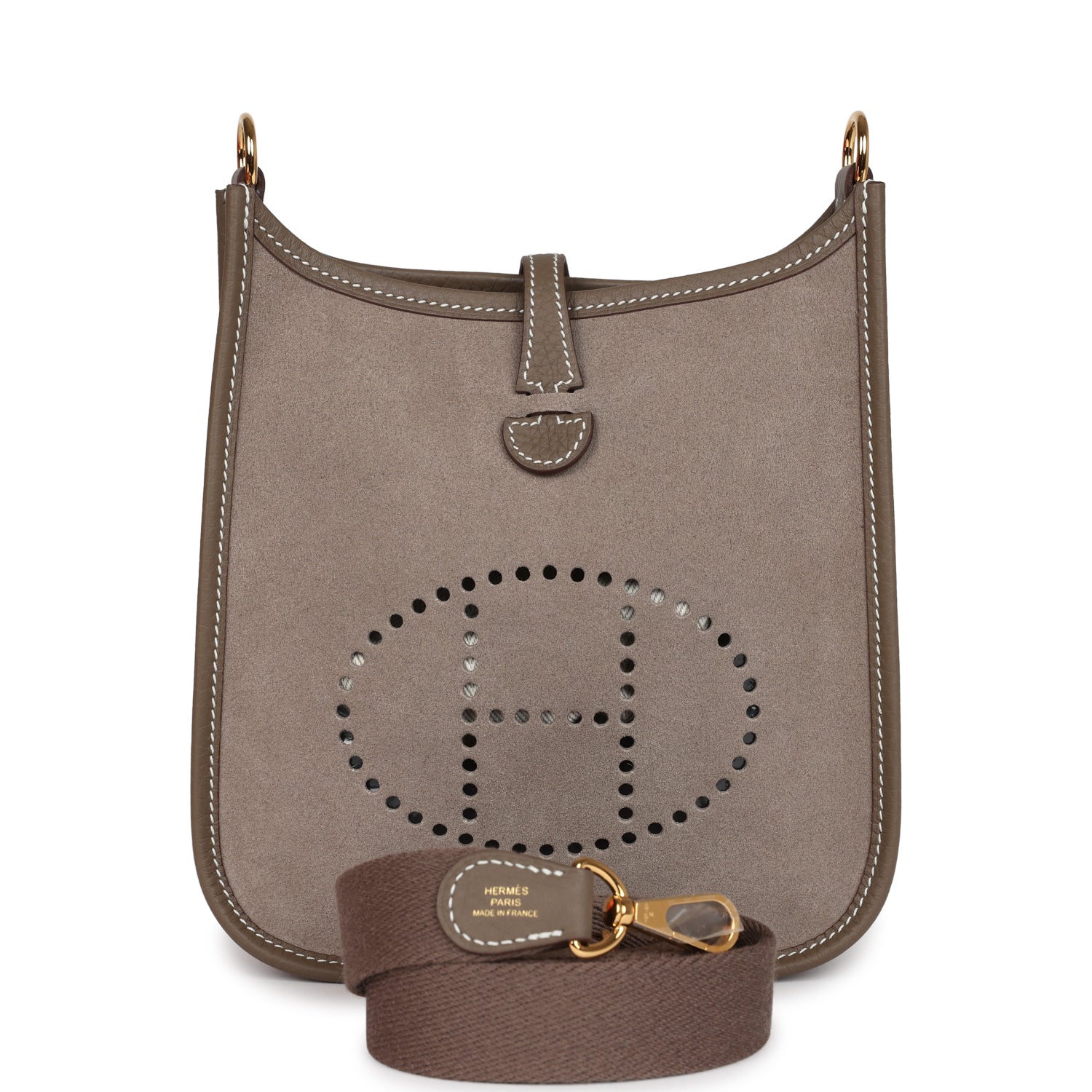 This Evelyne TPM is in Etoupe and Gris Caillou Grizzly sNewe leather and Taurillon clemence leather with contrast stitching, gold hardware, large perforated H in circle (front), pull tab top snap closure and removable Etoupe canvas and leather shoulder/crossbody strap.