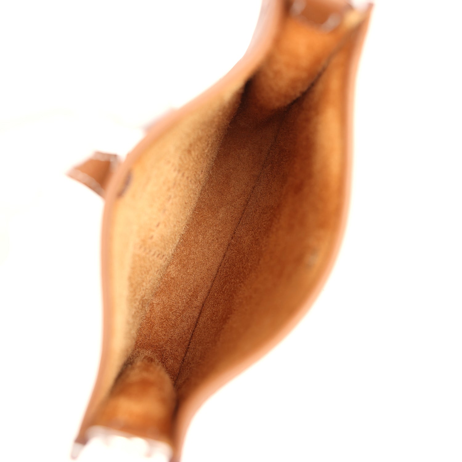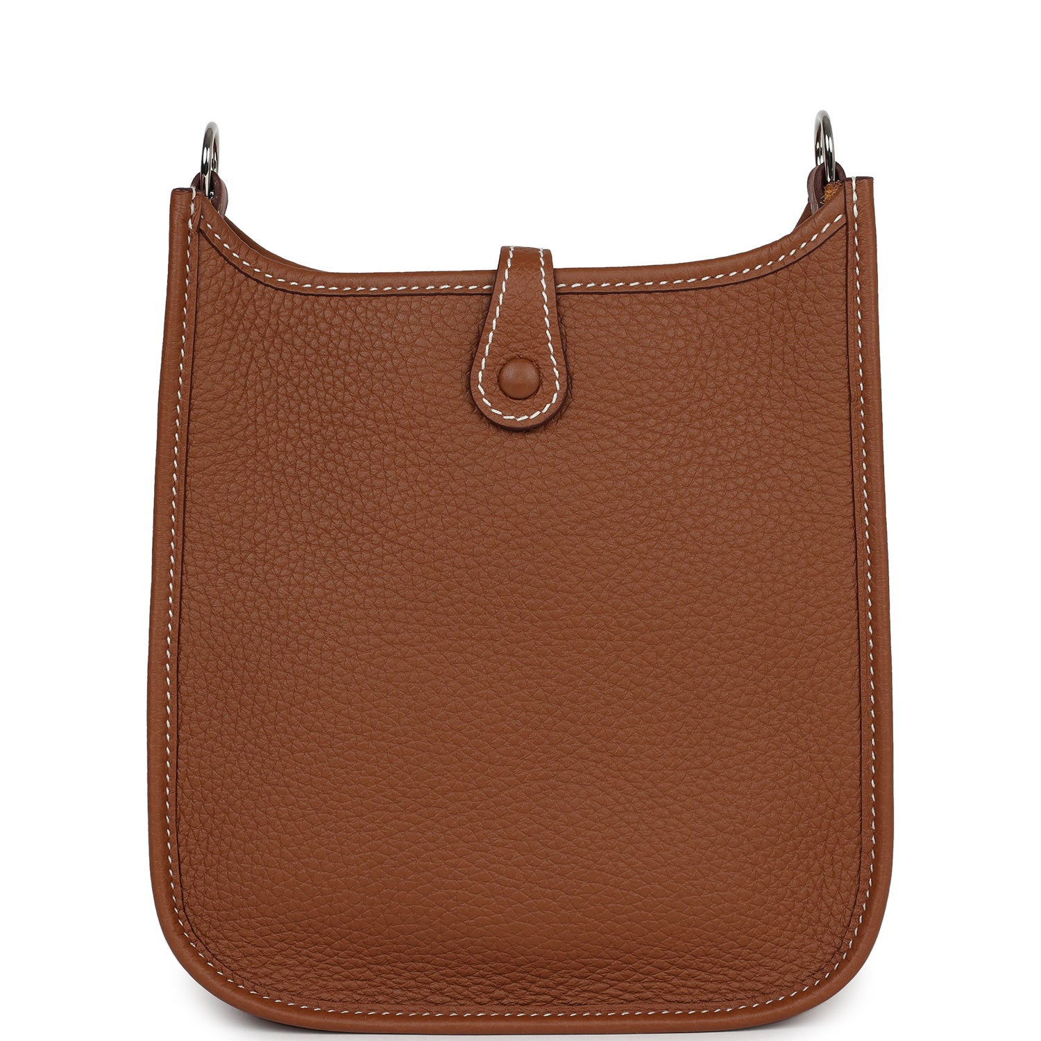 This Evelyne TPM is in Gold clemence leather with palladium hardware and features contrast stitching stitching, pull tab top closure and a removable Gold canvas and leather shoulder/crossbody strap.