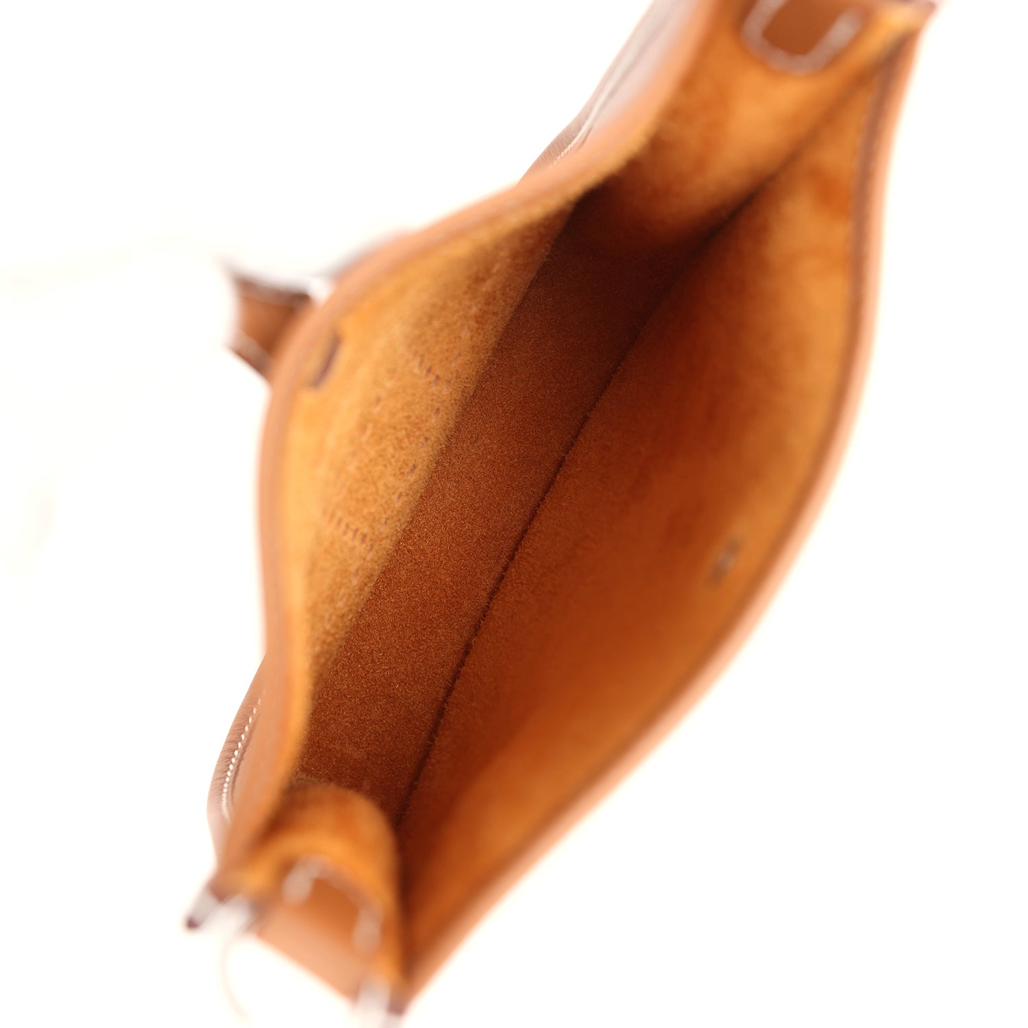 This Evelyne TPM is in Gold clemence leather with palladium hardware and features contrast stitching stitching, pull tab top closure and a removable Gold canvas and leather shoulder/crossbody strap.