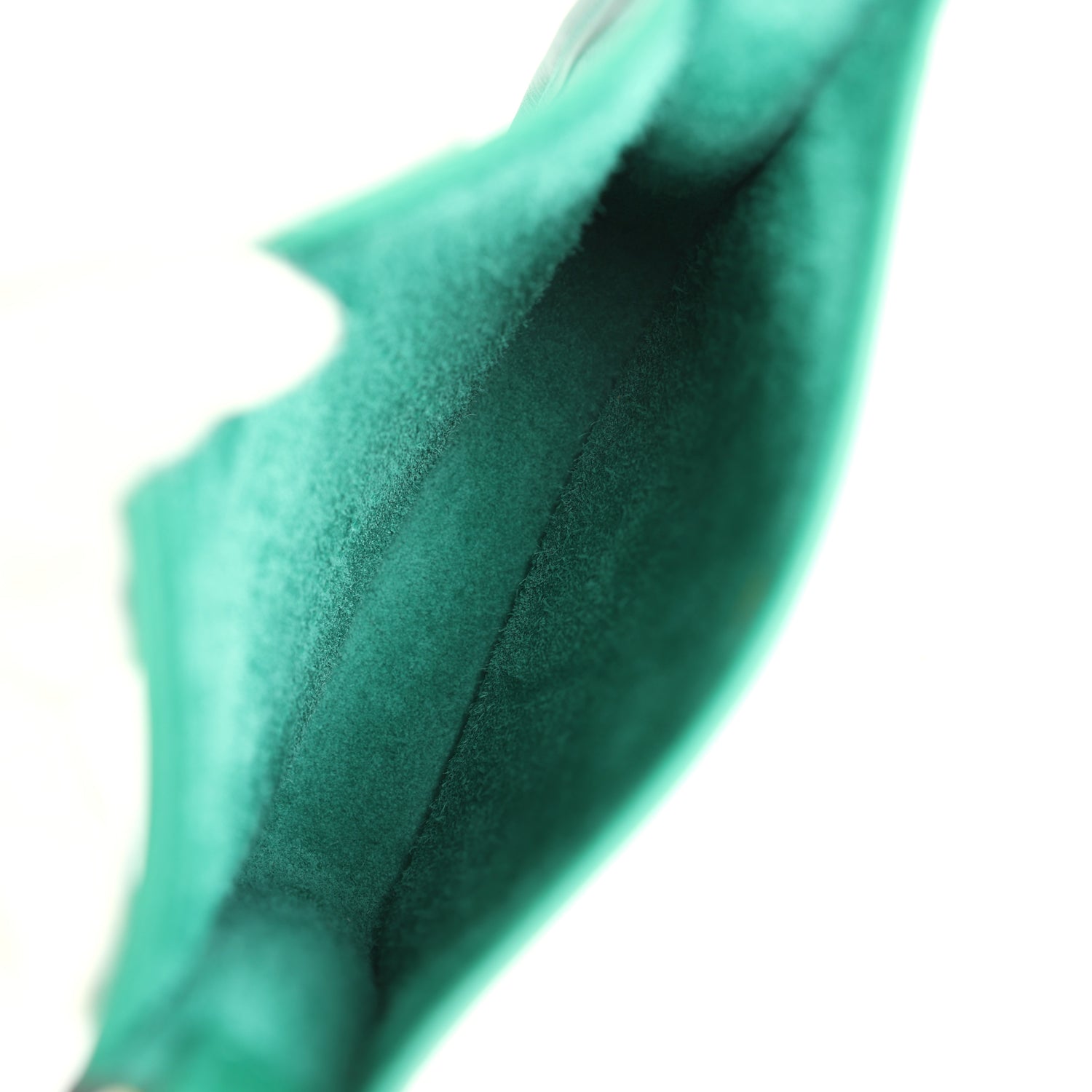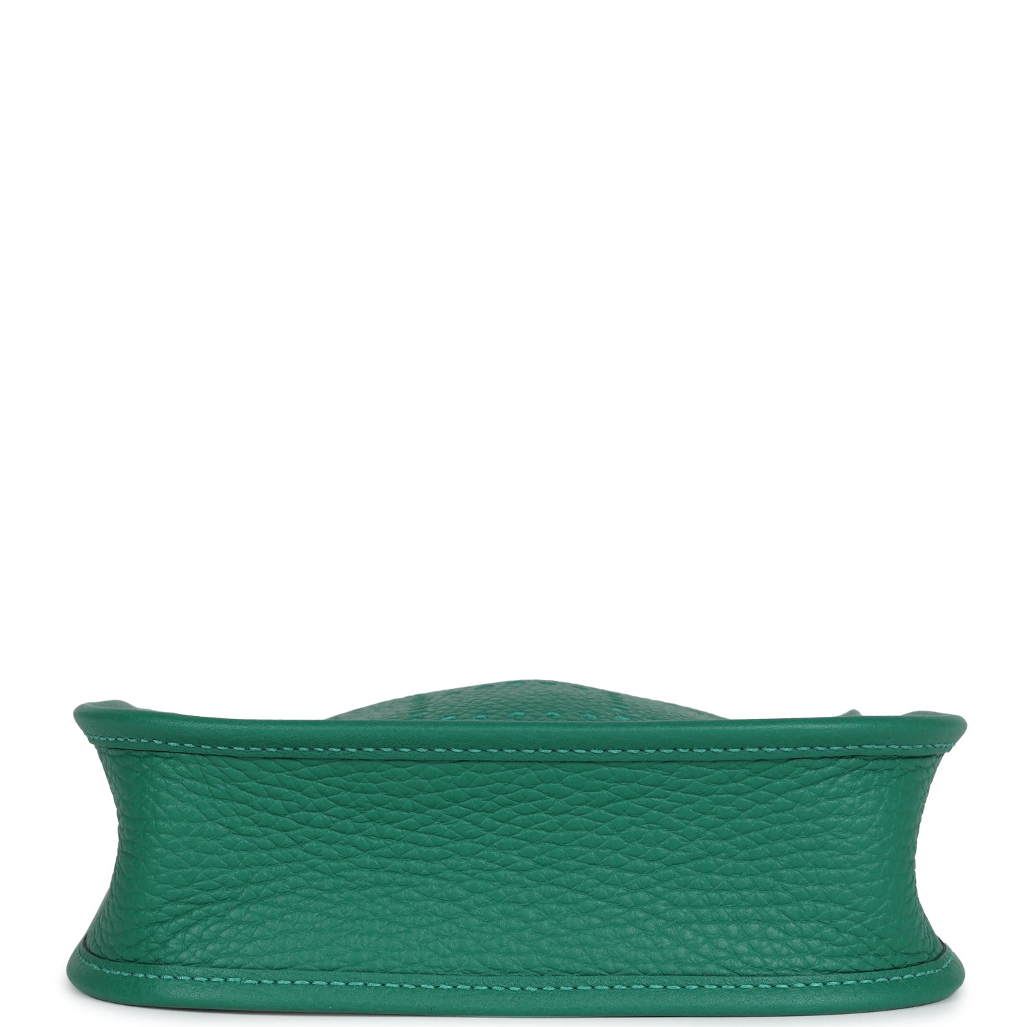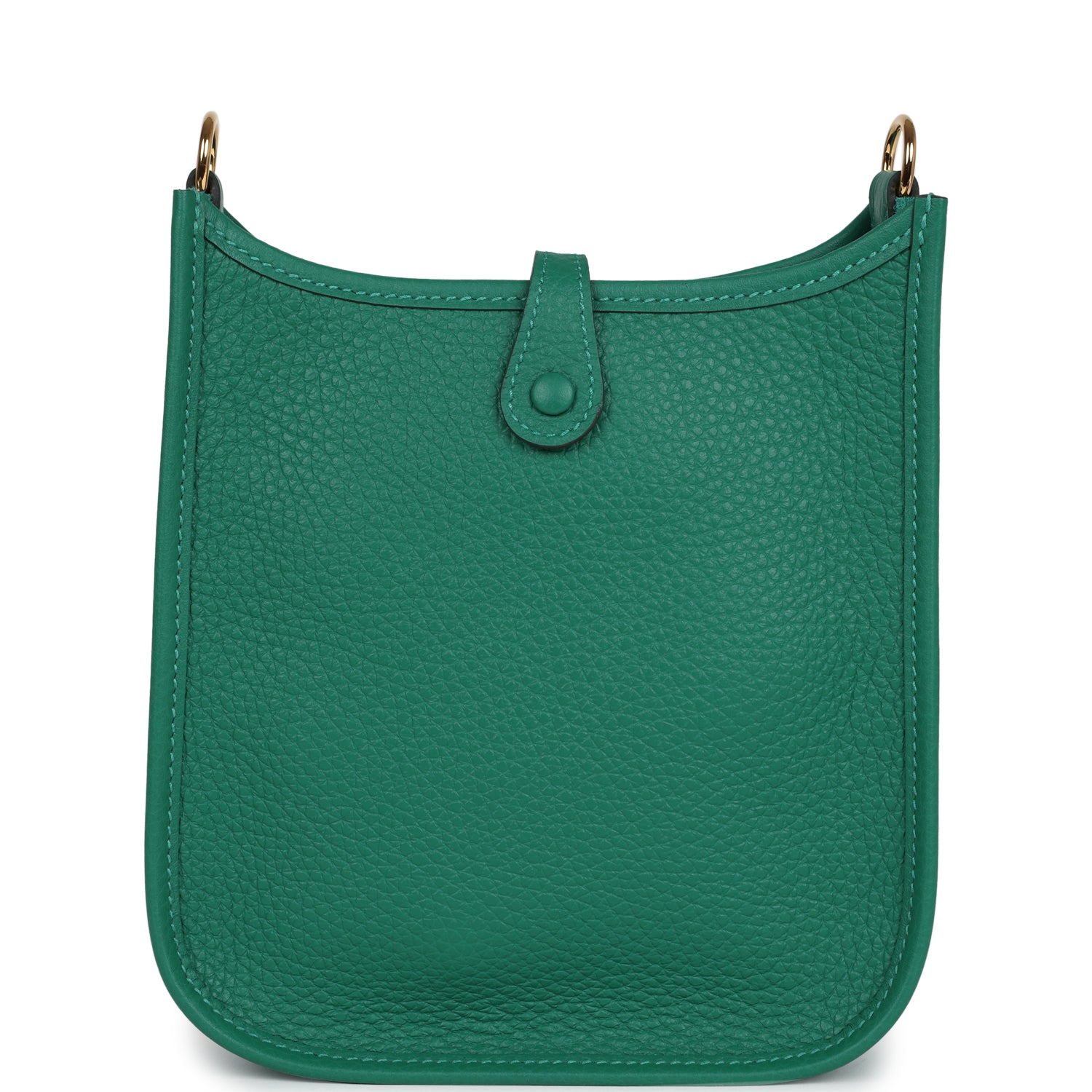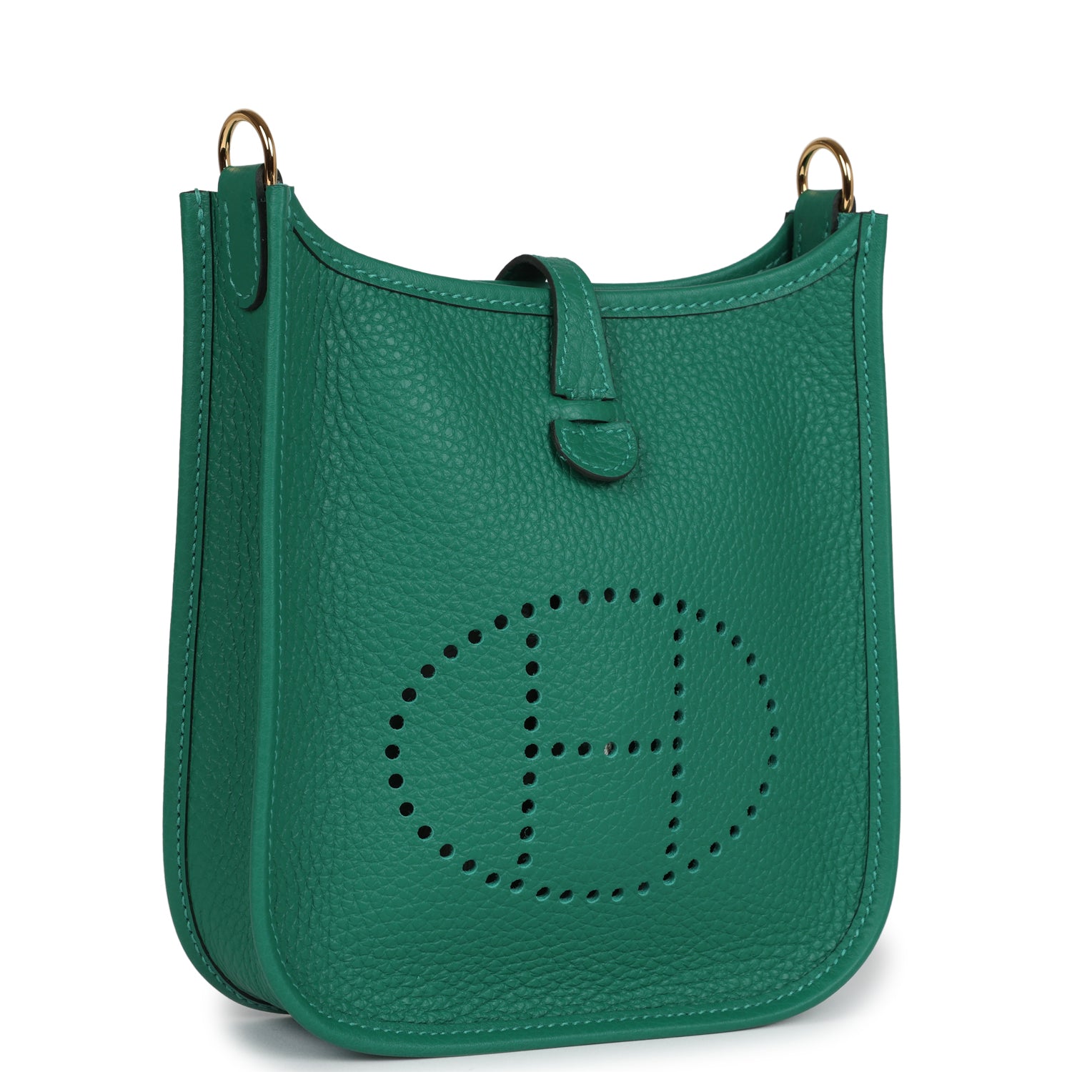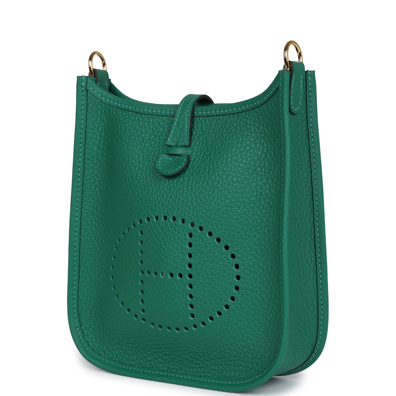 This Evelyne TPM is in Vert Vertigo clemence leather with gold hardware and features tonal stitching, large perforated H in circle (front), pull tab top closure and a matching removable canvas and leather shoulder/crossbody strap.