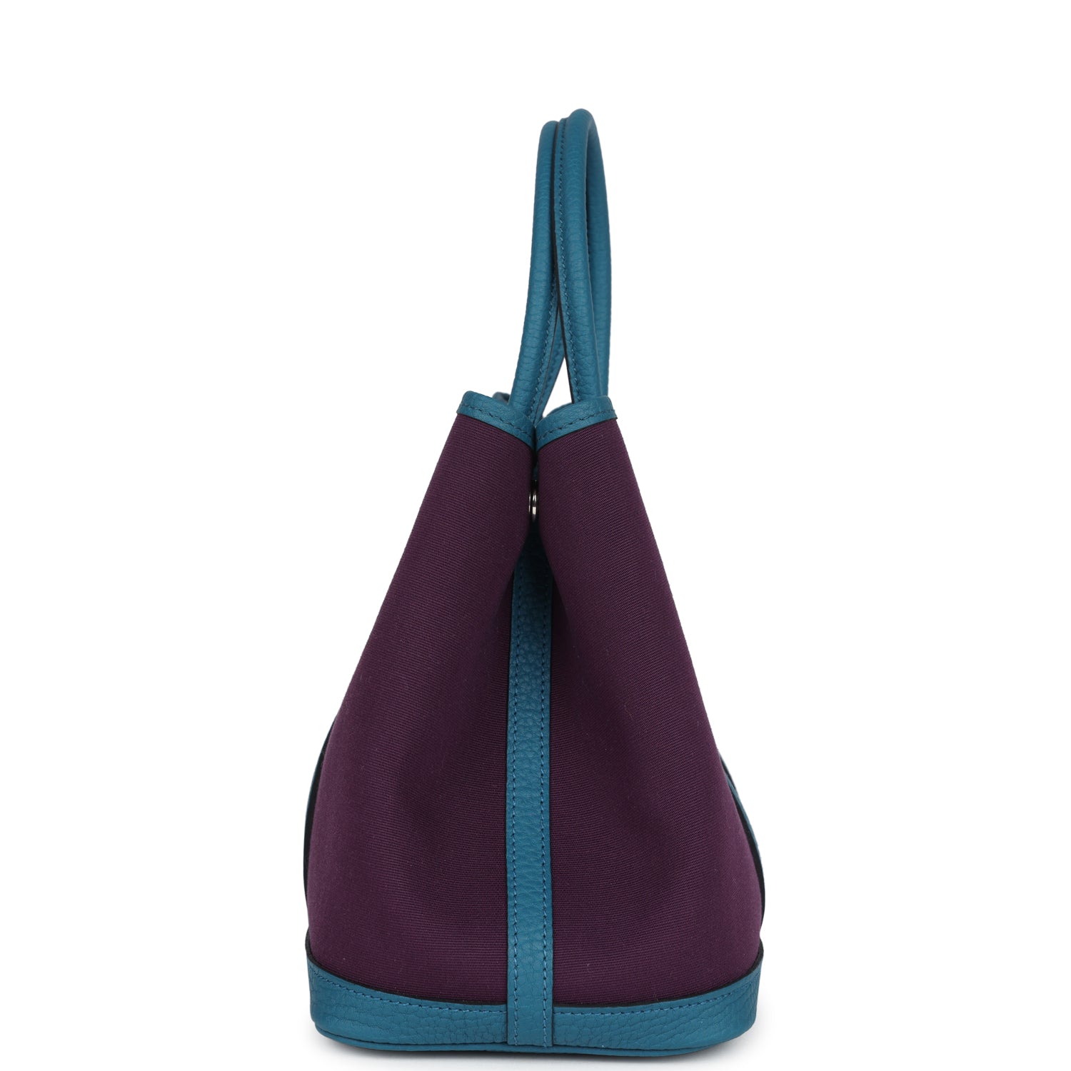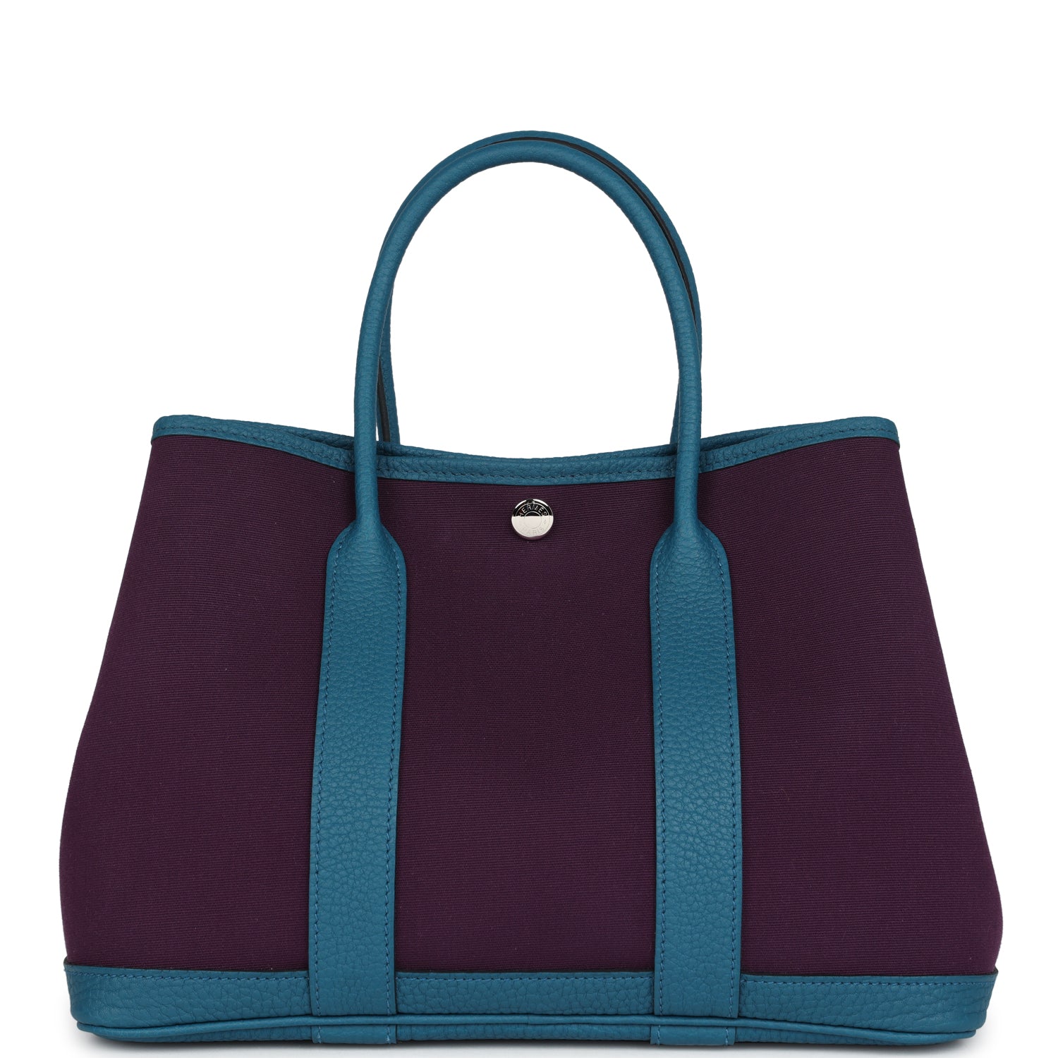 This Hermes Garden Party is in Cassis Toile H Canvas and Cobalt Negonda leather with palladium hardware, and features tonal stitching, one engraved palladium front snap closure with two snap closures on side to adjust bag width. This bag features two leather top handles.