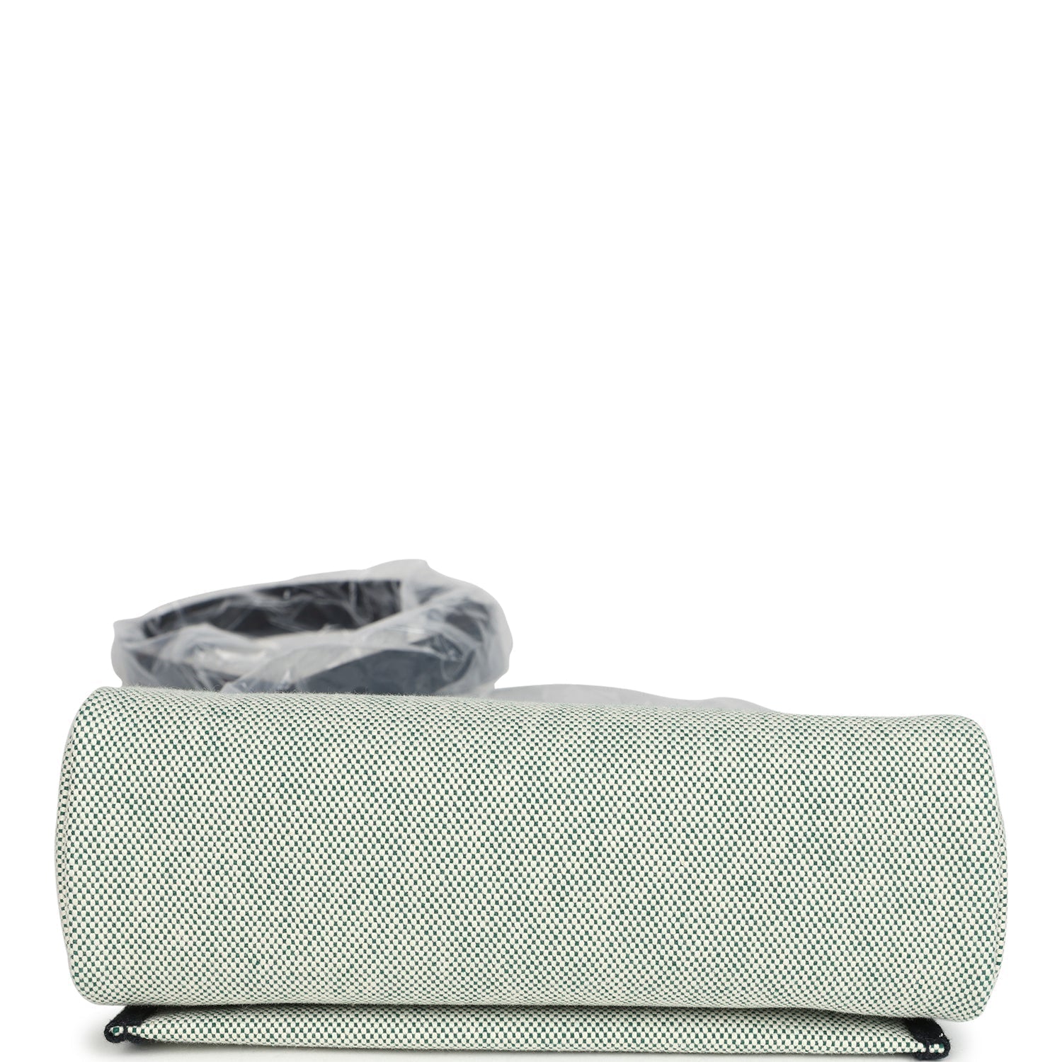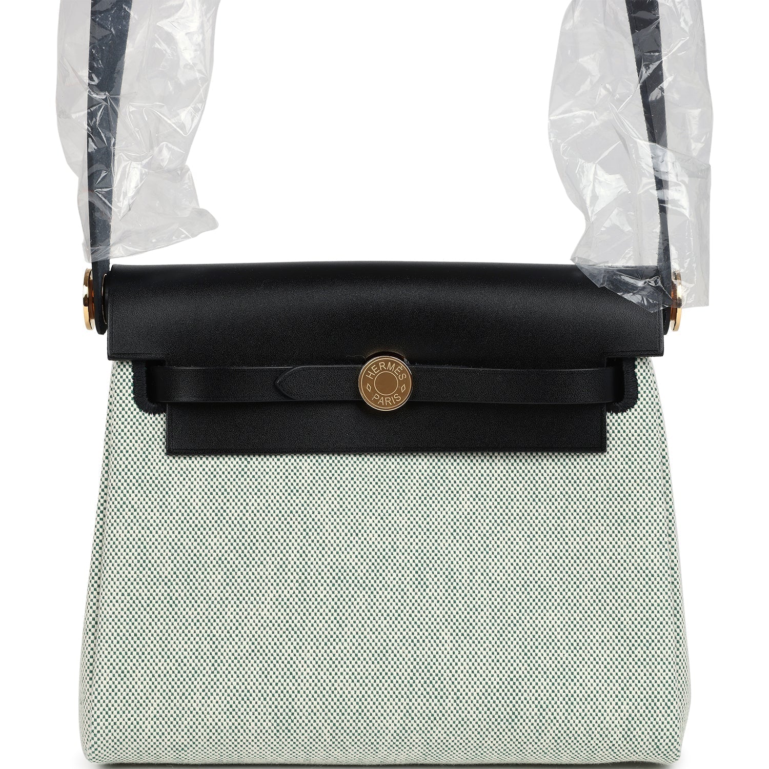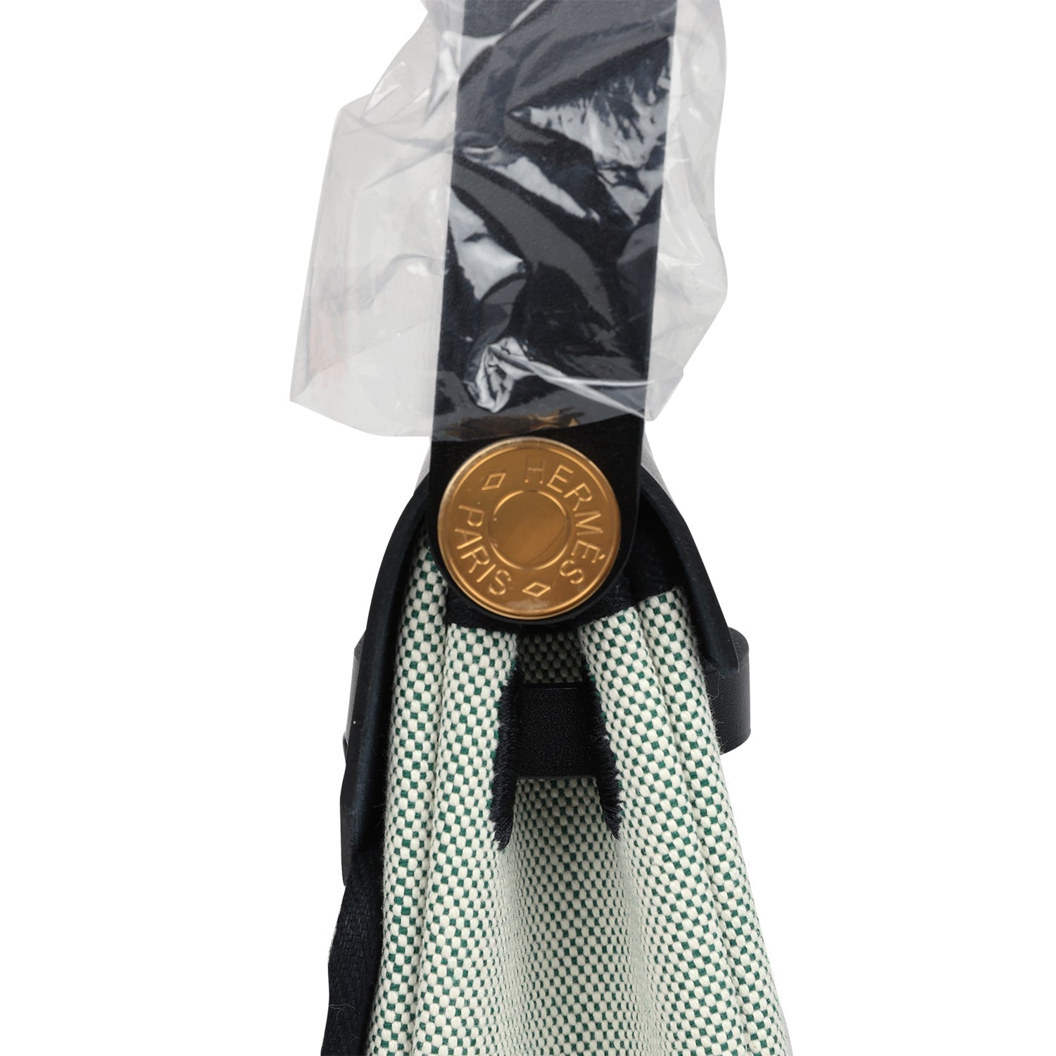 This Hermes Herbag Zip 20 Mini Ecru and Vert Moyen Toile H canvas and Black Vache Hunter leather with gold hardware has tonal stitching, front flap, two straps with center clou de selle closure, back zip pocket and black shoulder strap.