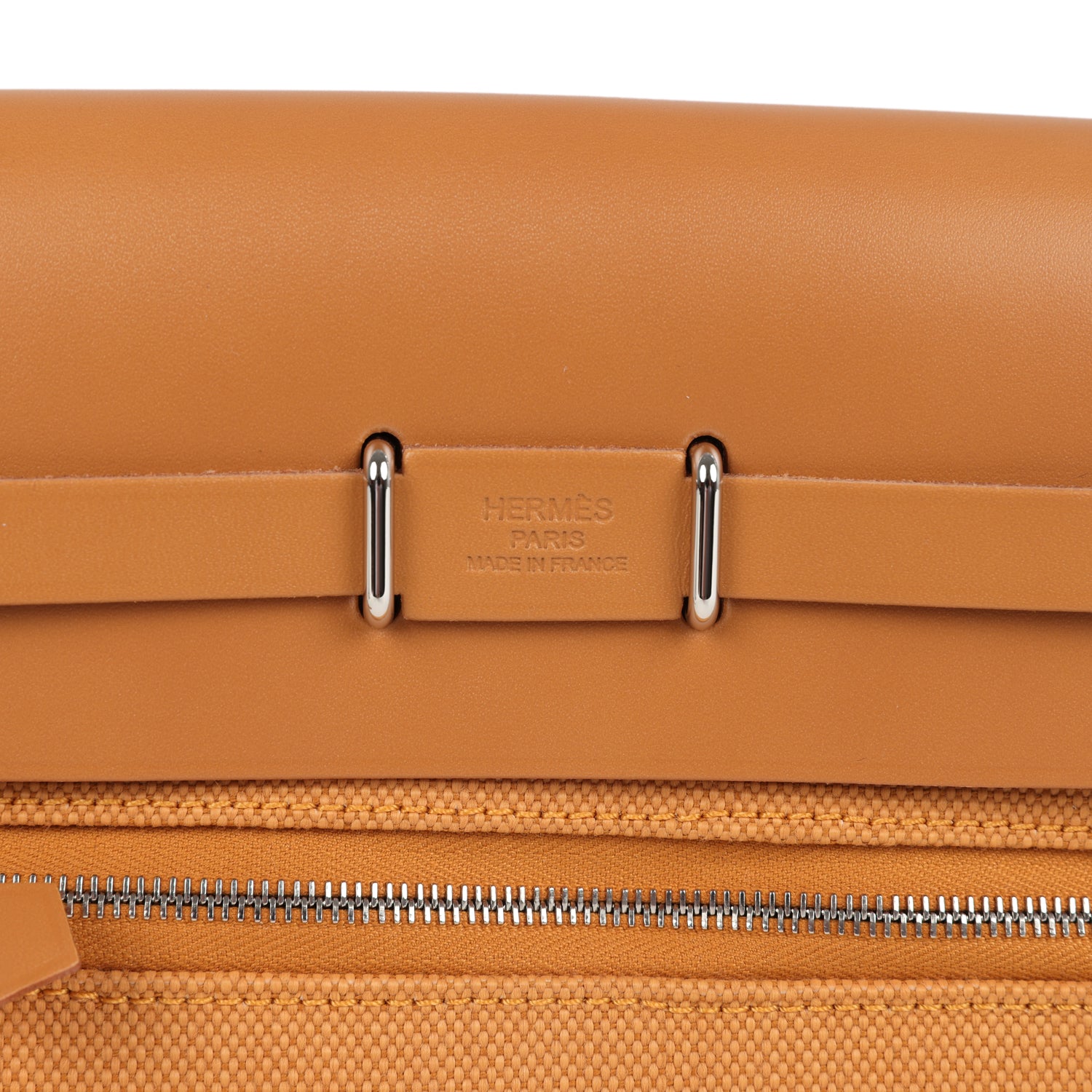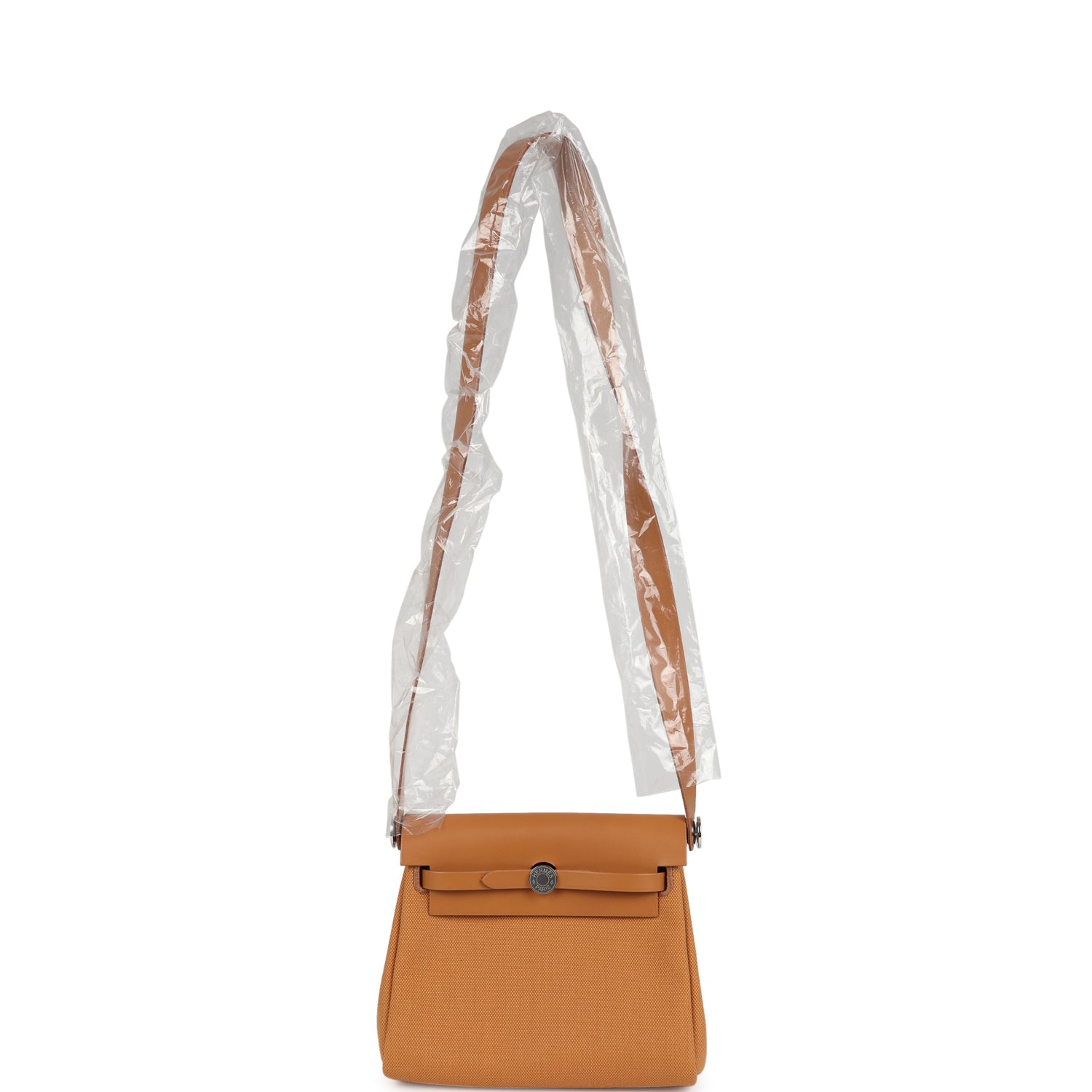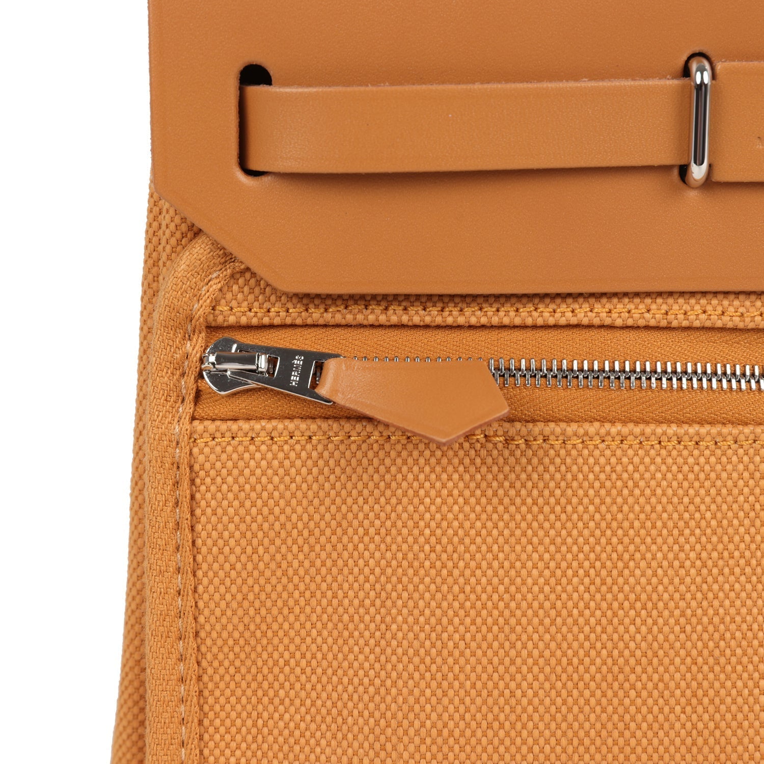 This Hermes Herbag Zip 20 Mini Naturel Sable Toile Militaire canvas and Naturel Sable Vache Hunter with palladium hardware has tonal stitching, front flap, two straps with center clou de selle closure, back zip pocket and black shoulder strap.