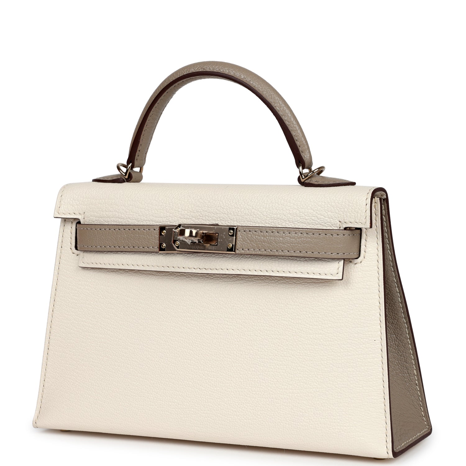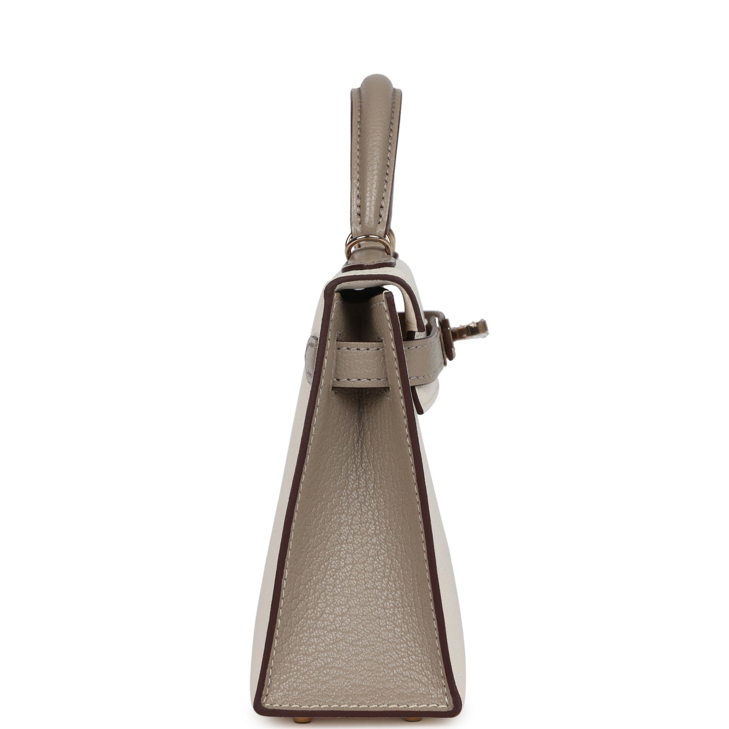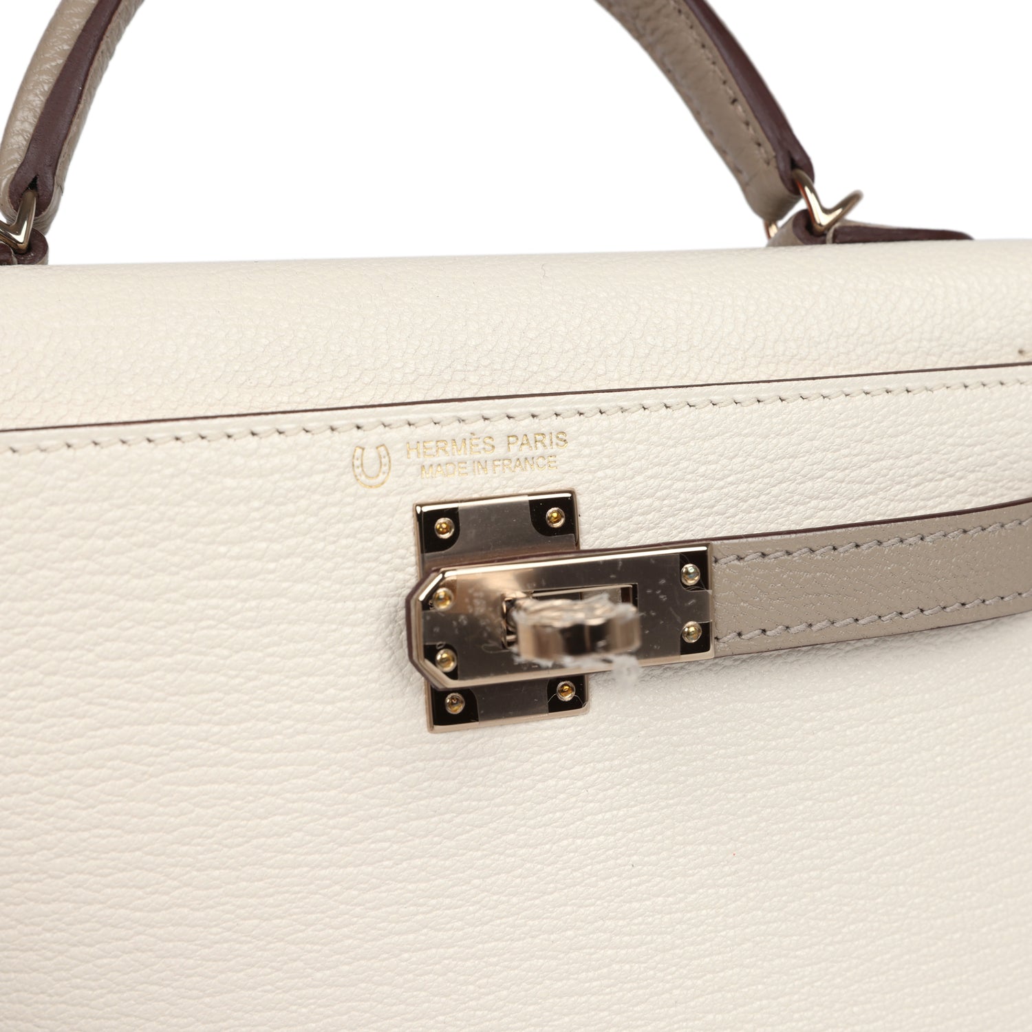 This Special Order Kelly, in the Sellier style, is in Nata and Gris Tourterelle chevre leather with permabrass hardware and features tonal stitching, front flap with two straps, front toggle closure, clochette with lock and two keys, and single rolled handles.