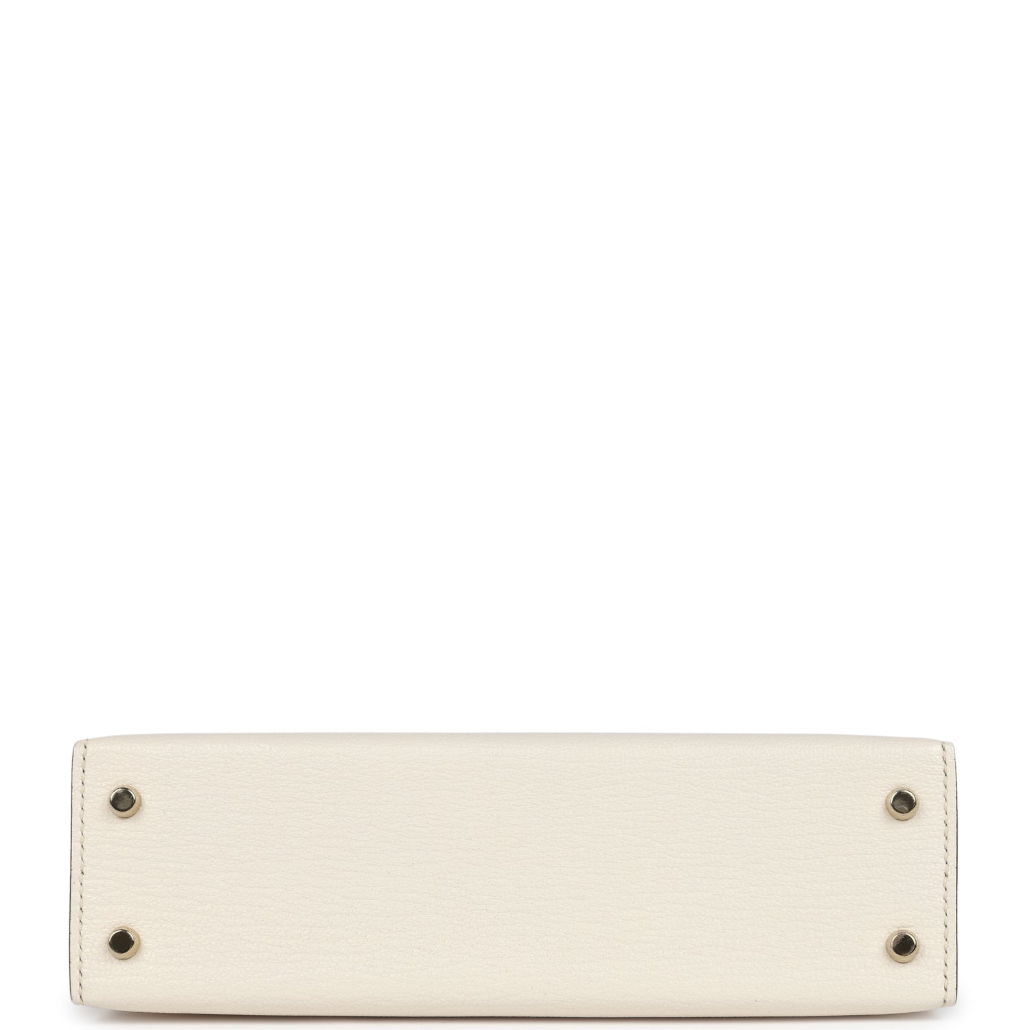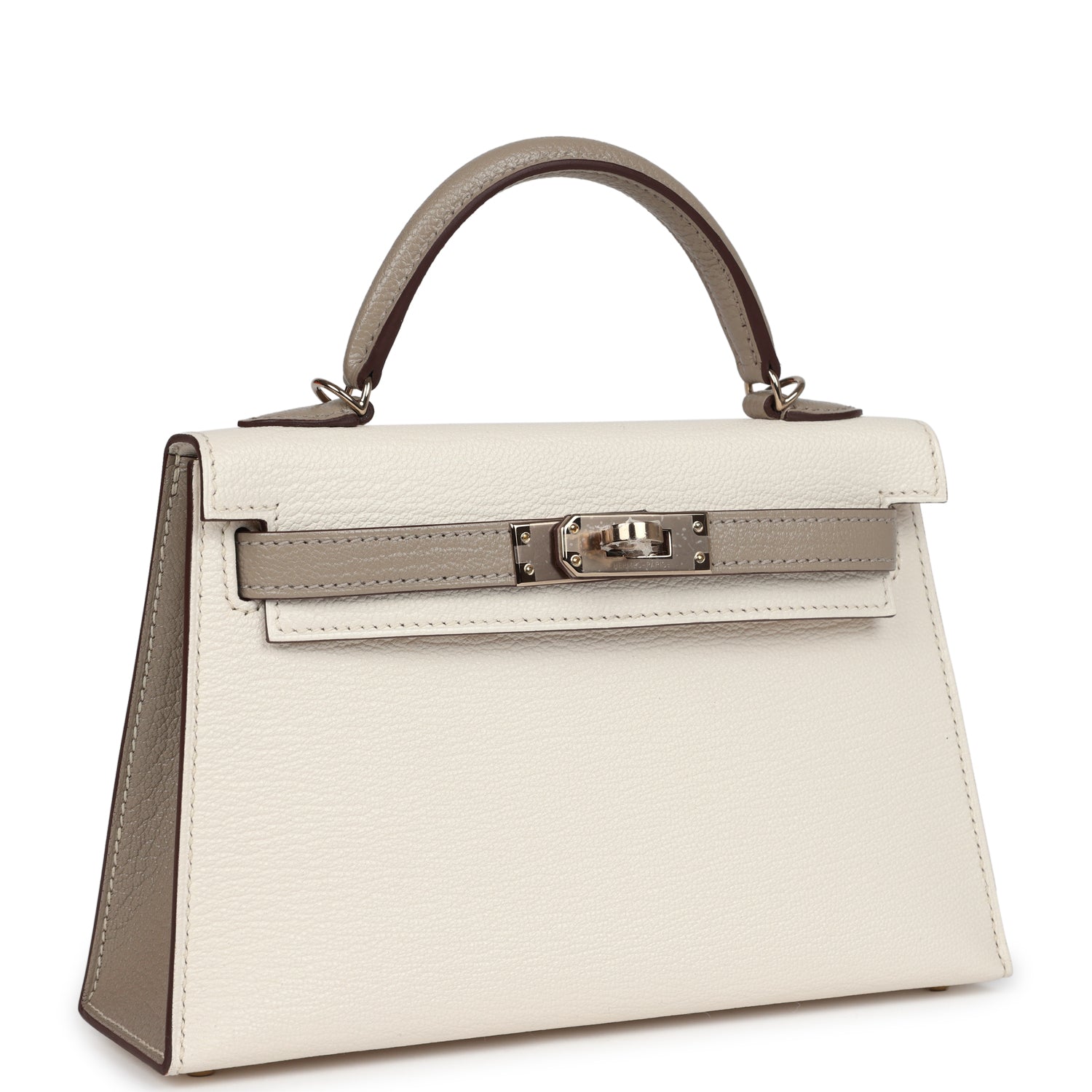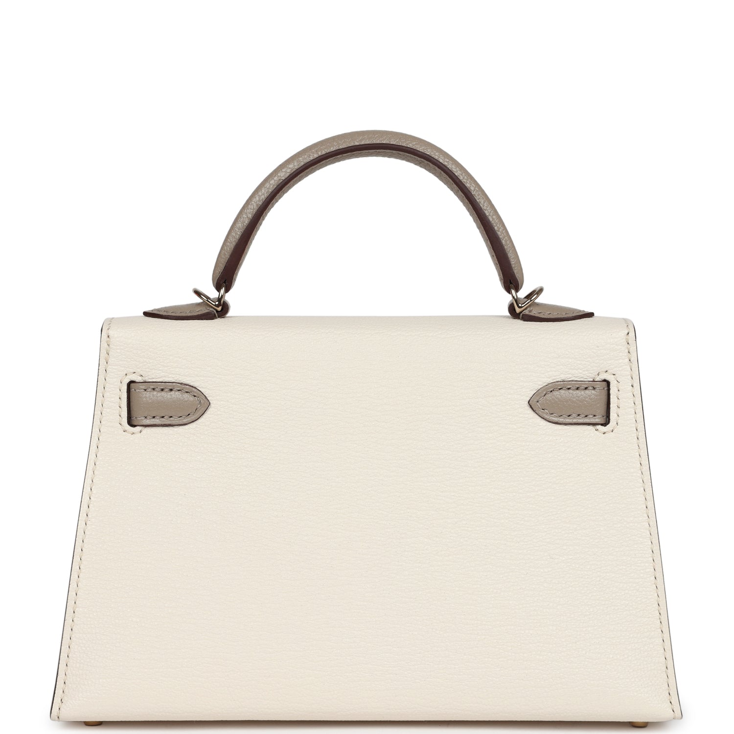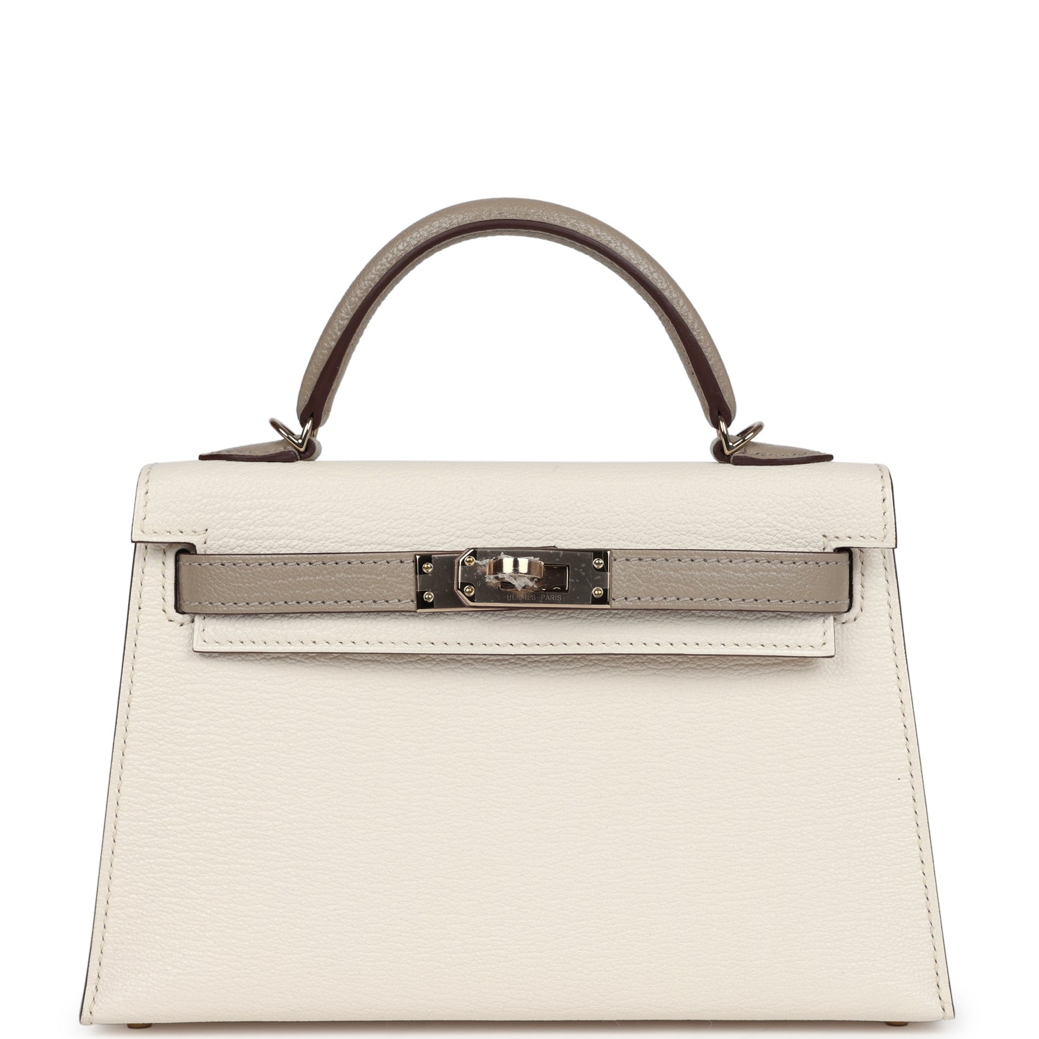 This Special Order Kelly, in the Sellier style, is in Nata and Gris Tourterelle chevre leather with permabrass hardware and features tonal stitching, front flap with two straps, front toggle closure, clochette with lock and two keys, and single rolled handles.