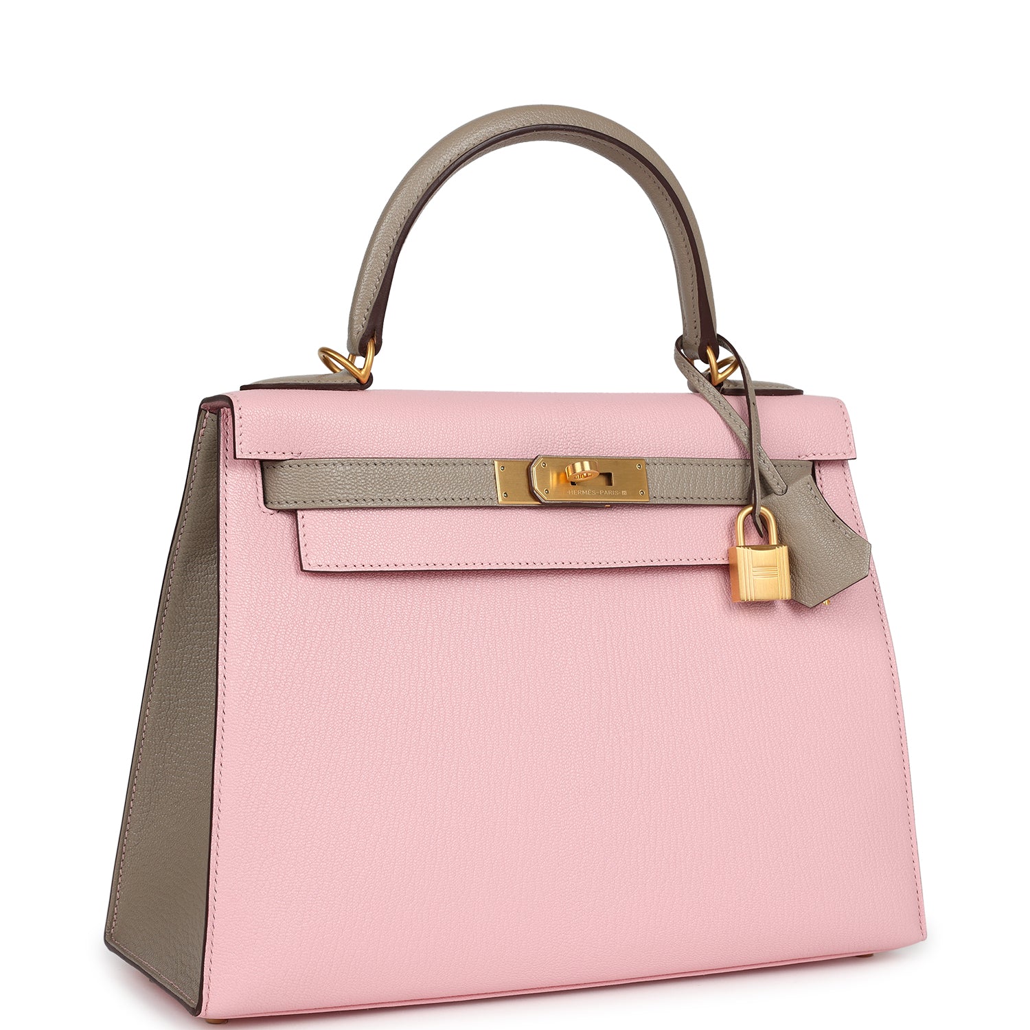 Special Order Kelly, in the Sellier style, is in Rose Sakura and Gris Tourterelle chevre leather with brushed gold hardware and has a mixture of contrast and tonal stitching, front flap, two straps with center toggle closure, clochette with lock and two keys, single rolled handle and removable shoulder strap.
