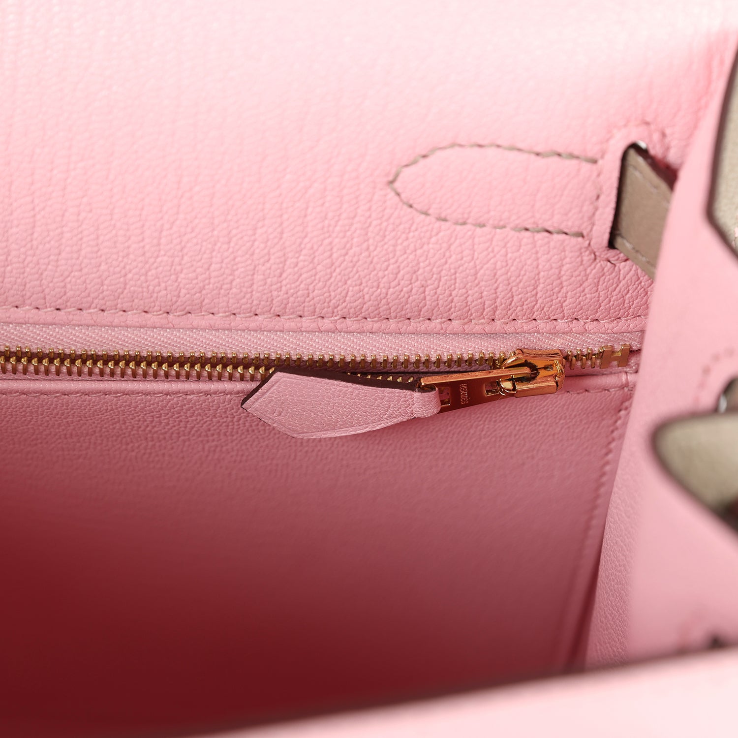 The interior is lined with Gris Tourterelle chevre leather and has one zip pocket with an Hermes engraved pull and two open pockets on the opposite side.