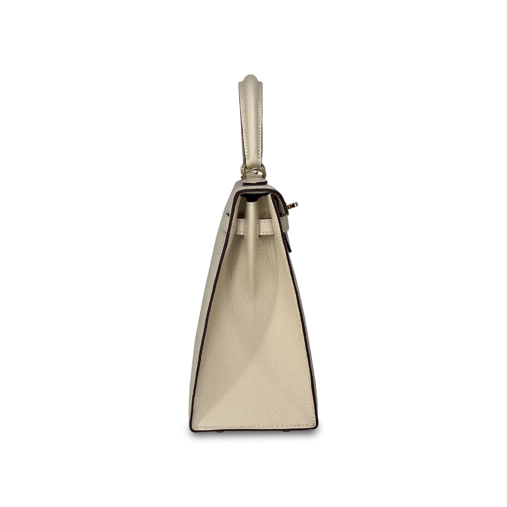 The Kelly Sellier 25 is an extremely rare find. Sellier is the rigid attribute of the handcrafted Kelly bag. Epsom leather type allows for a stiffer bag crafting, which along with its size, making it the perfect evening bag. Craie, or else off-white, in Epsom leather is a true manifestation of elegance.