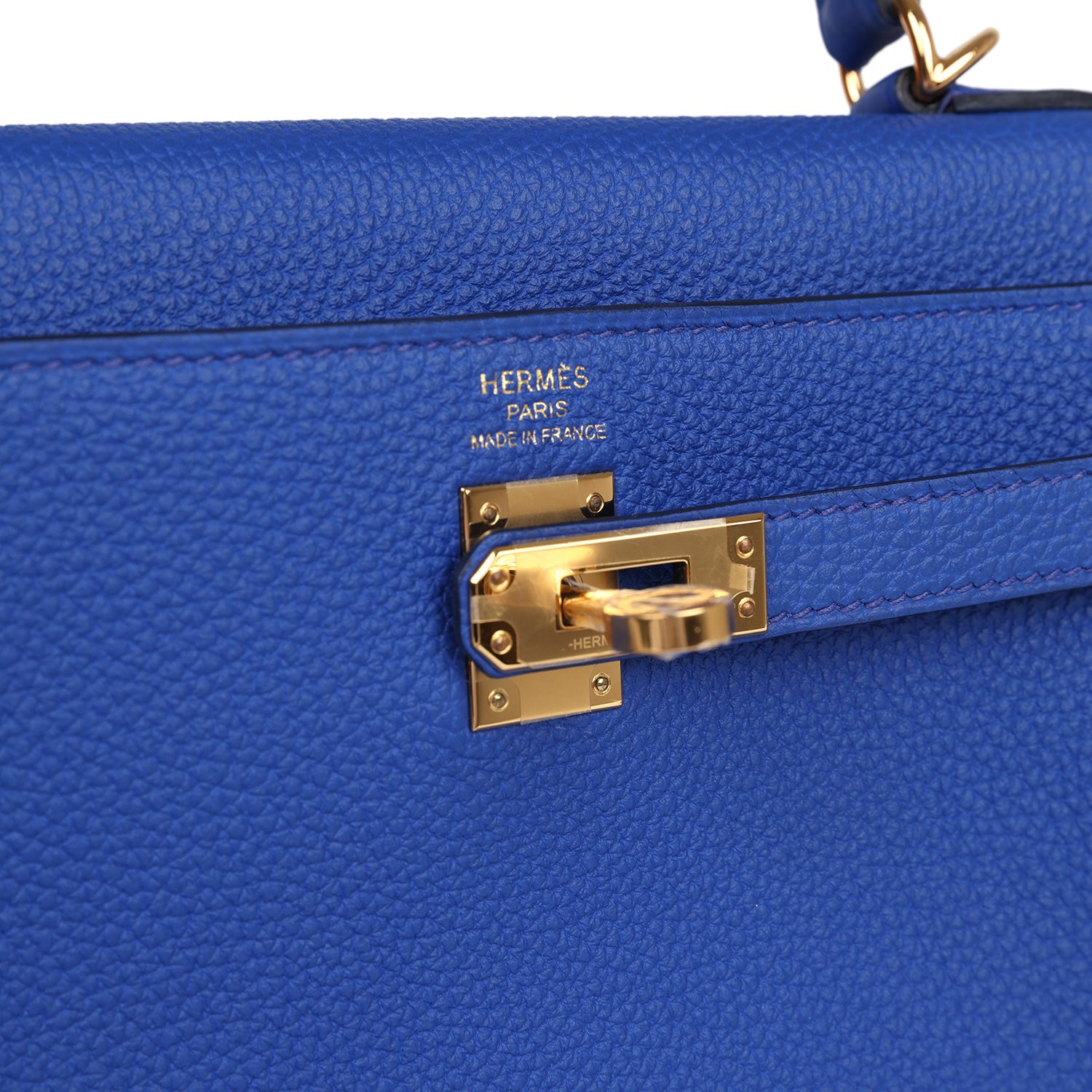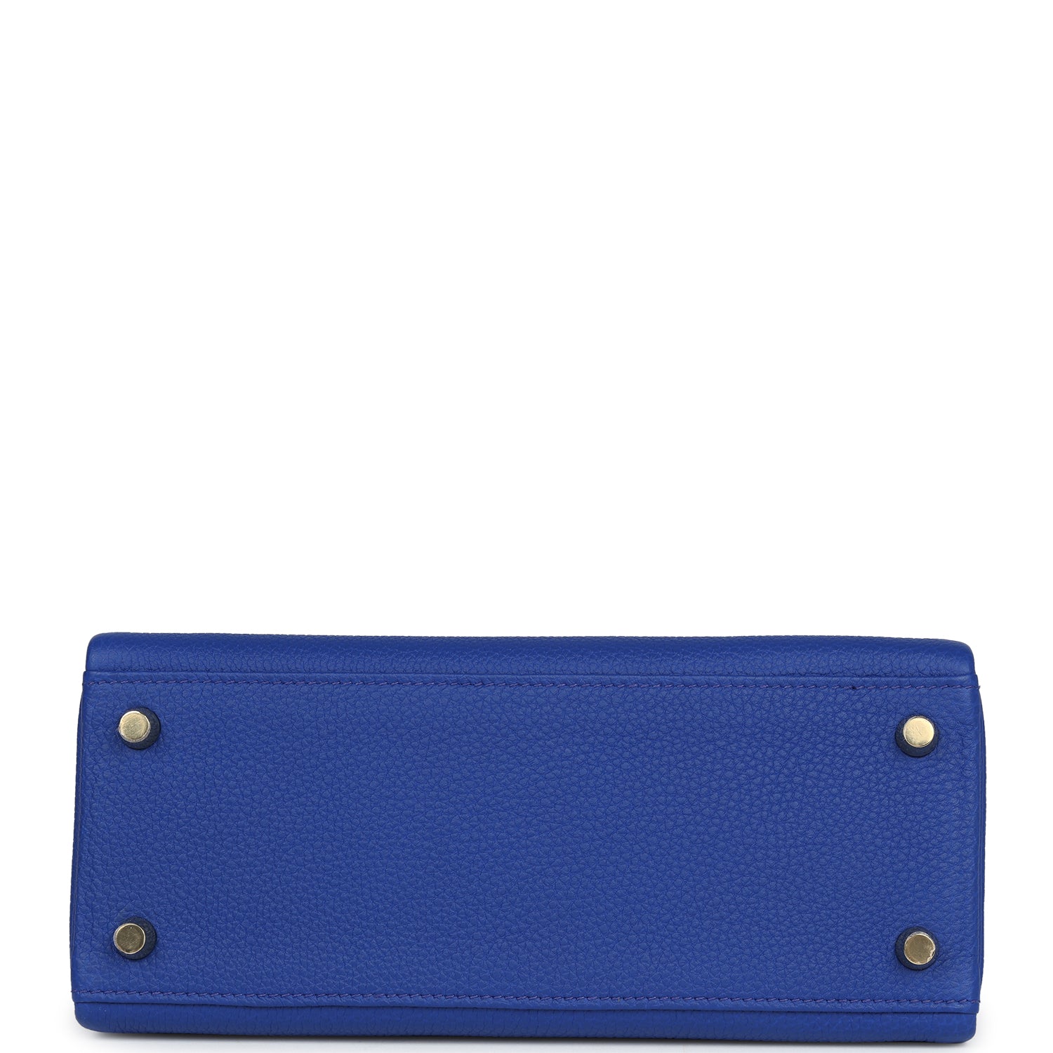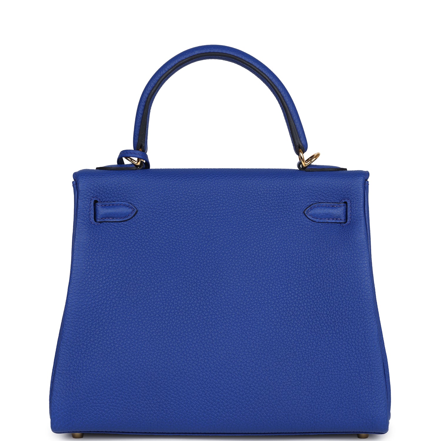 This Kelly, in the Retourne style, is in Bleu Royal togo leather with gold hardware and has tonal stitching,front flap, two straps with center toggle closure, clochette with lock and two keys, single rolled handle and removable shoulder strap.