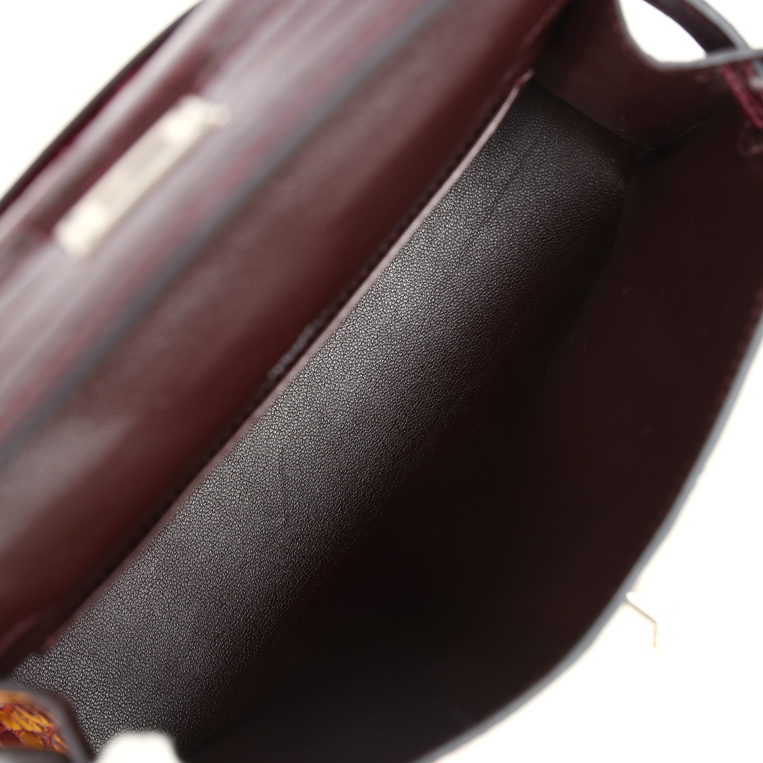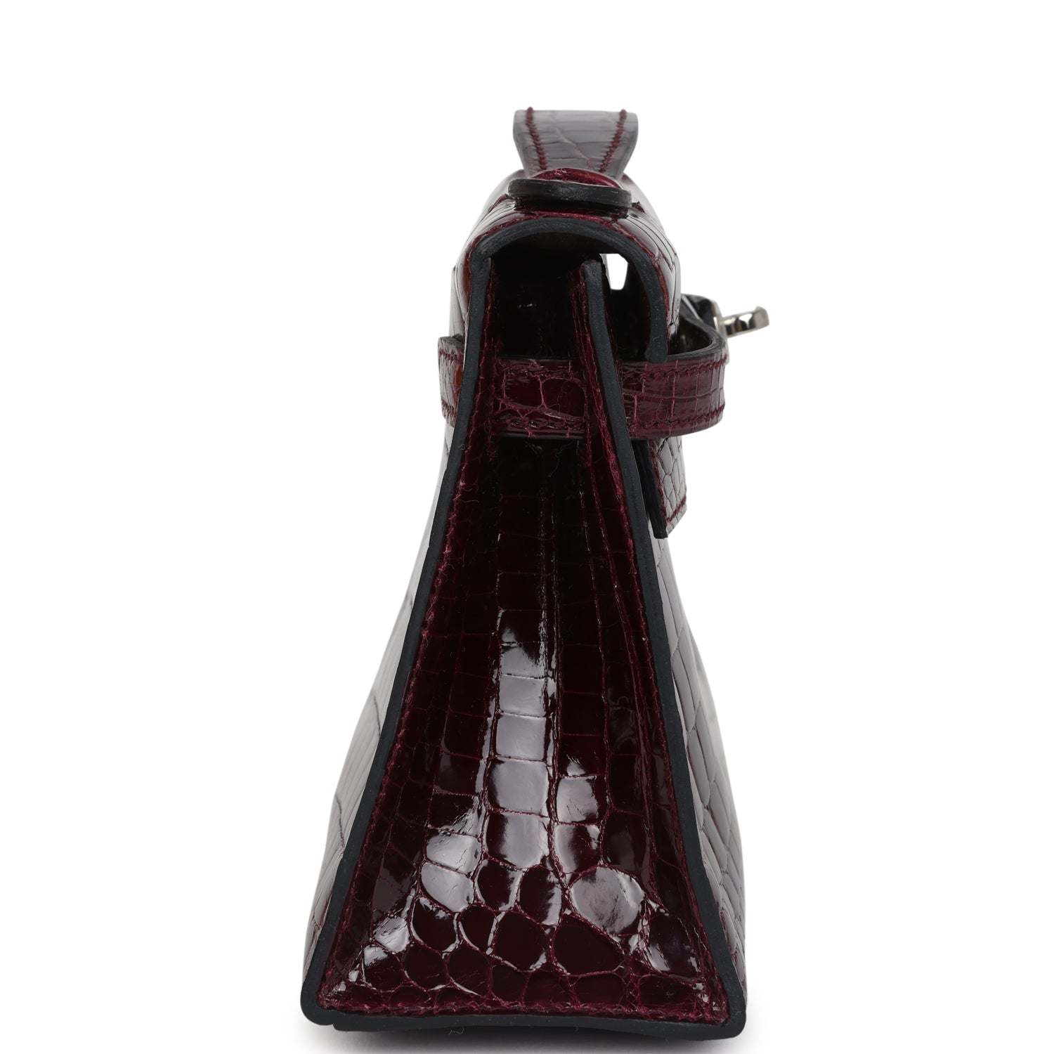 Mini Kelly Pochette is in Bordeaux Shiny Niloticus Crocodile leather with palladium hardware and has tonal stitching, front flap, two straps with center toggle closure and a top flat handle.