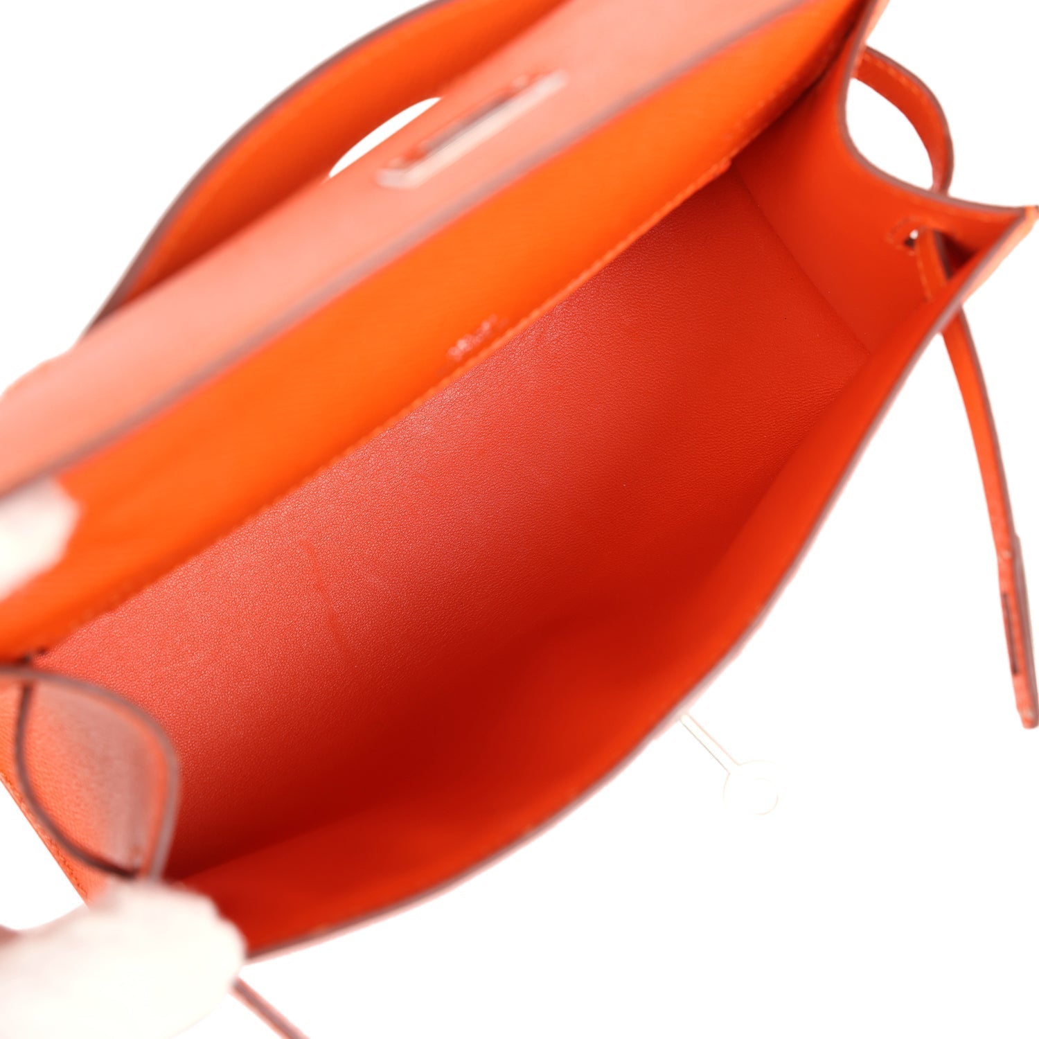 Kelly Pochette is in Feu epsom leather with palladium hardware and has tonal stitching, two straps with front toggle closure and a top flat handle.