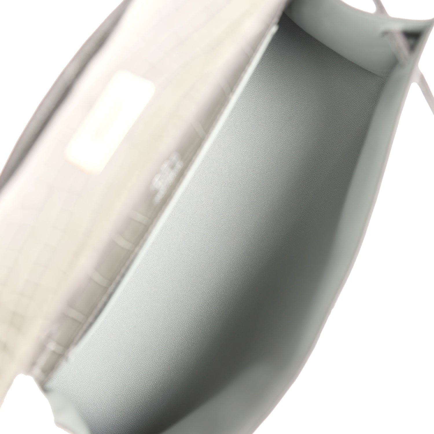 Hermes Kelly Pochette is in Gris Ciment Shiny Alligator Mississippiensis leather with palladium hardware, tonal stitching, front flap with two straps, toggle closure and single flat handle.