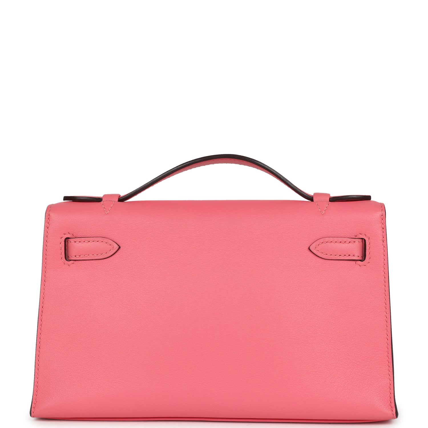 Kelly Pochette is in Rose Azalee swift leather with gold hardware and has tonal stitching, front flap, two straps with center toggle closure and a top flat handle.