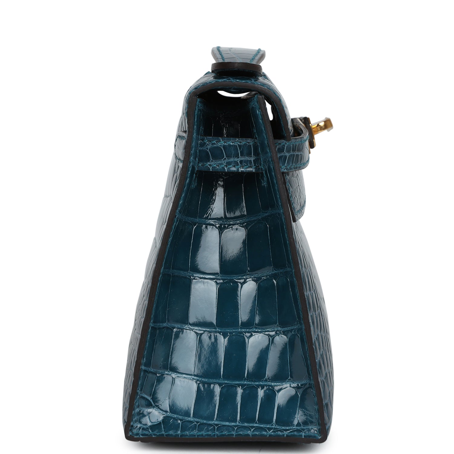 Kelly Pochette is in Vert Bosphore Shiny Alligator leather with gold hardware, tonal stitching, front flap with two straps, toggle closure and single flat handle.