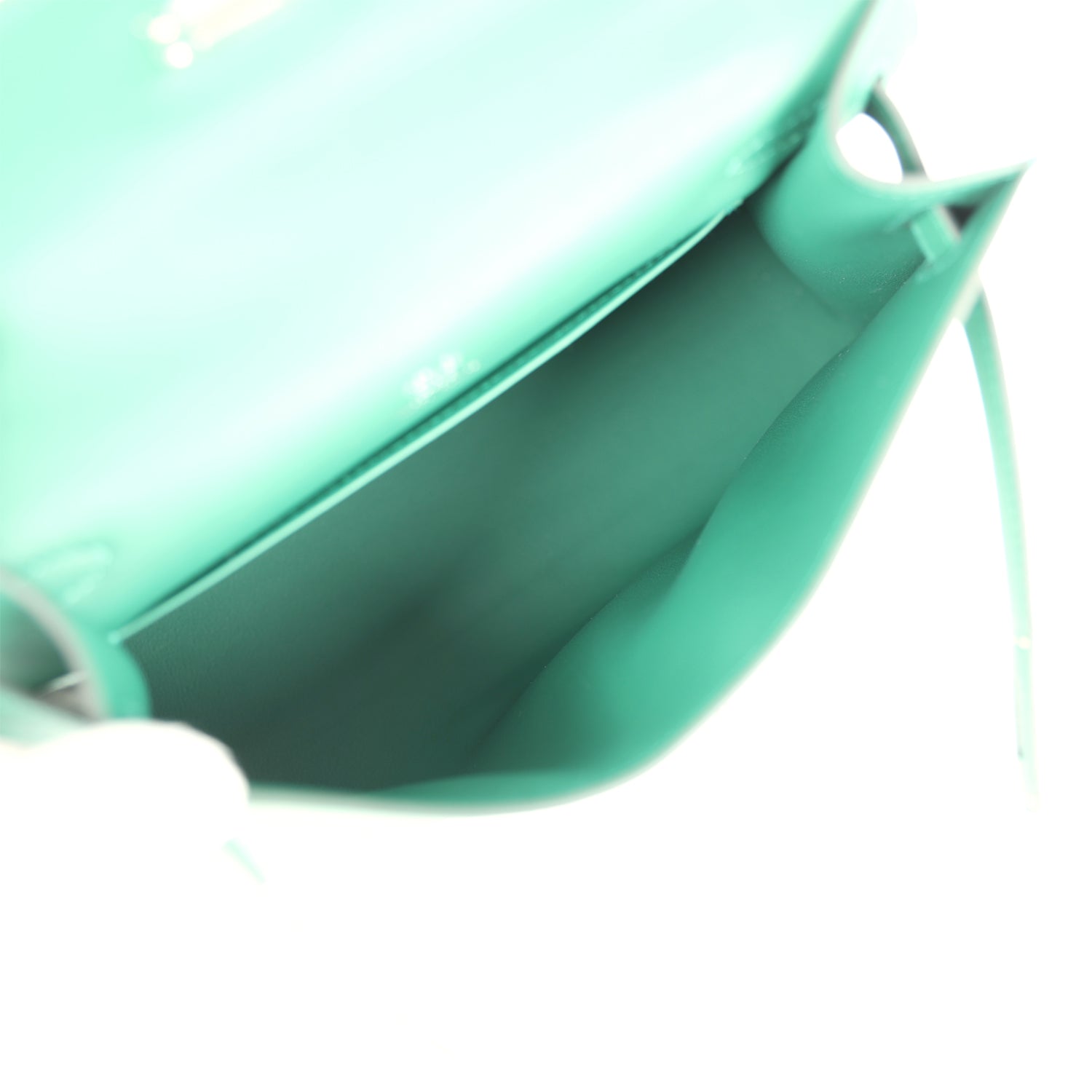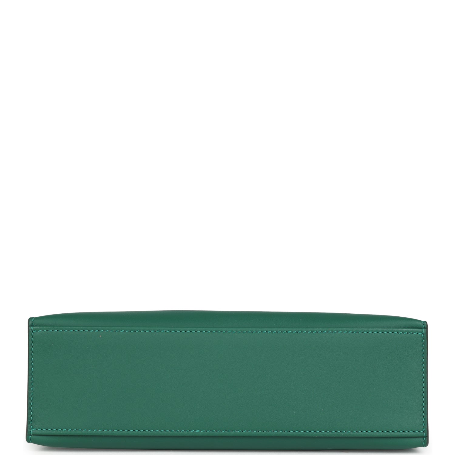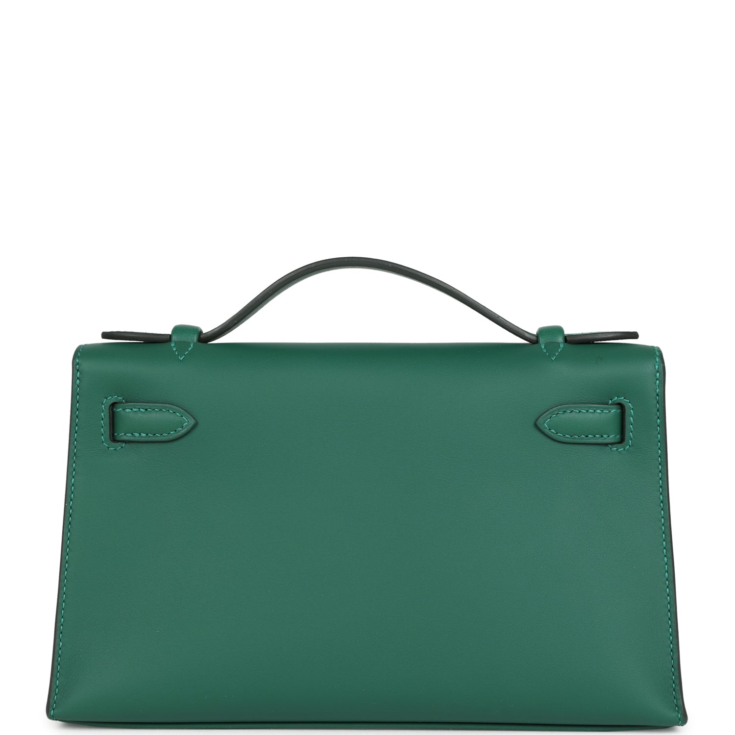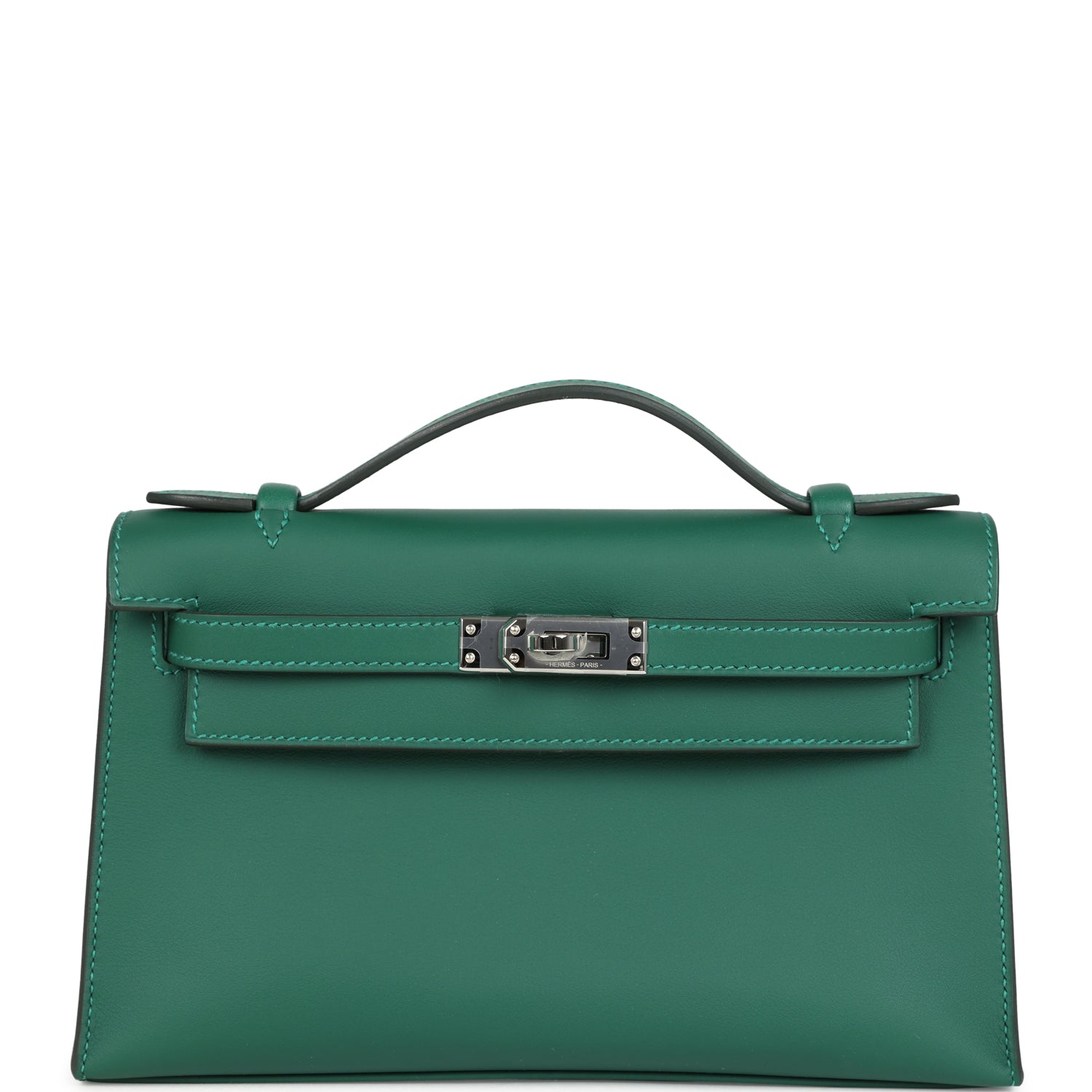 Kelly Pochette is in Vert Moyen swift leather with palladium hardware and has tonal stitching, front flap, two straps with center toggle closure and a top flat handle.