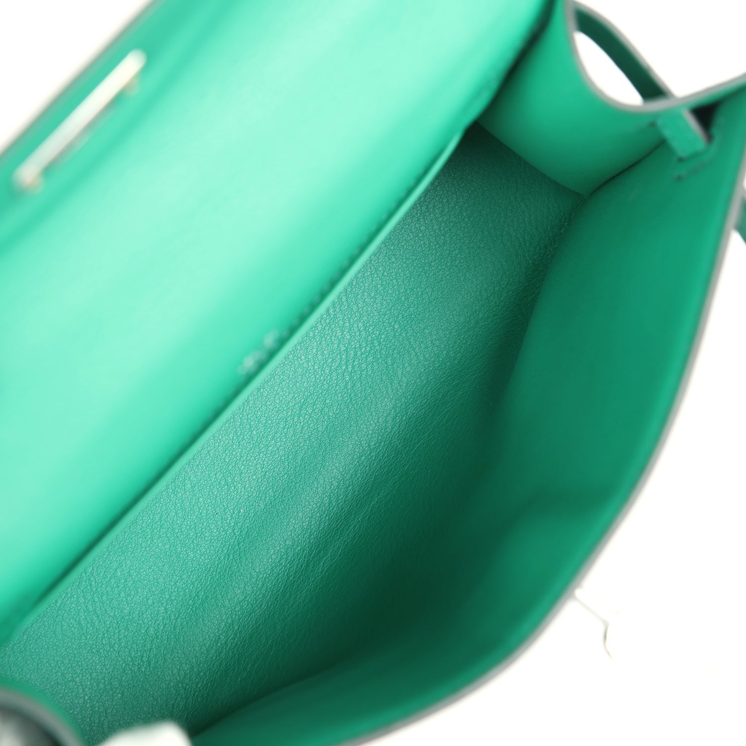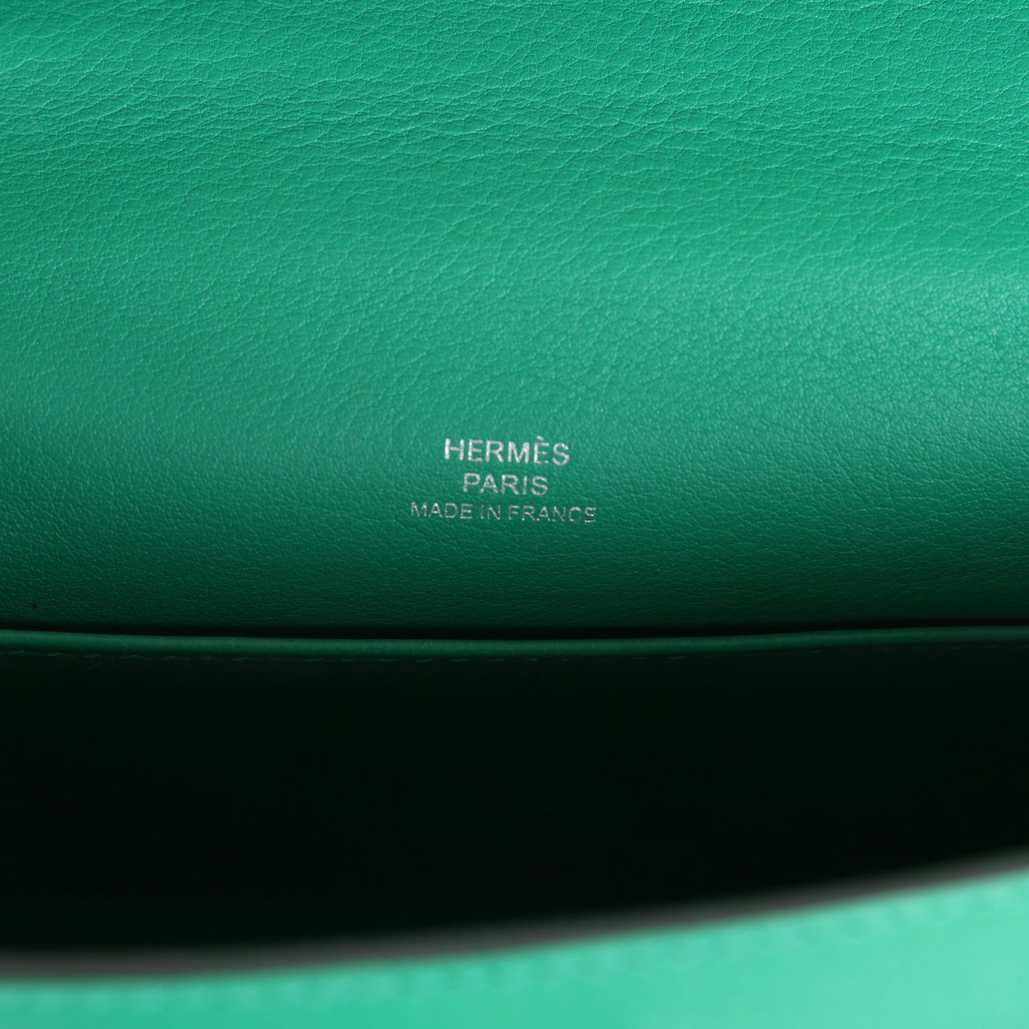 Kelly Pochette is in Vert Vertigo swift leather with palladium hardware and has tonal stitching, front flap, two straps with center toggle closure and a top flat handle.