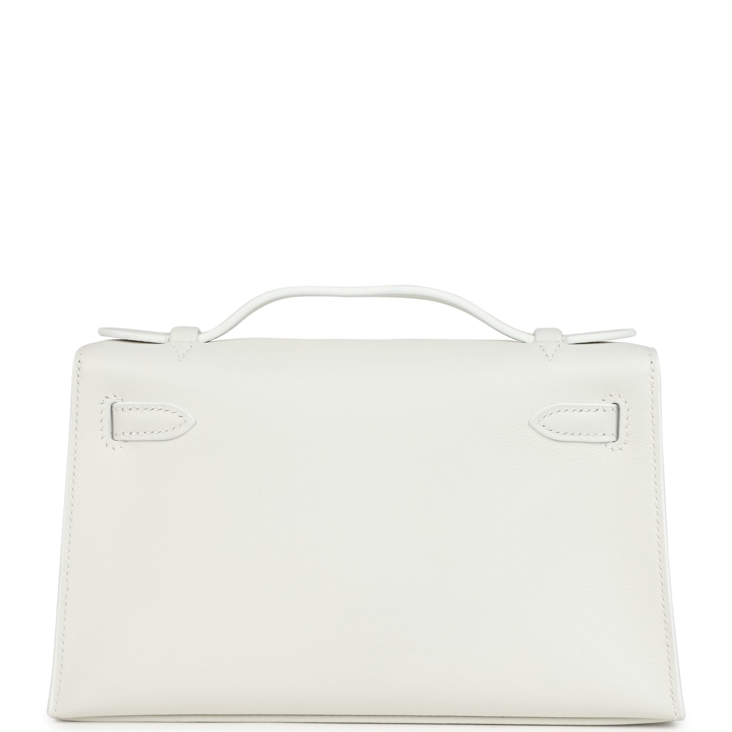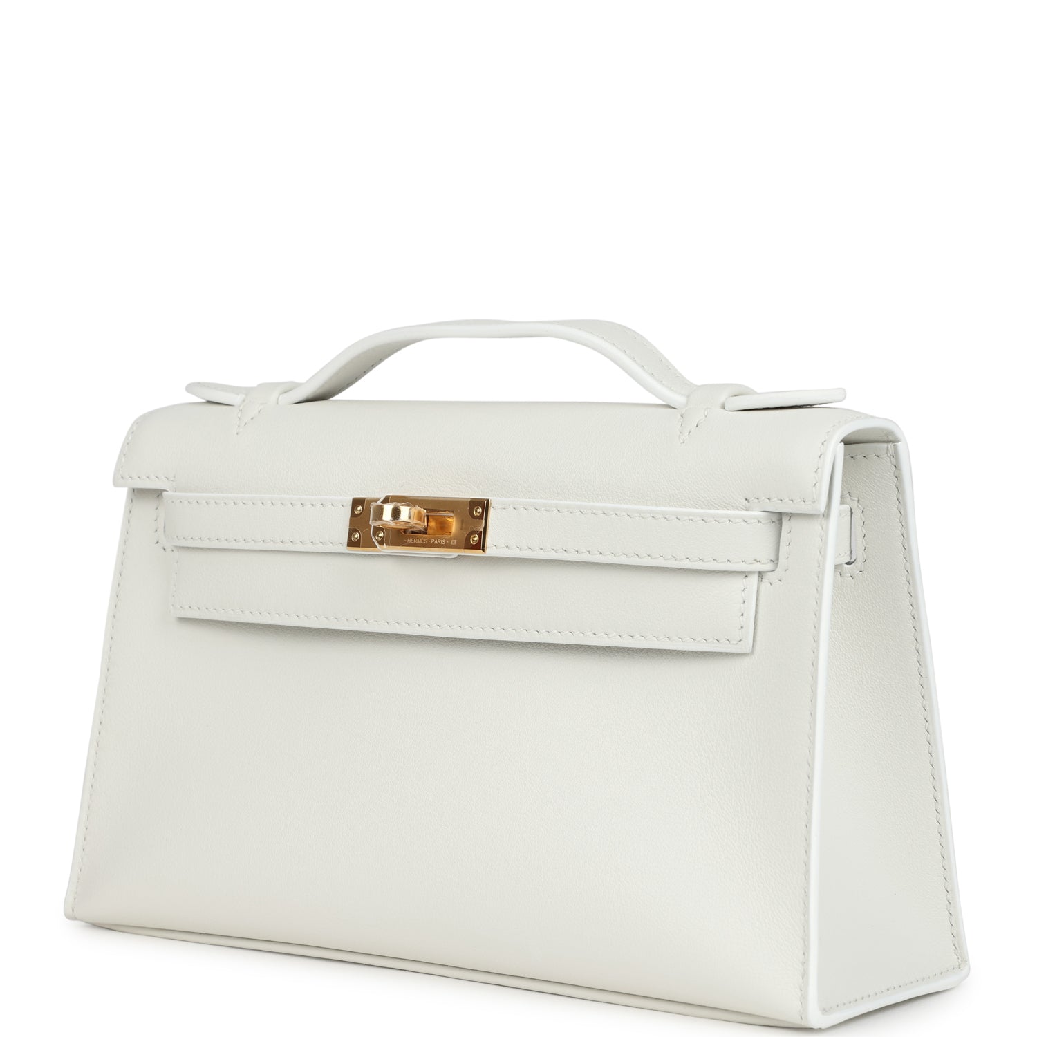 This Kelly Pochette is in White swift leather with gold hardware and has tonal stitching, front flap, two straps with center toggle closure and a top flat handle.