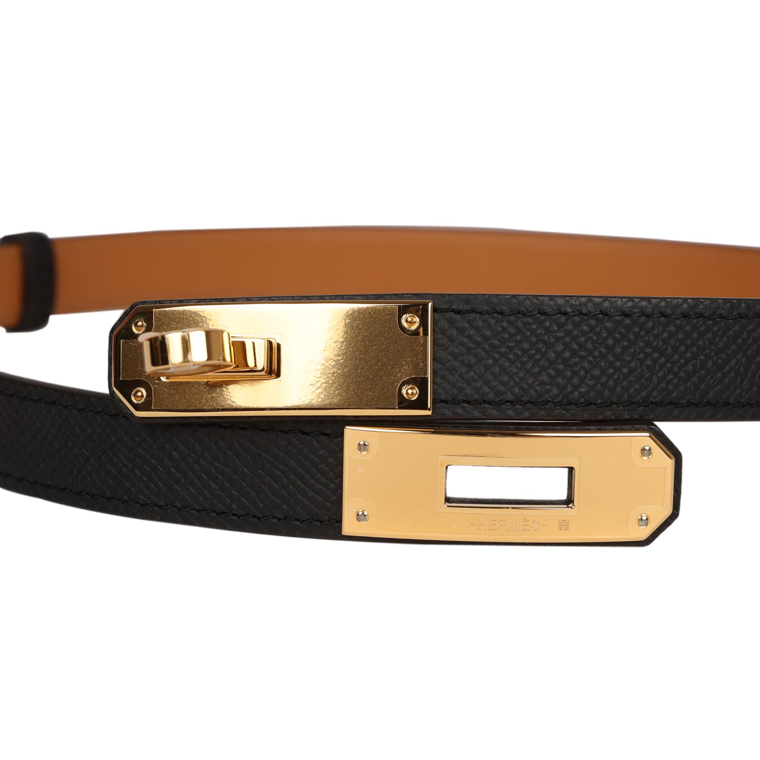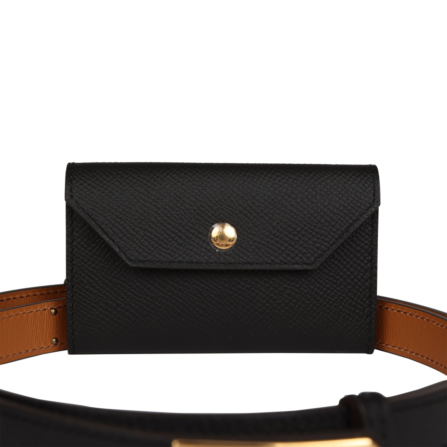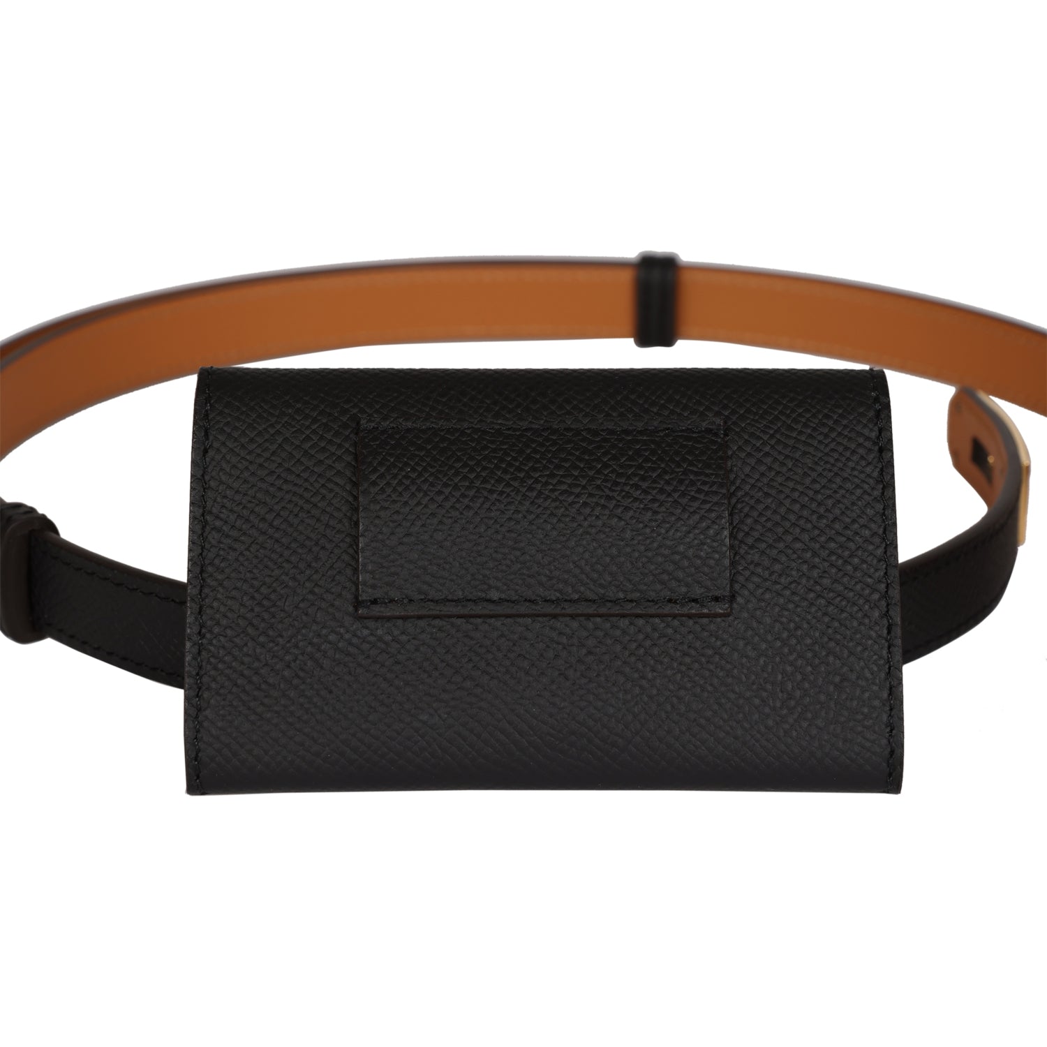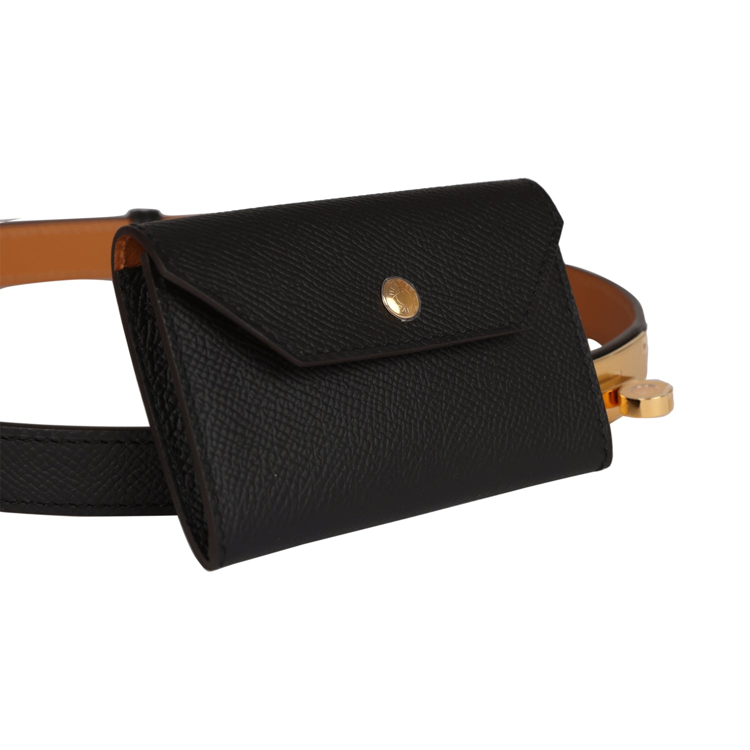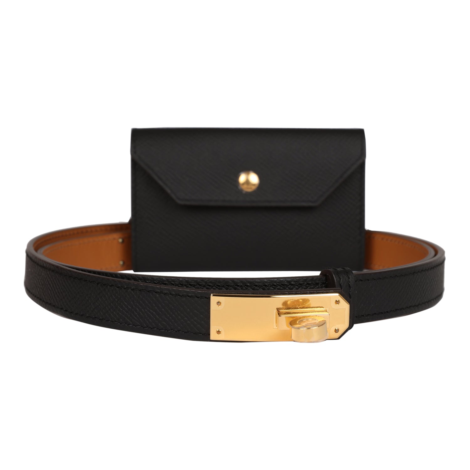 This Hermes Kelly Pocket 18 is in black epsom with gold hardware, adjustable black belt, tonal stitching, kelly style closure, removable snap closure pouch, and an engraved closure.