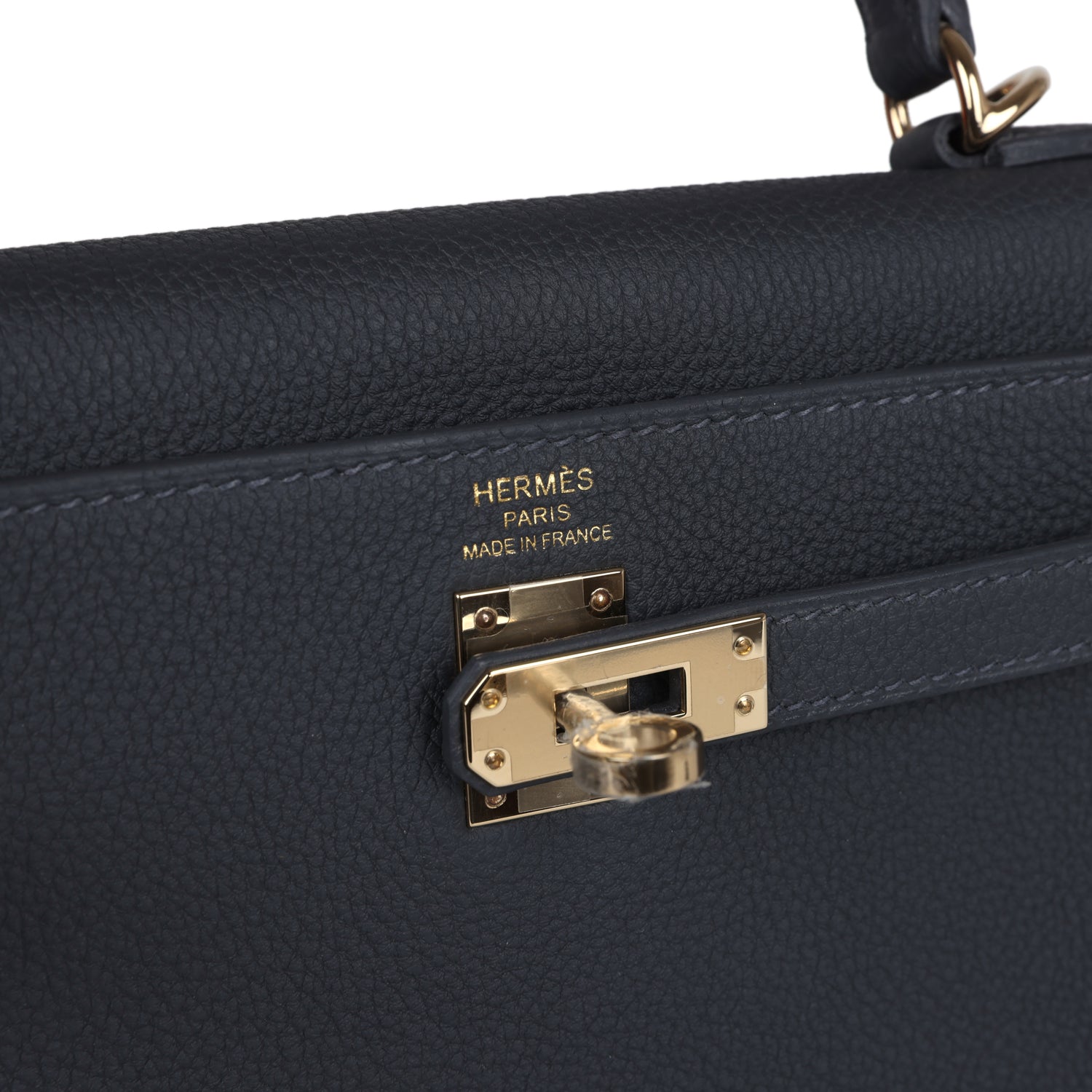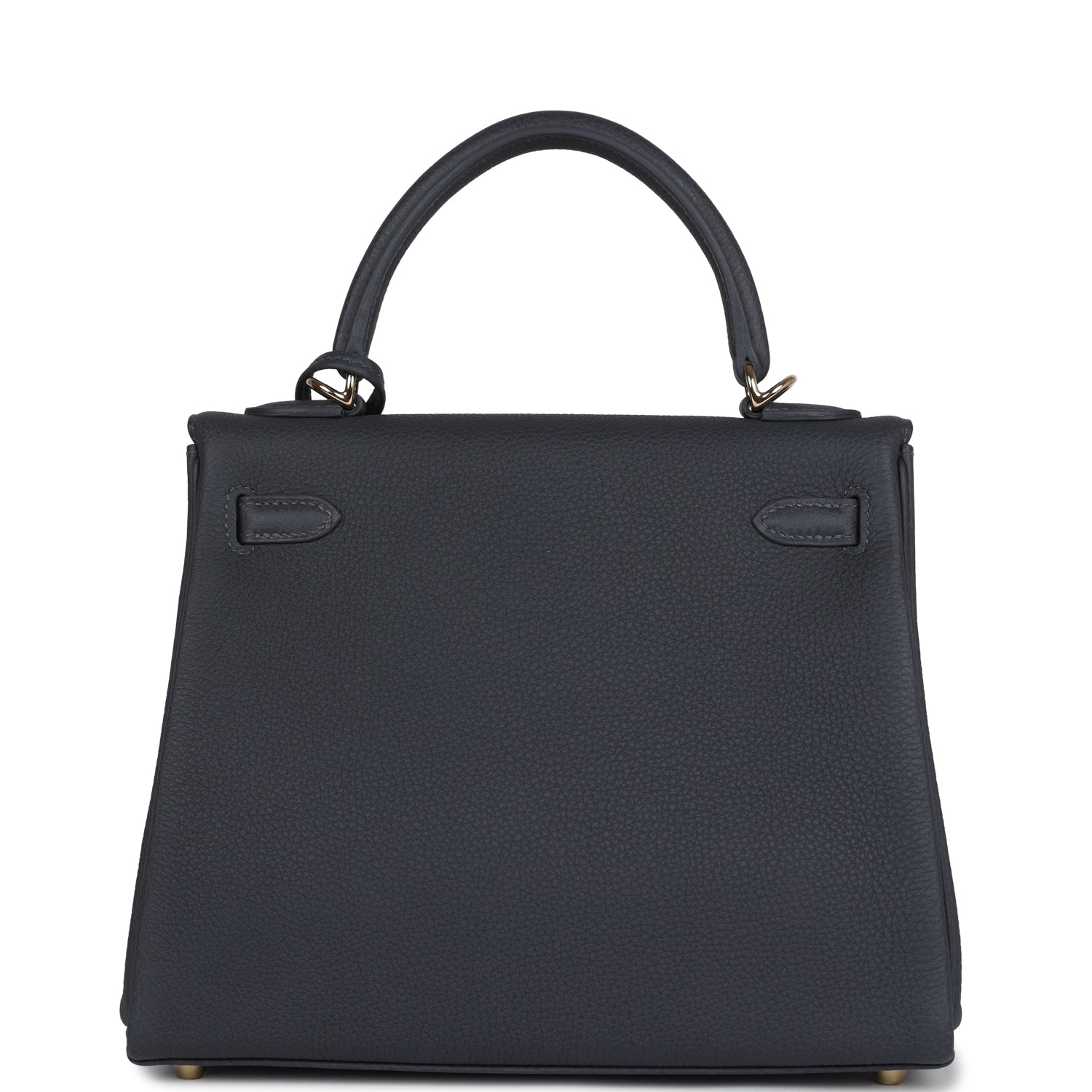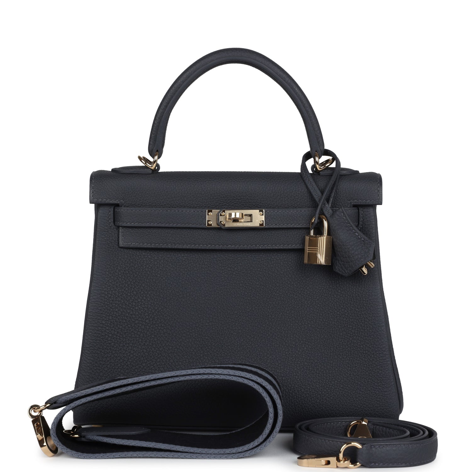 This Kelly, in the Retourne style, is in Ardoise togo leather with permabrass hardware and has tonal stitching, two straps with front toggle closure, clochette with lock and two keys, single rolled handle and removable shoulder strap.