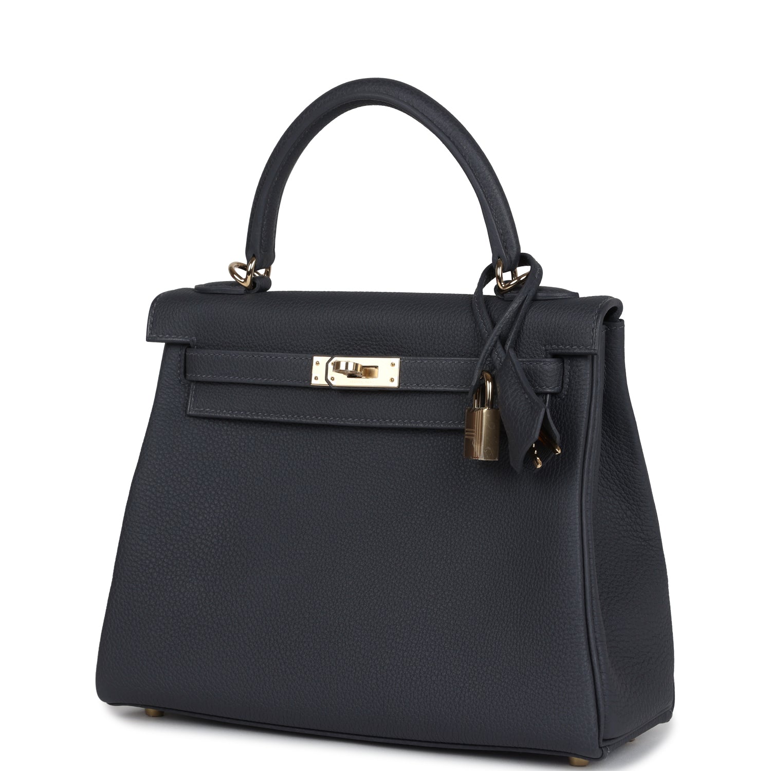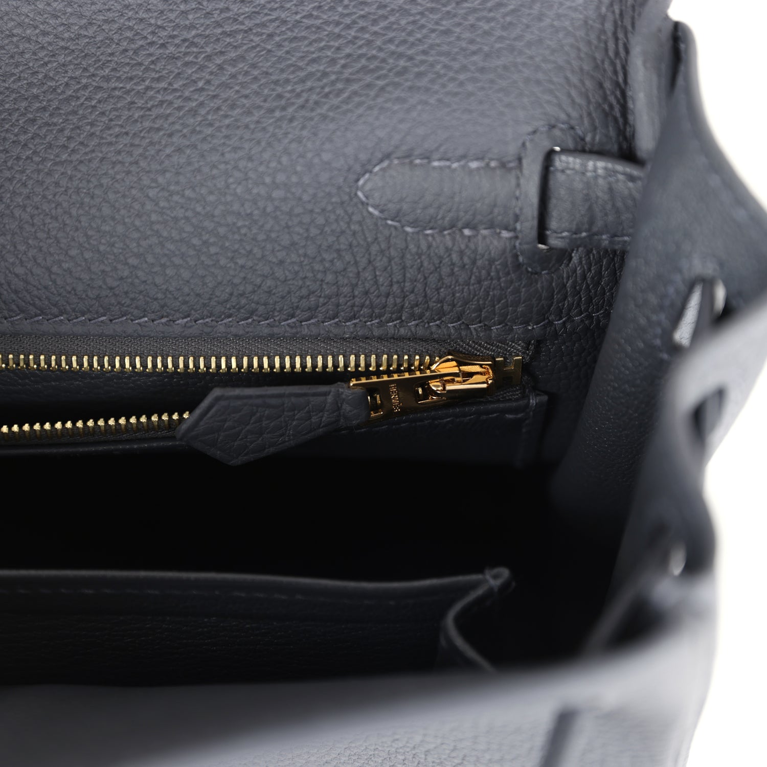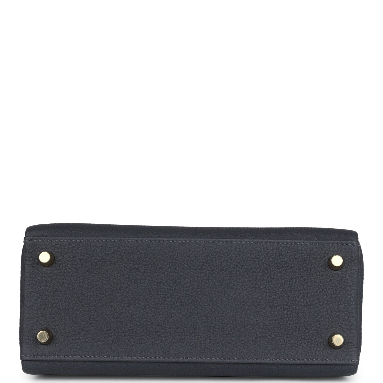 This Kelly, in the Retourne style, is in Ardoise togo leather with permabrass hardware and has tonal stitching, two straps with front toggle closure, clochette with lock and two keys, single rolled handle and removable shoulder strap.