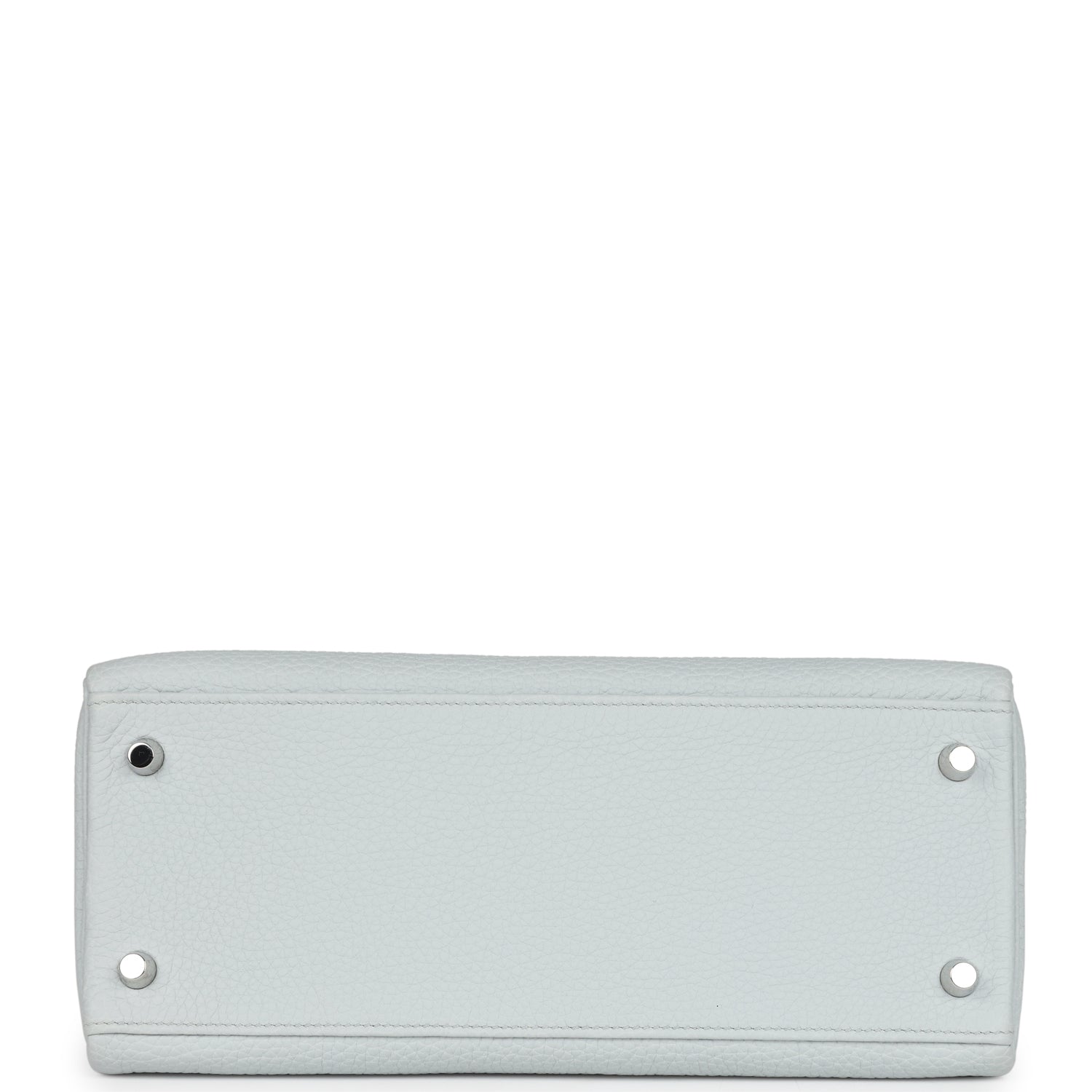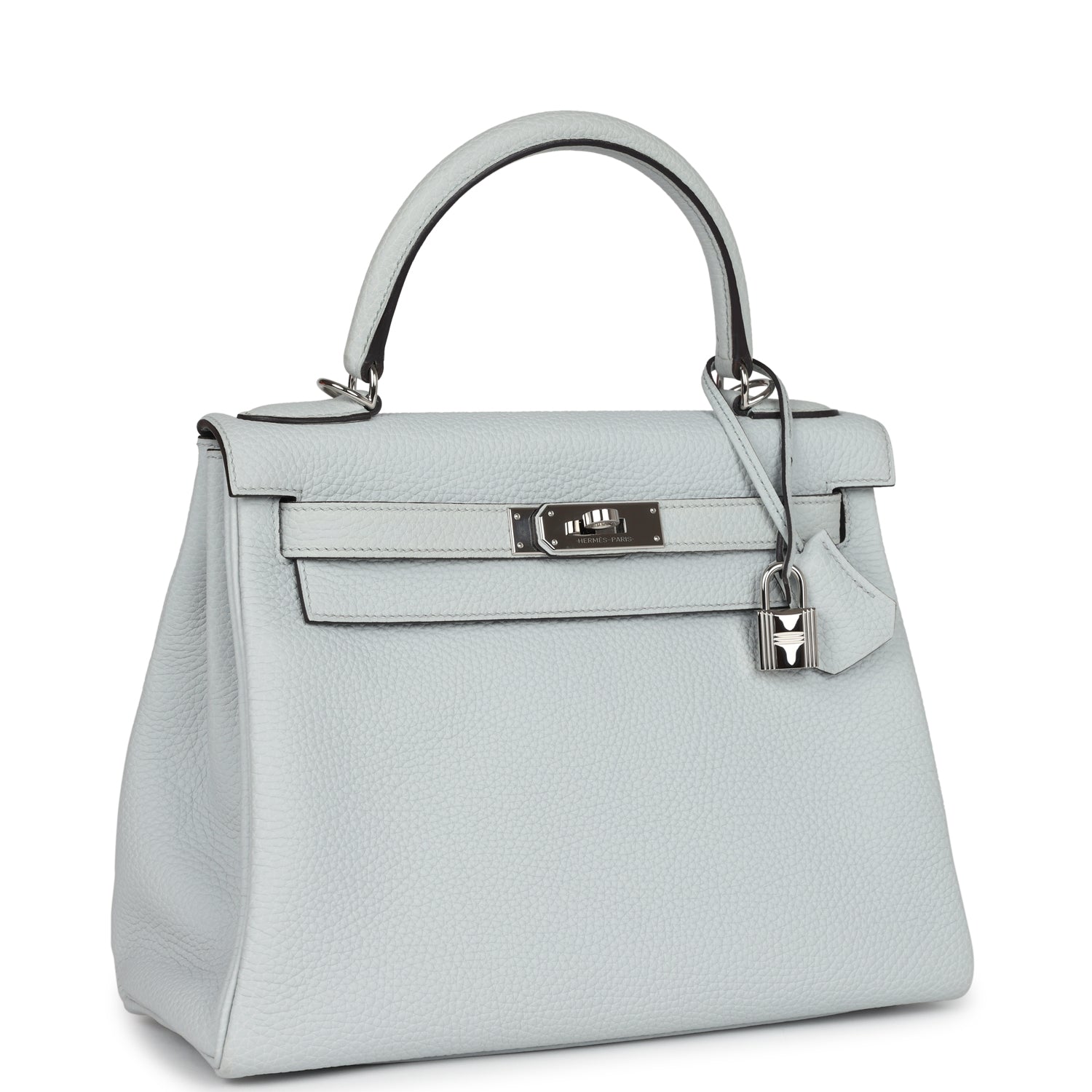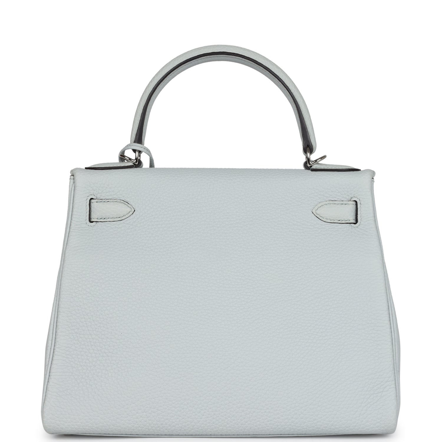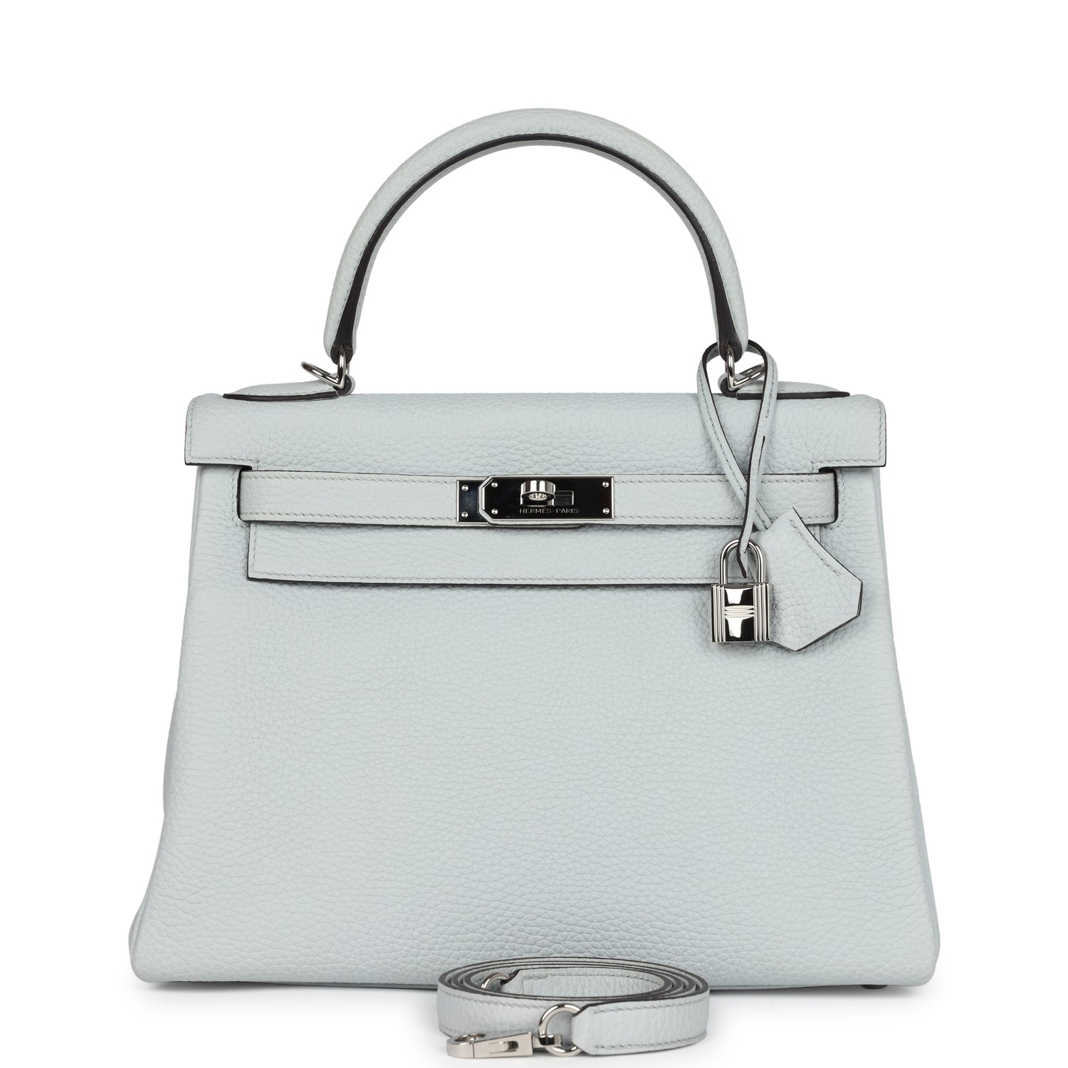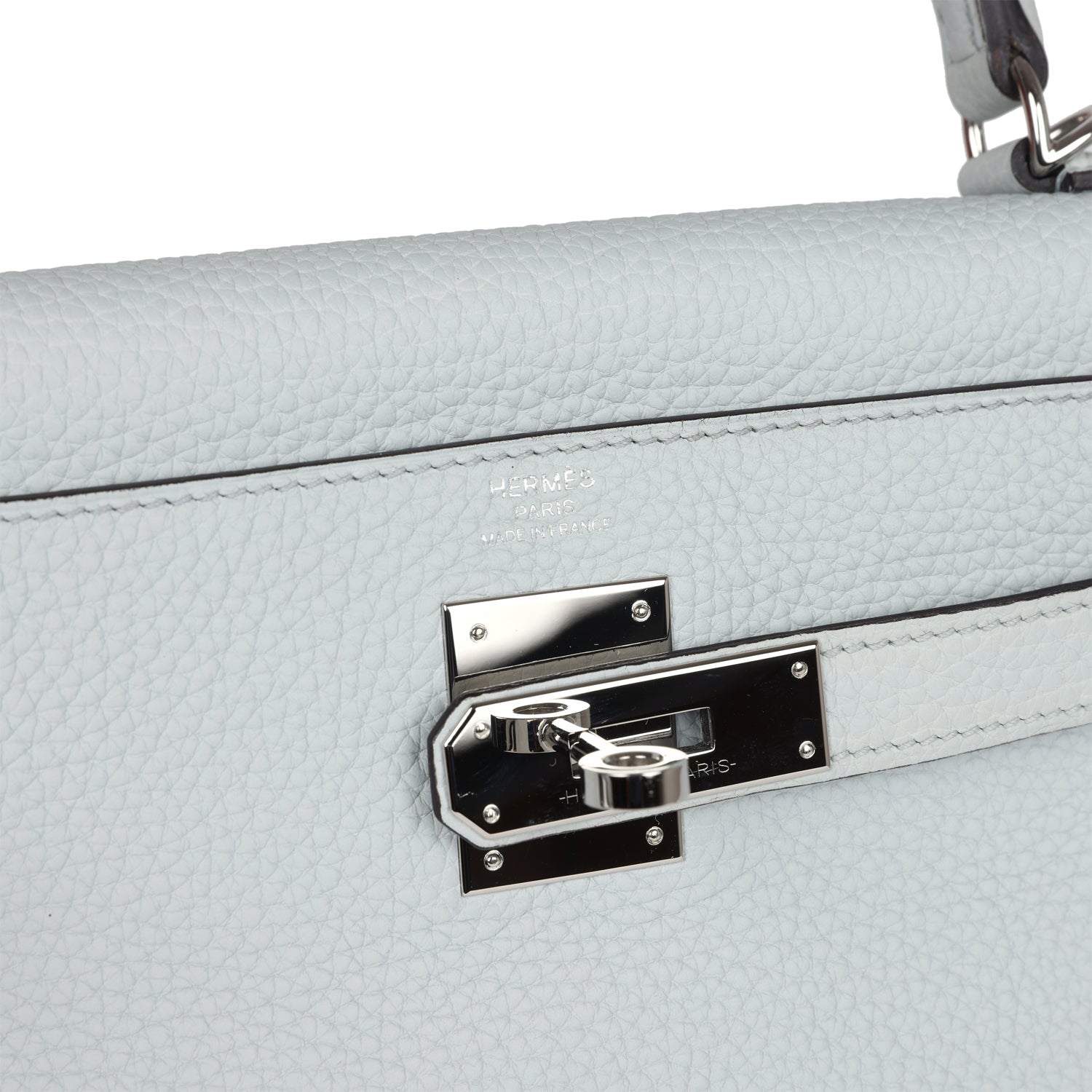 This Kelly, in the Retourne style, Bleu Pale clemence leather with palladium hardware and has tonal stitching, front flap, two straps with center toggle closure, clochette with lock and two keys, single rolled handle and removable shoulder strap.