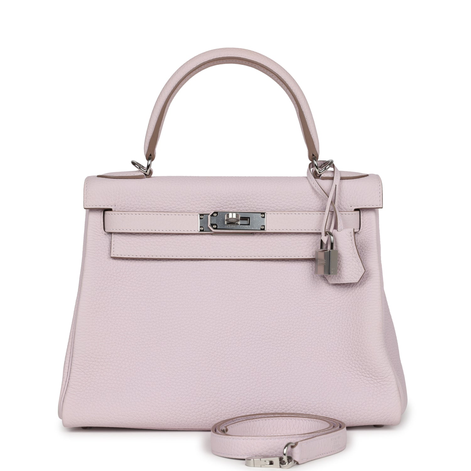 This Kelly, in the Retourne style, is in Mauve Pale clemence leather with palladium hardware and has tonal stitching, front flap, two straps with center toggle closure, clochette with lock and two keys, single rolled handle and removable shoulder strap.