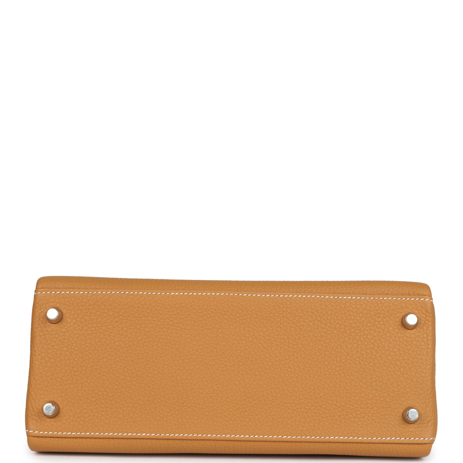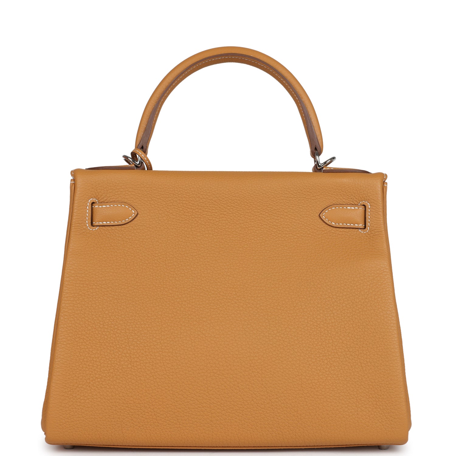 This Kelly, in the Retourne style, is in Naturel Sable togo leather with palladium hardware and has contrast stitching, two straps with front toggle closure, clochette with lock and two keys, single rolled handle and removable shoulder strap.
