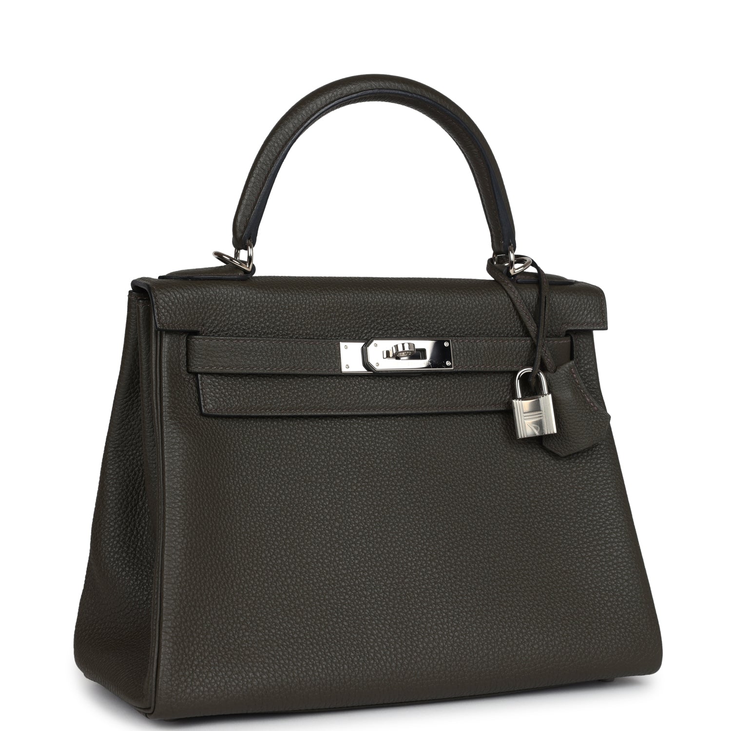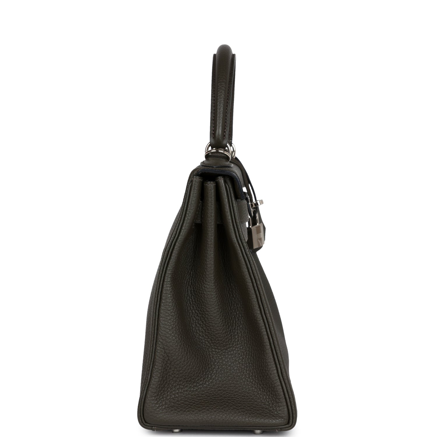 This Kelly, in the Retourne style, is in Vert De Gris togo leather with palladium hardware and has tonal stitching, front flap, two straps with center toggle closure, clochette with lock and two keys, single rolled handle and removable shoulder strap.