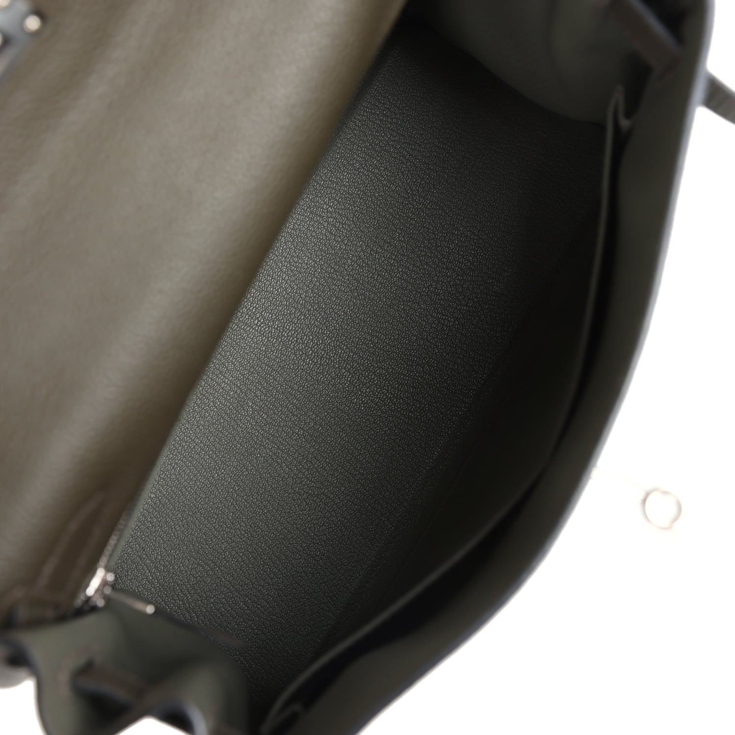 The interior is lined in Vert De Gris chevre and has one zip pocket with Hermes engraved pull and two open pockets on the opposite side.