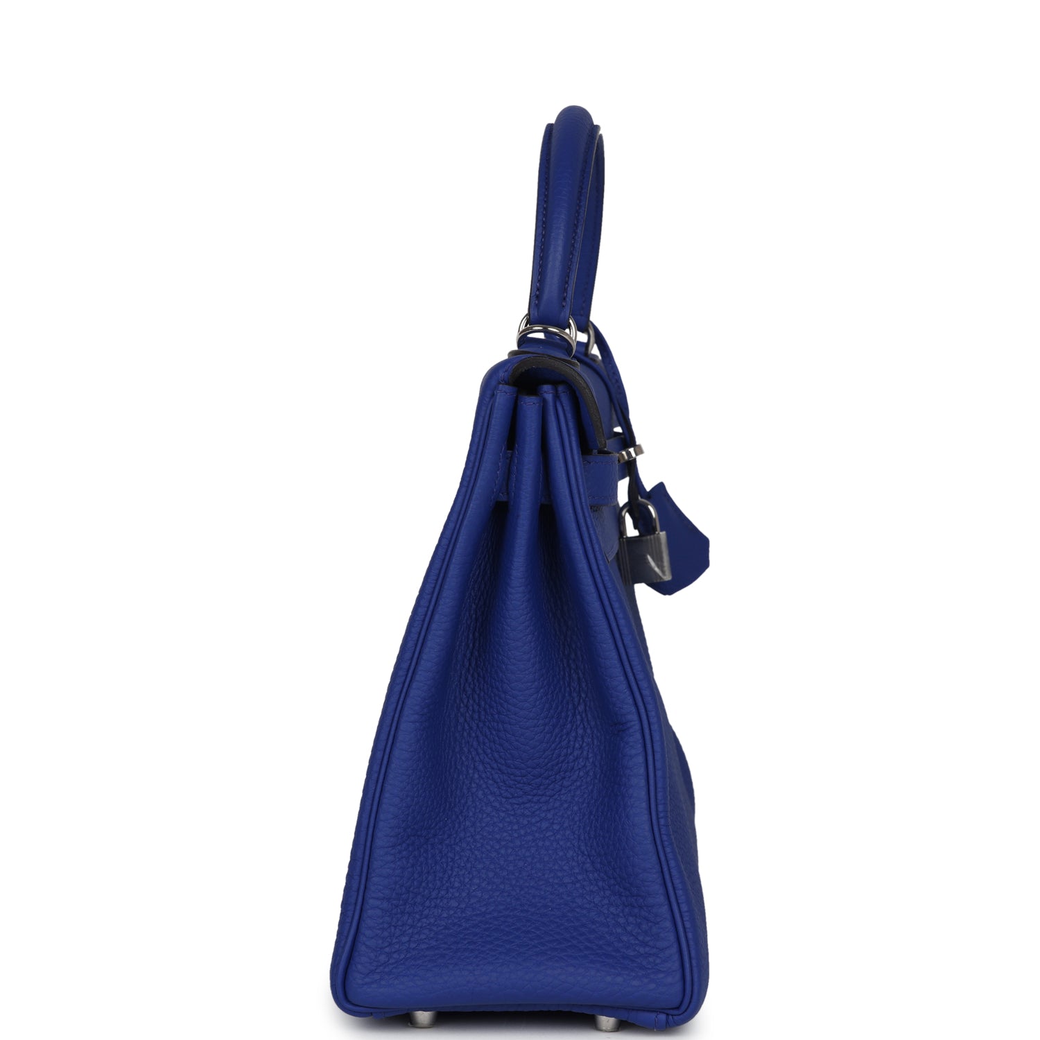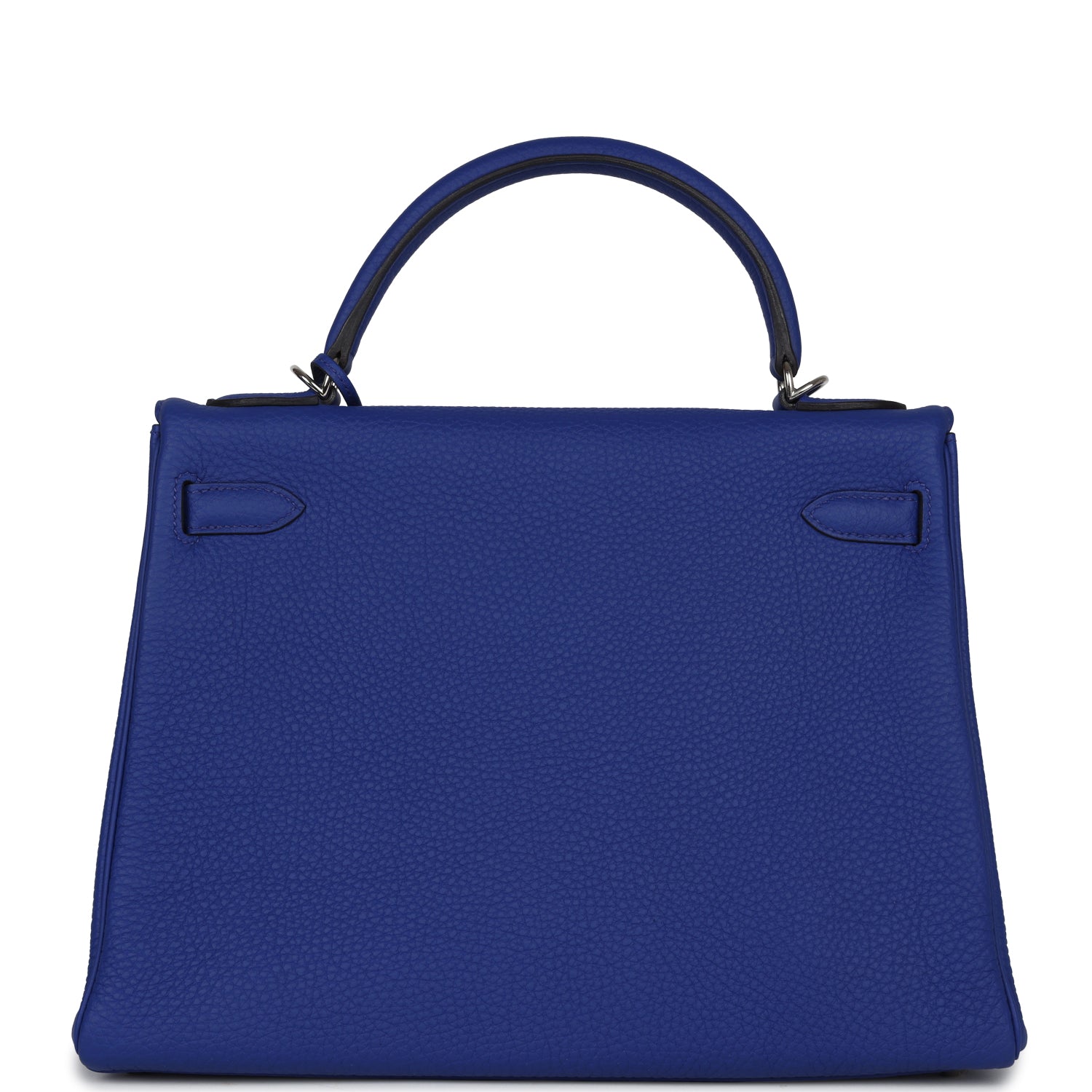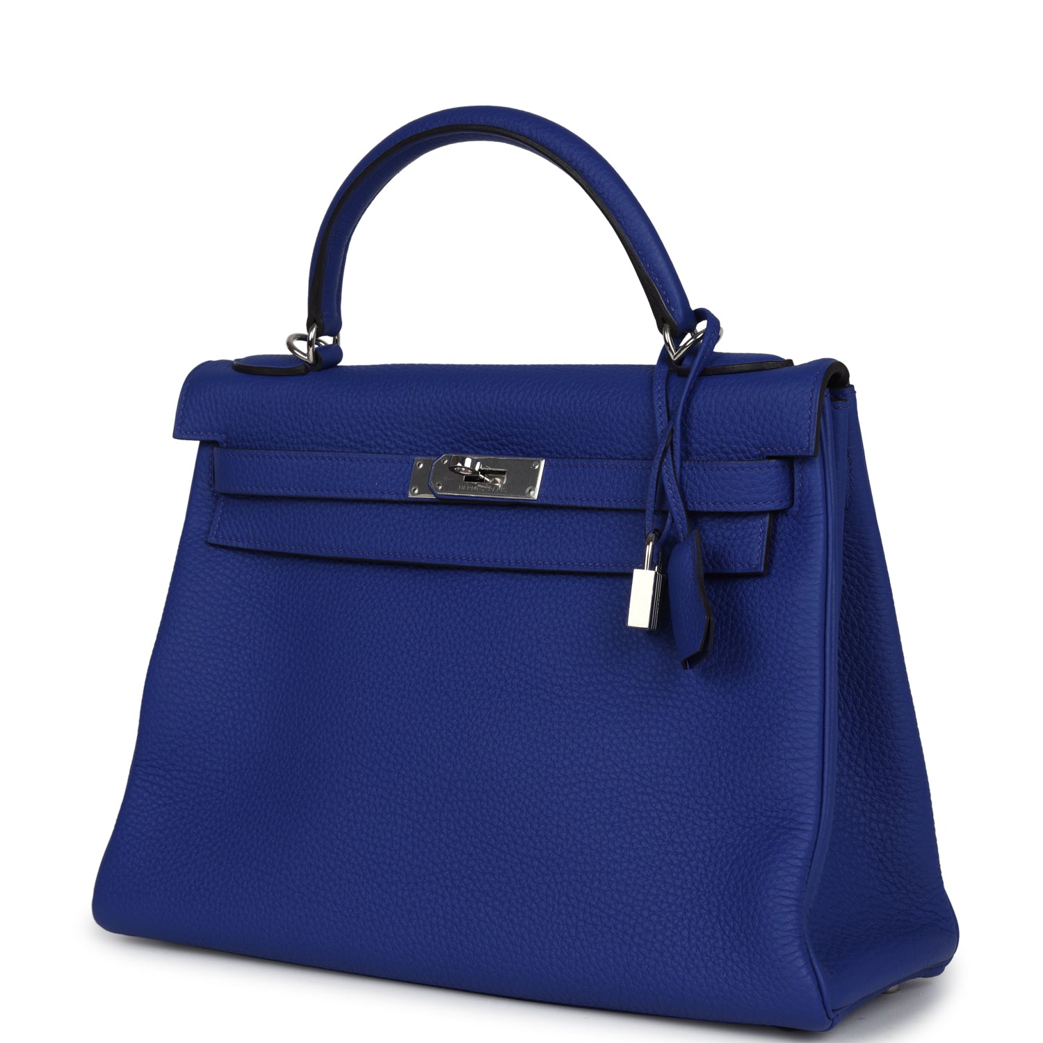 This Kelly, in the Retourne style, is in Bleu Electrique togo leather with palladium hardware and has tonal stitching, two straps with front toggle closure, clochette with lock and two keys, single rolled handle and removable shoulder strap.