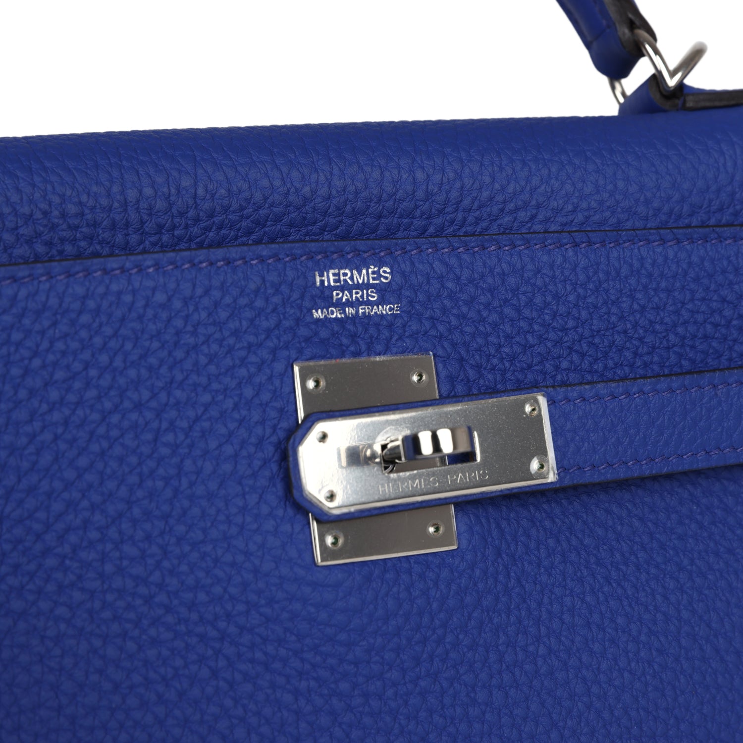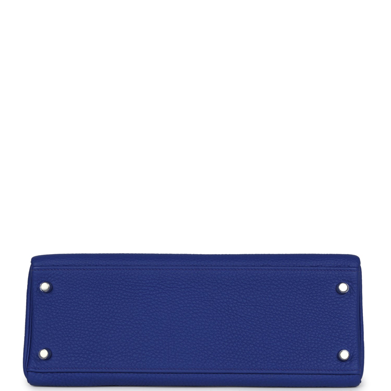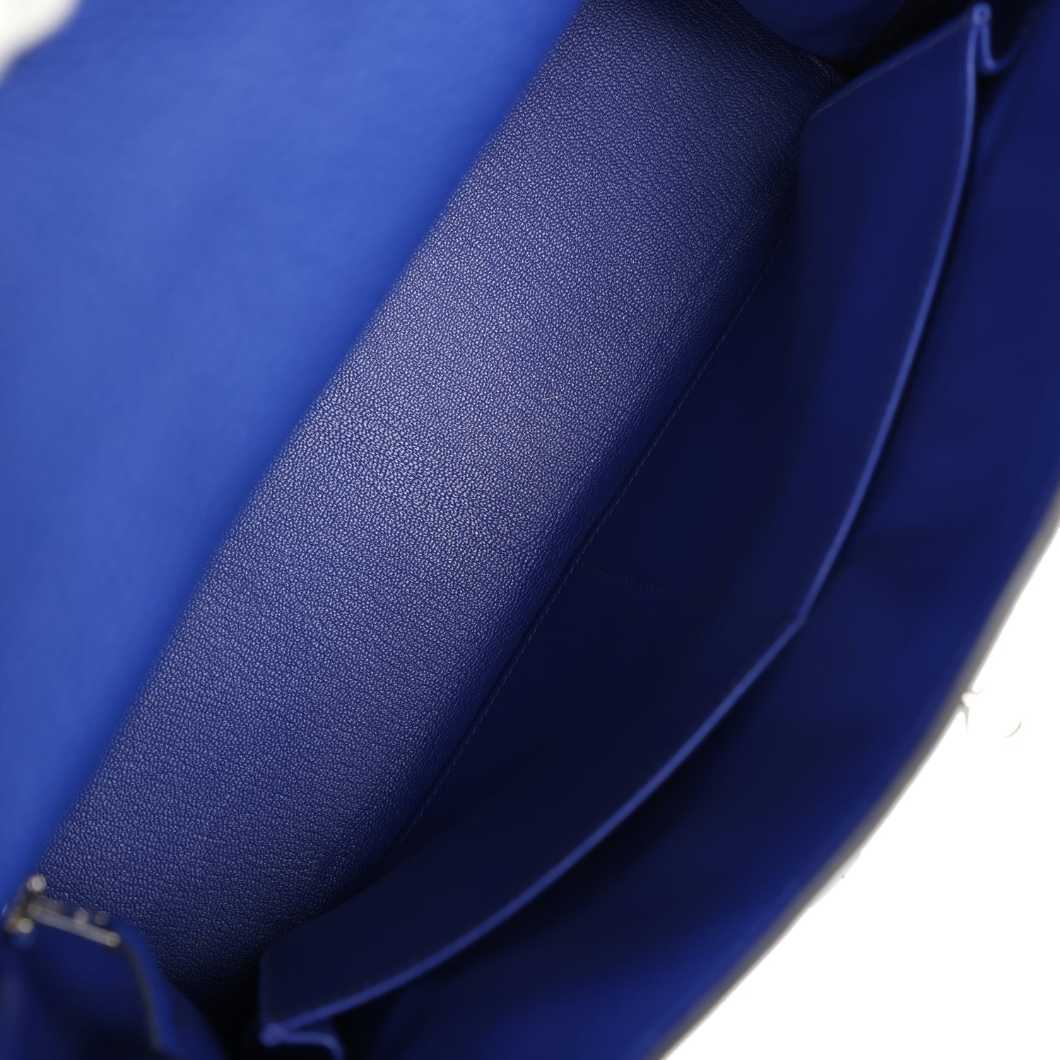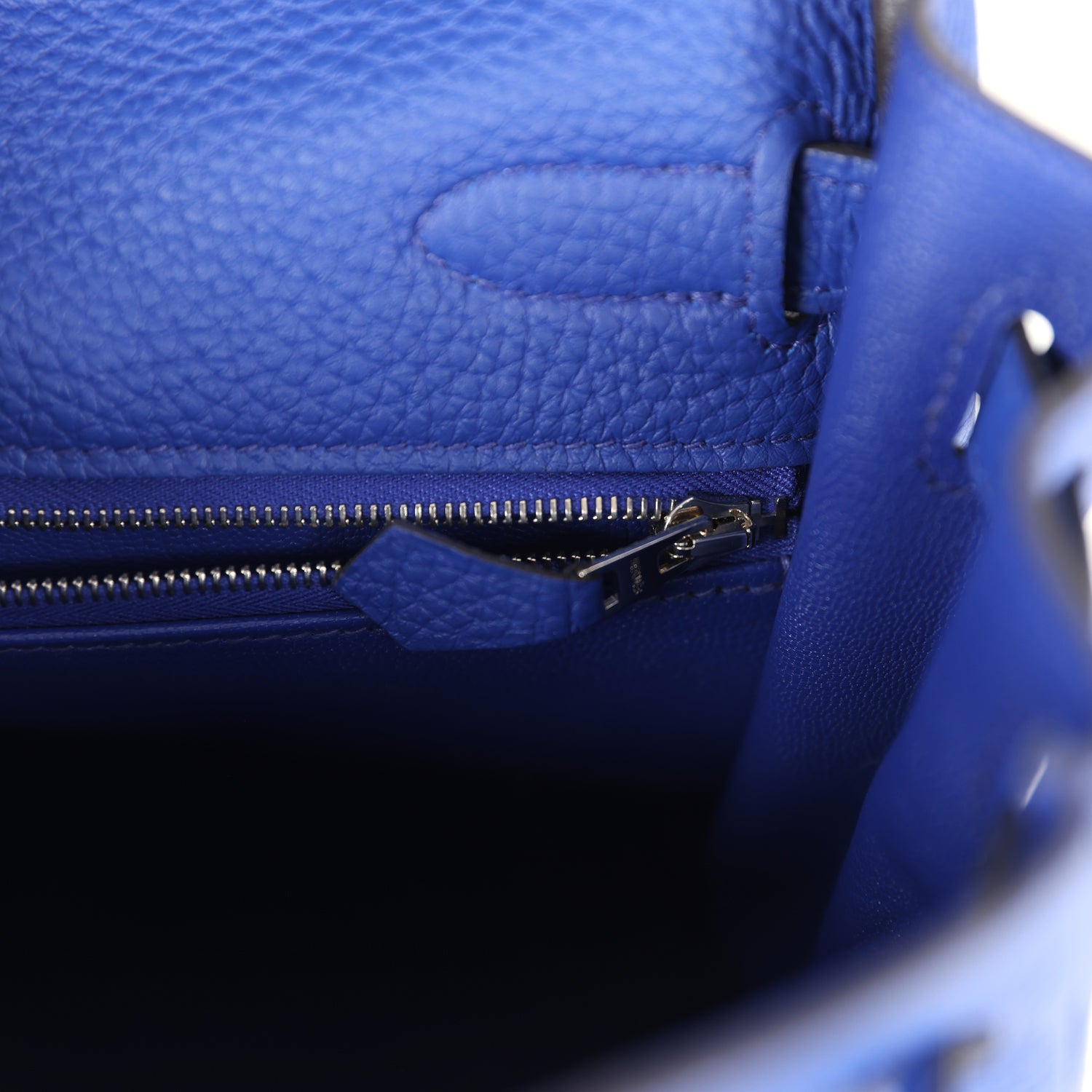 The interior is lined with Bleu Electrique chevre and features one zip pocket with an Hermes engraved pull and two open pockets on the opposite side.