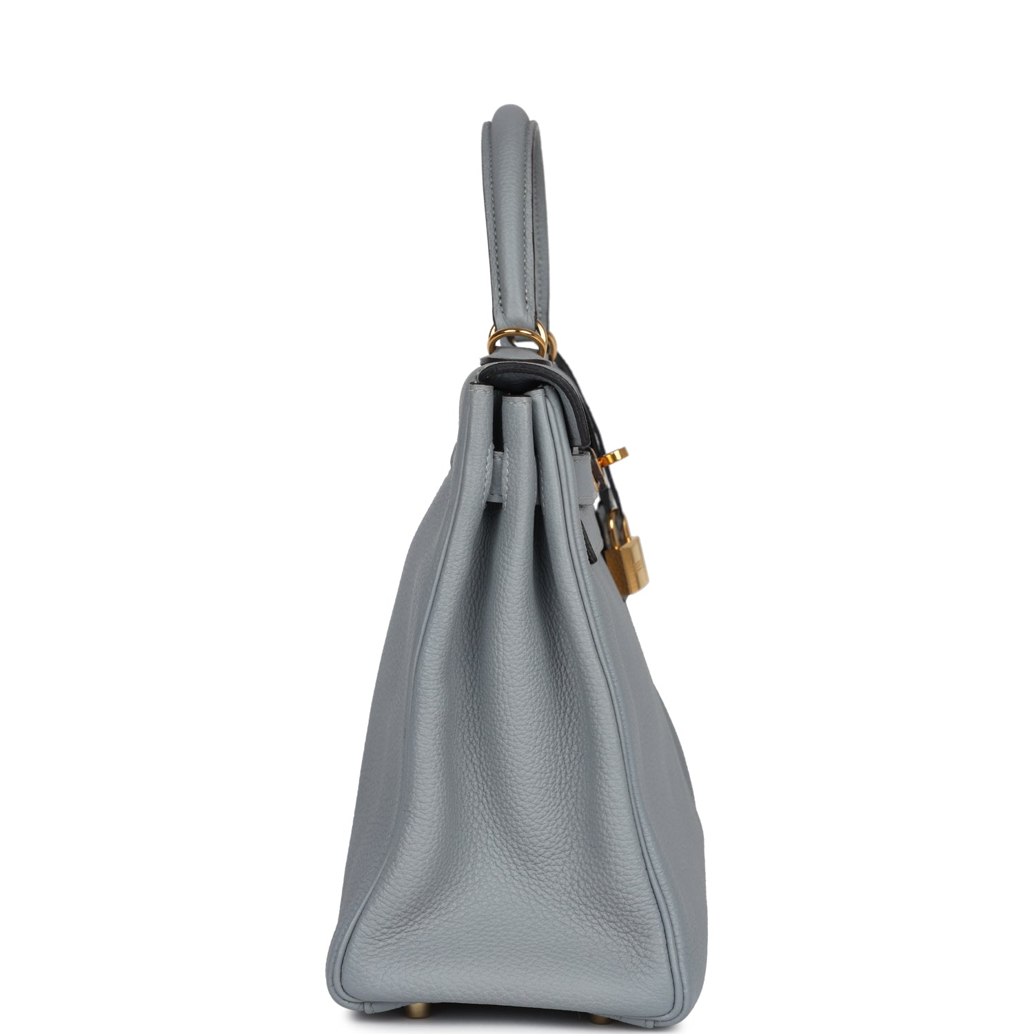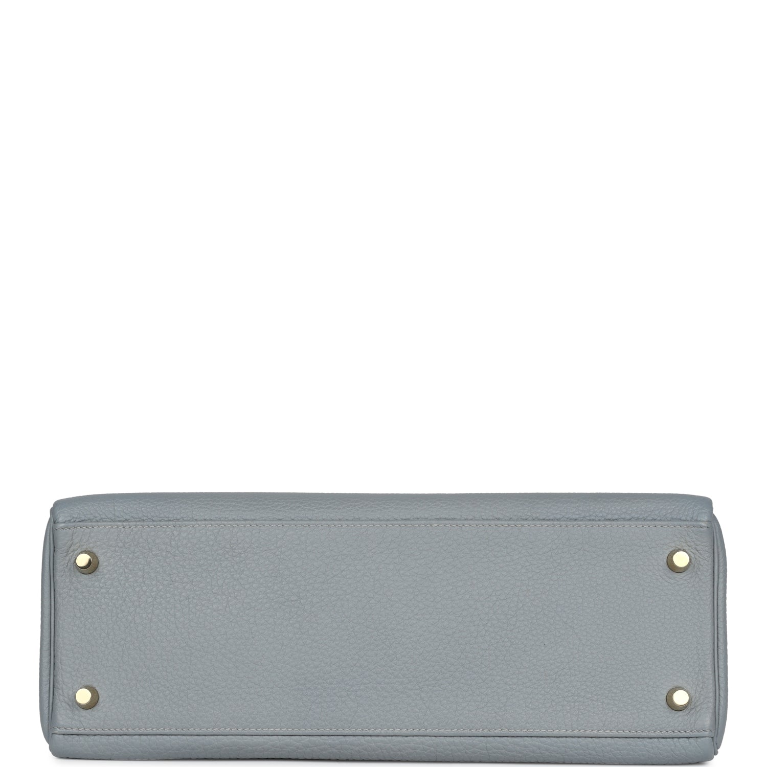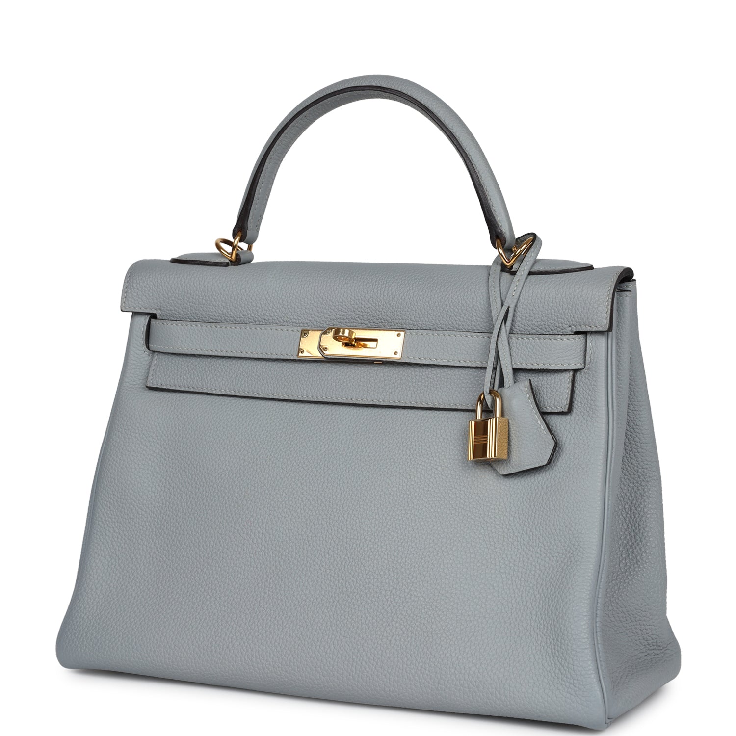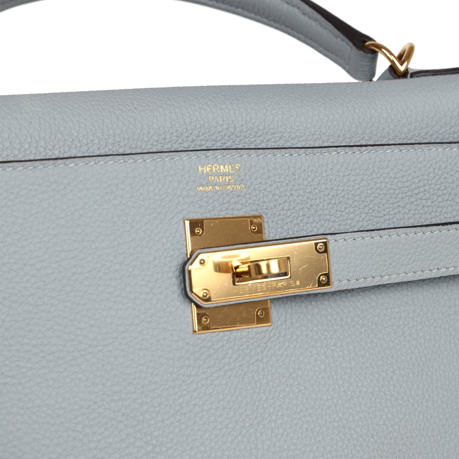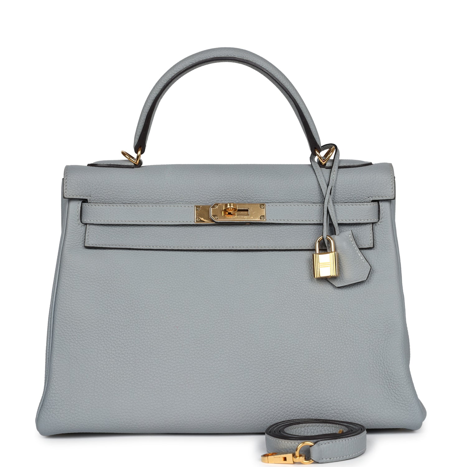 This Kelly, in the Retourne style, is in Bleu Glacier togo leather with gold hardware and has tonal stitching, two straps with front toggle closure, clochette with lock and two keys, single rolled handle and removable shoulder strap.