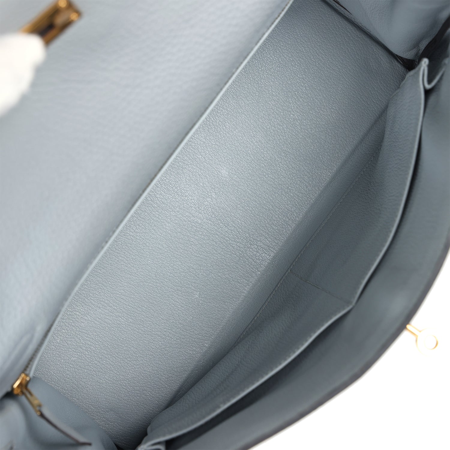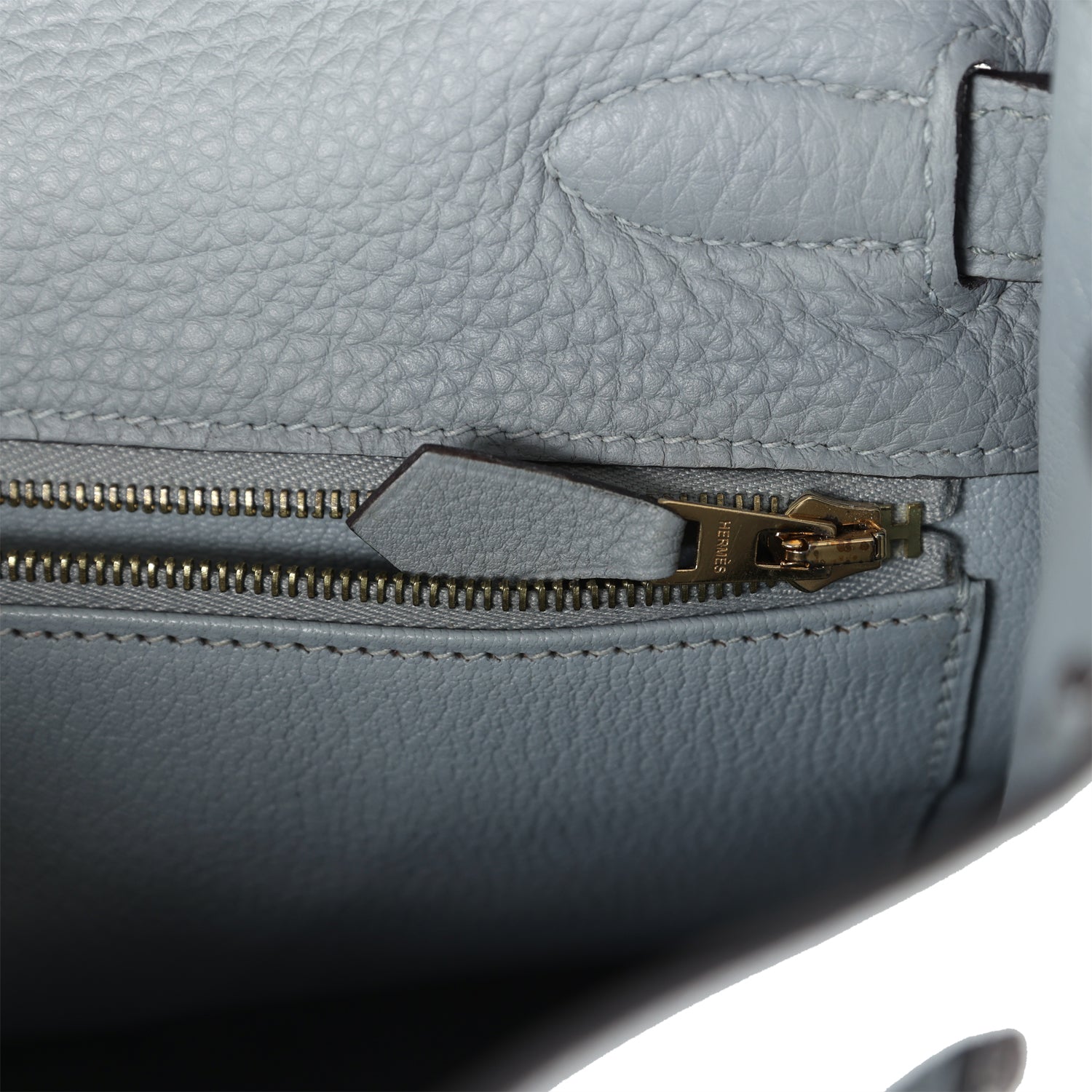 The interior is lined with Bleu Glacier chevre and features one zip pocket with an Hermes engraved pull and two open pockets on the opposite side.