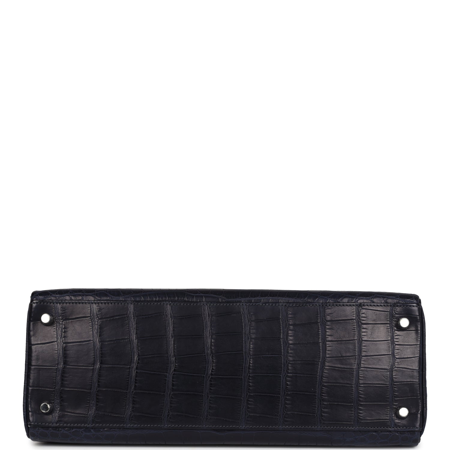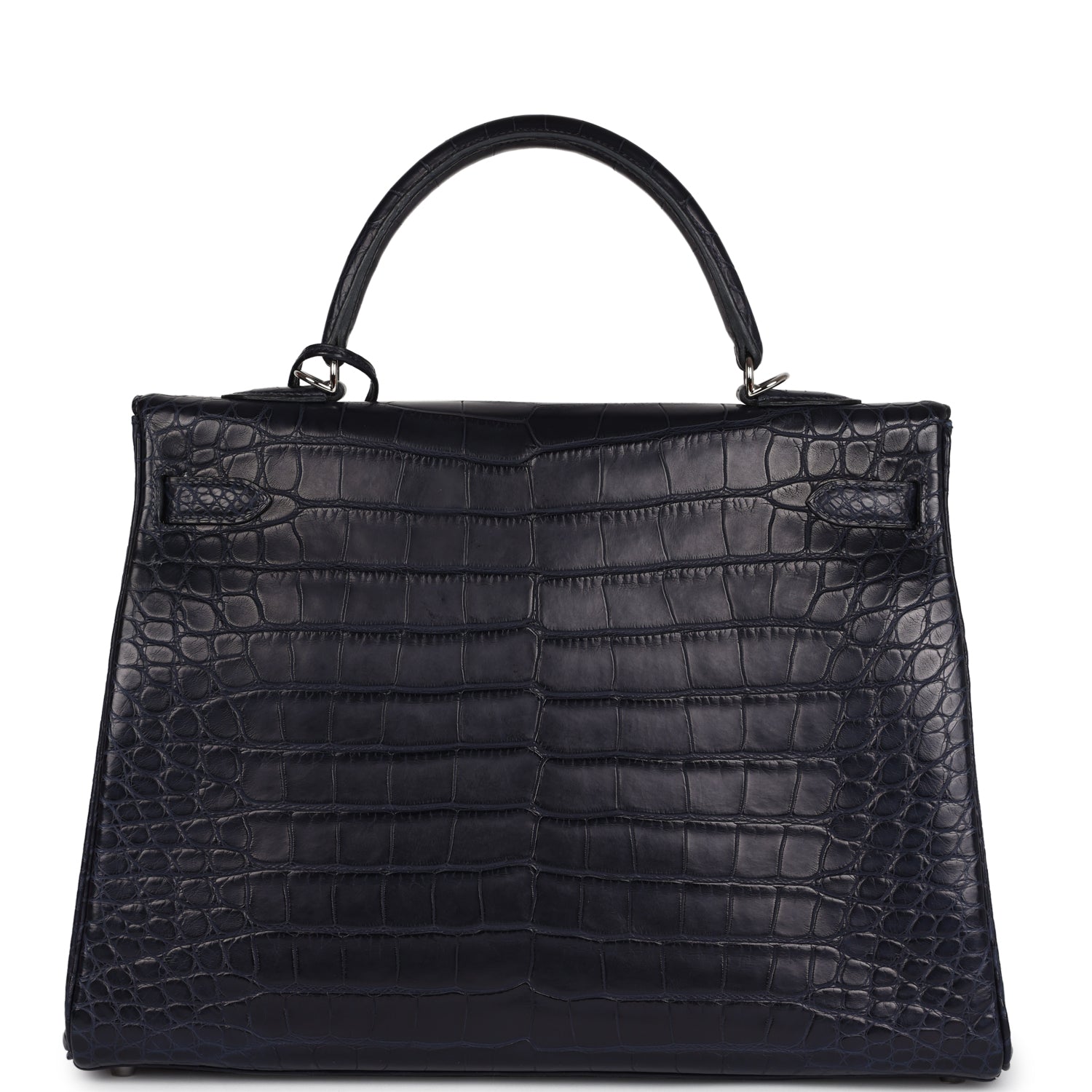 This Kelly, is a Retourne Style, in Bleu Indigo Matte Alligator leather with palladium hardware and features tonal stitching, two straps with front toggle closure, clochette with lock and two keys, single rolled handle and removable strap.