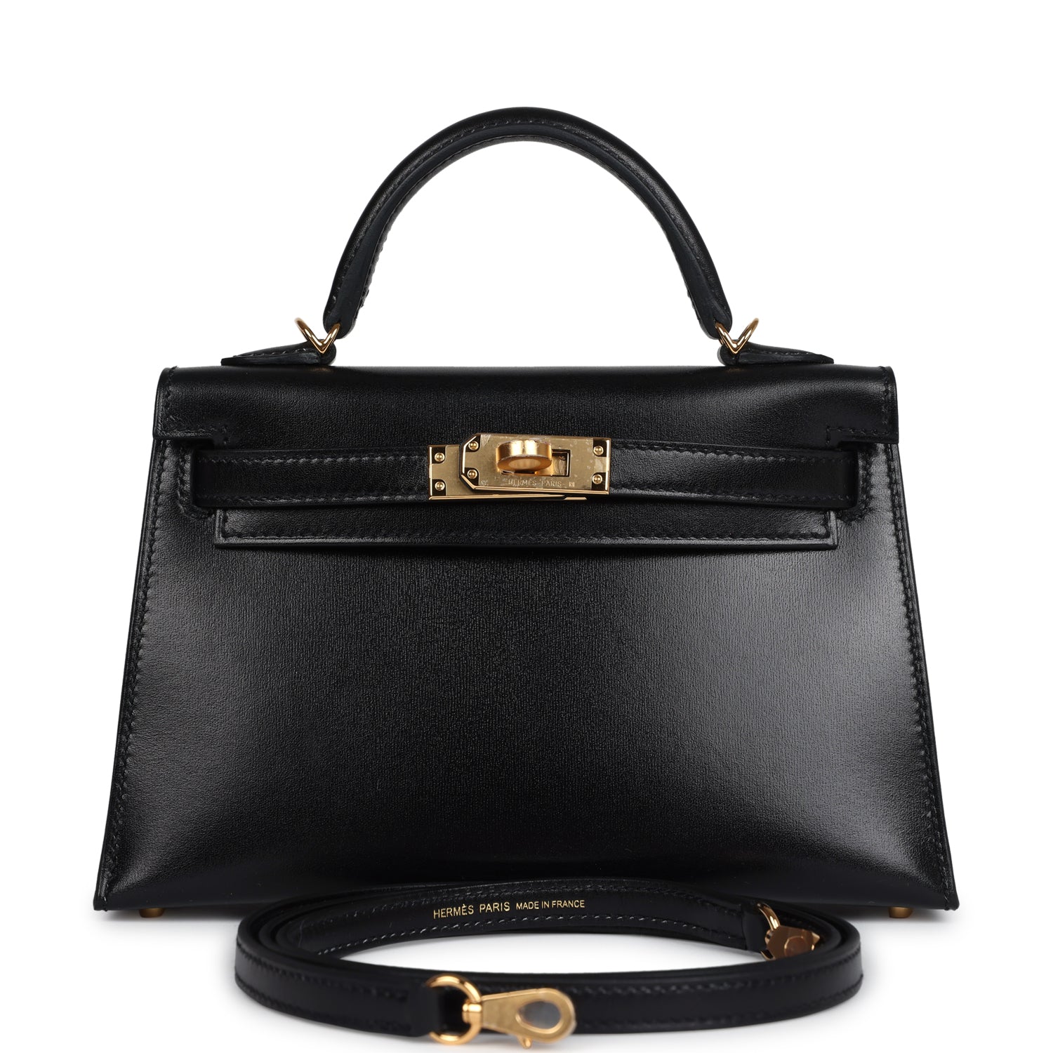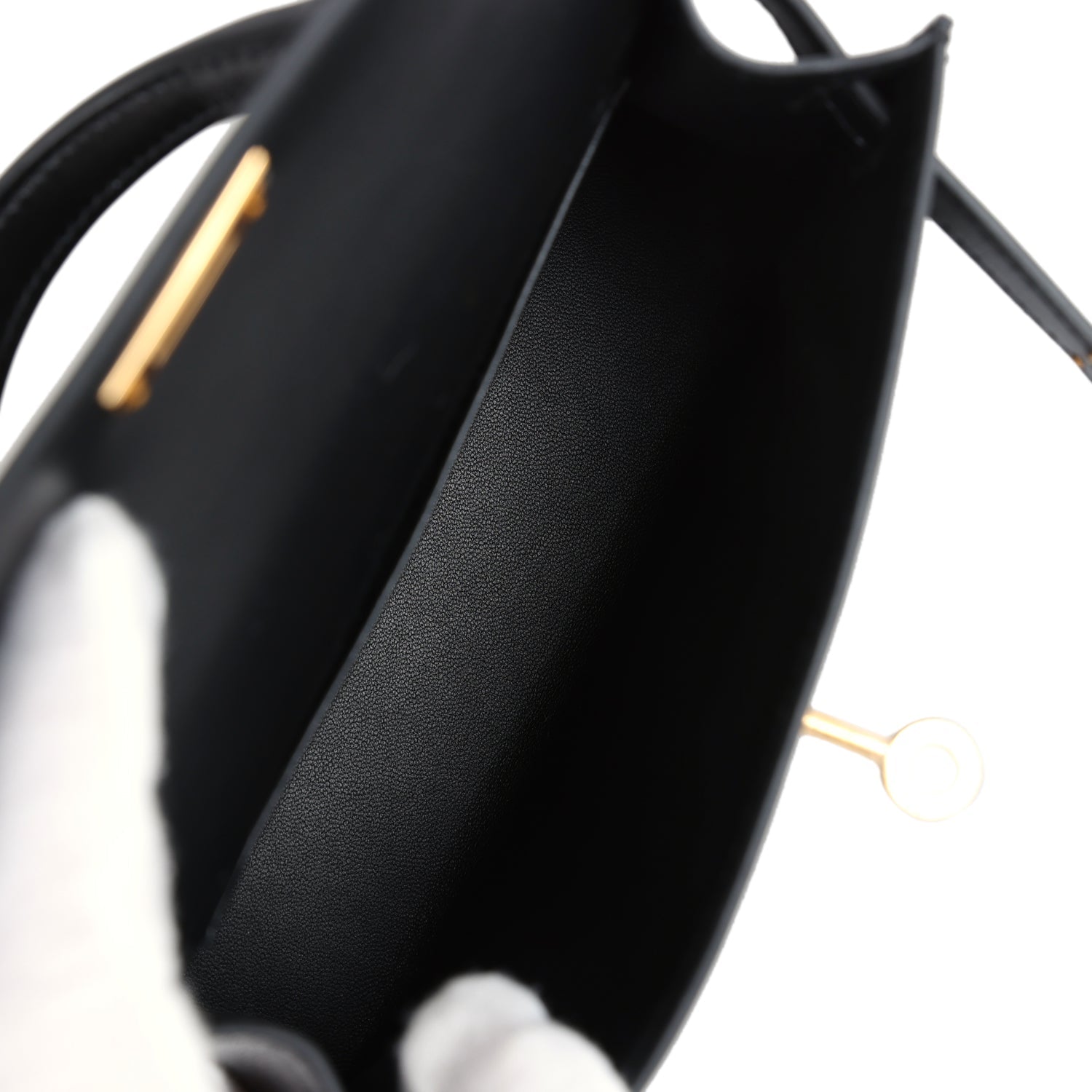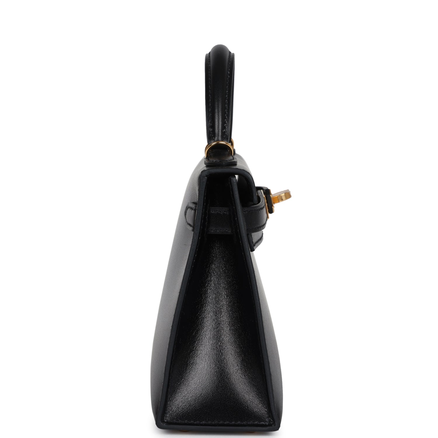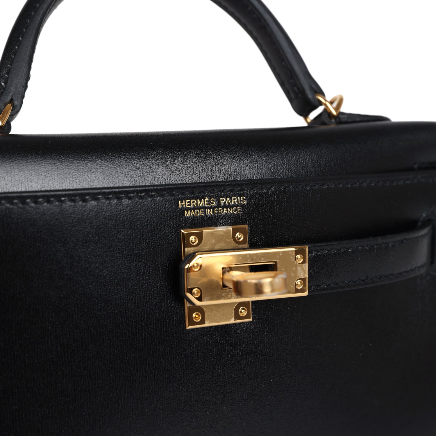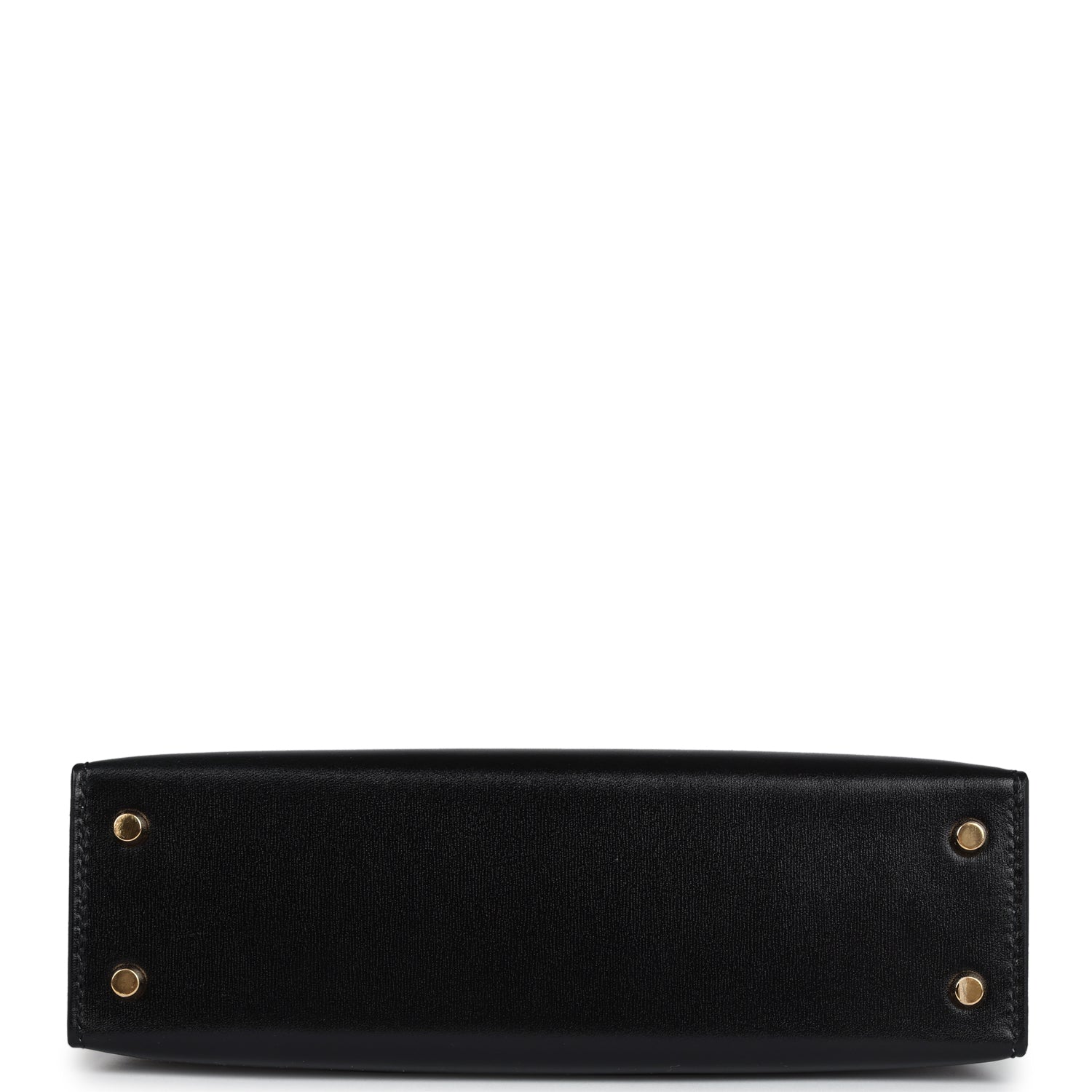 This Kelly, in the Sellier style, is in Black box leather with gold hardware and has tonal stitching, two straps with front toggle closure, single rolled handle and removable shoulder strap.