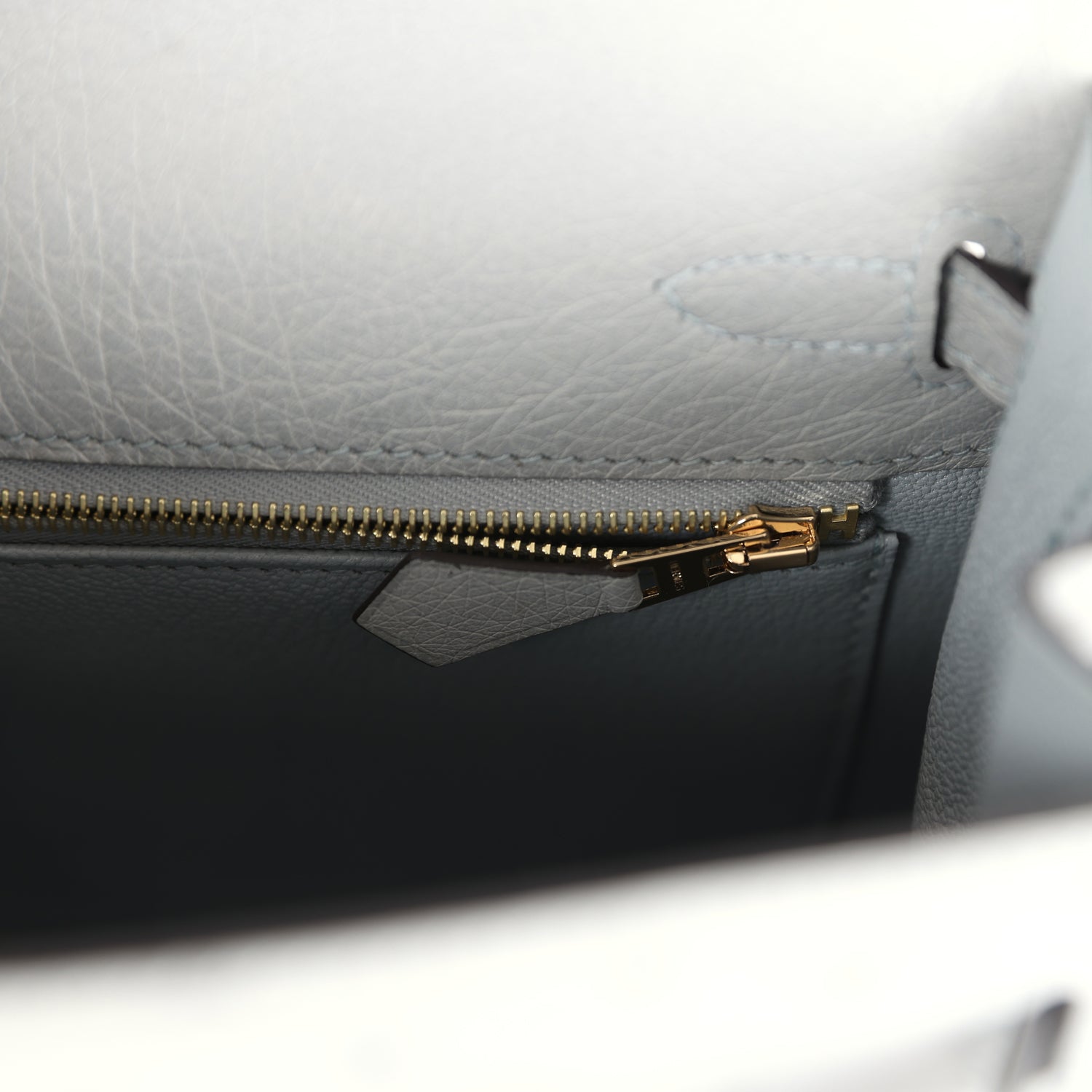 The interior is lined with Bleu Glacier chevre and has a zipper pocket with an Hermes engraved pull and one pocket on the opposite side.
