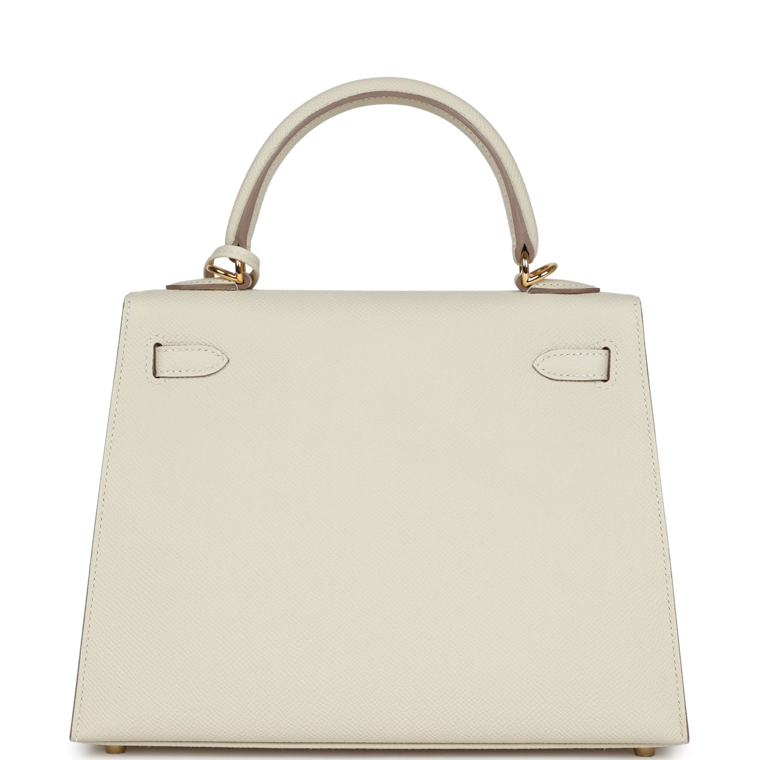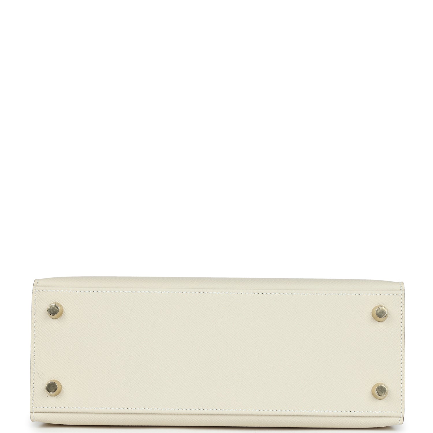 Kelly, in the Sellier style, is in Craie epsom leather with Gold hardware and has tonal stitching, front flap, two straps with center toggle closure, clochette with lock and two keys, single rolled handle and removable shoulder strap.