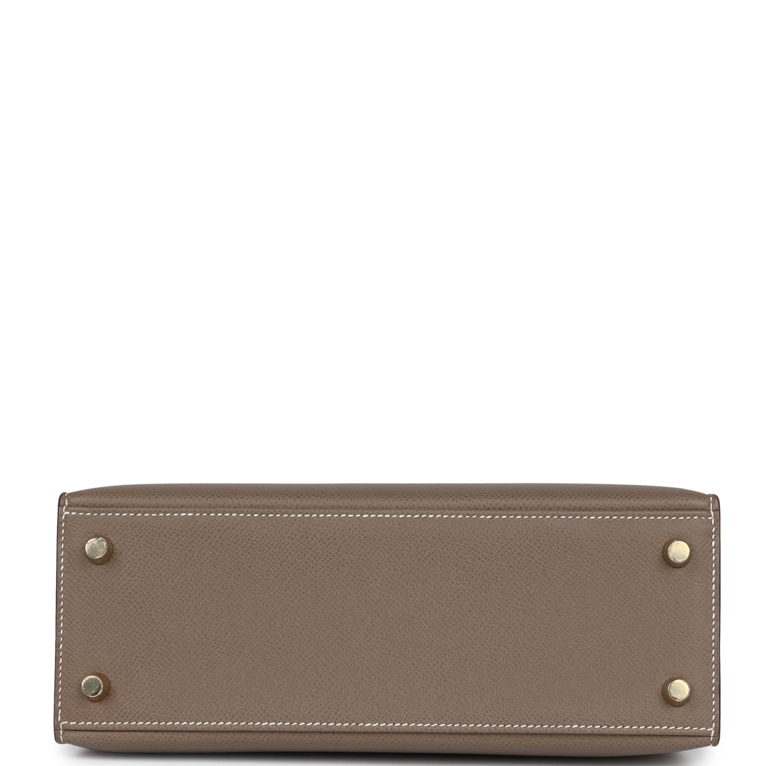 This Kelly, in the Sellier style, is in Etoupe epsom leather with gold hardware, has contrast stitching, front flap, two straps with center toggle closure, clochette with lock and two keys a single rolled handle and removable shoulder strap.