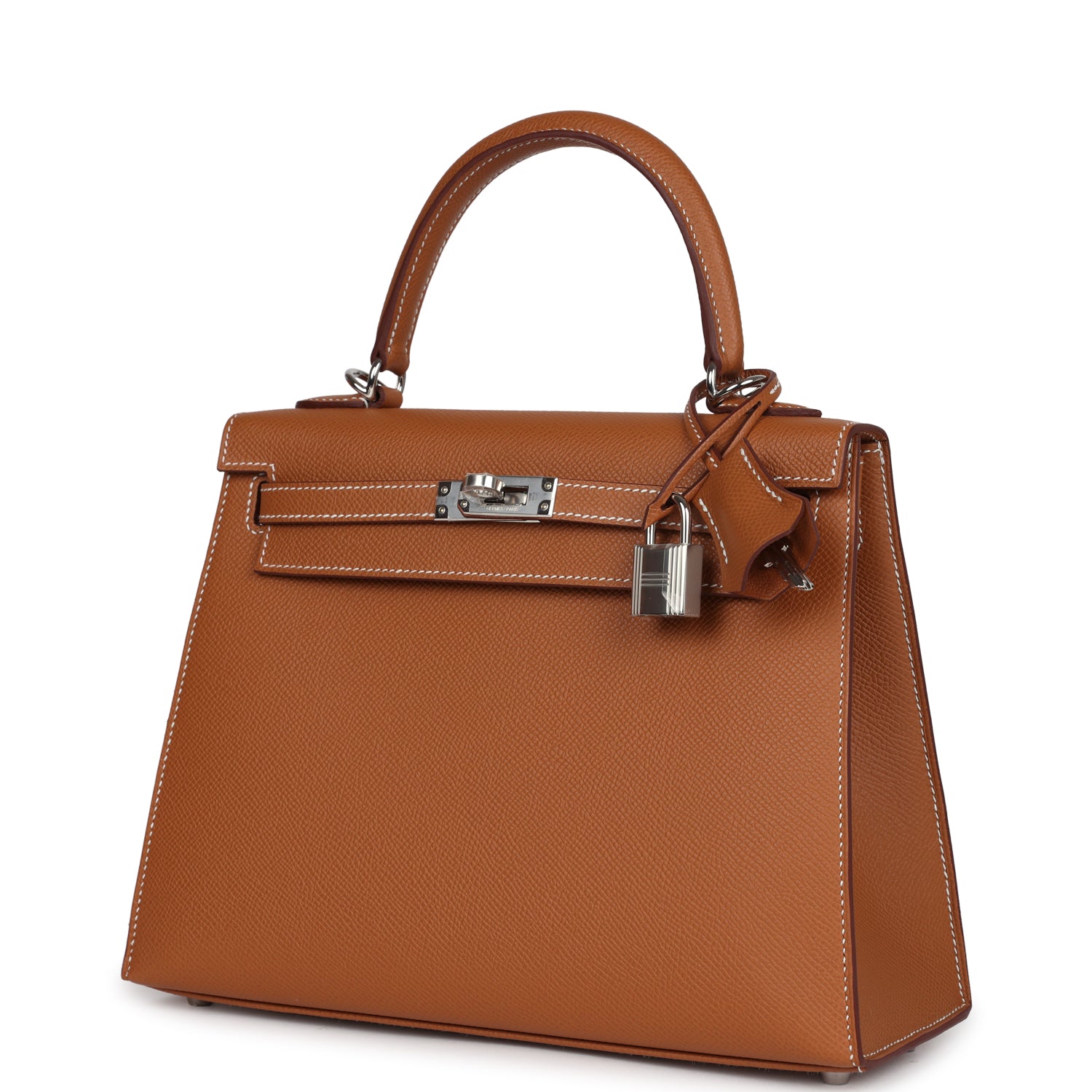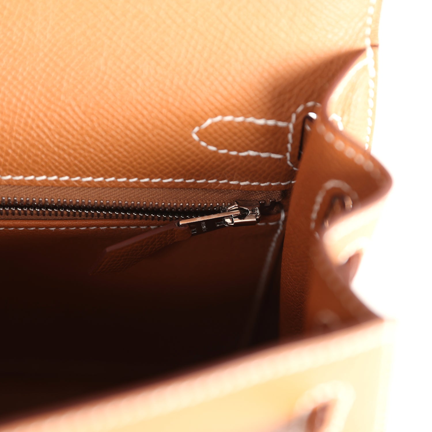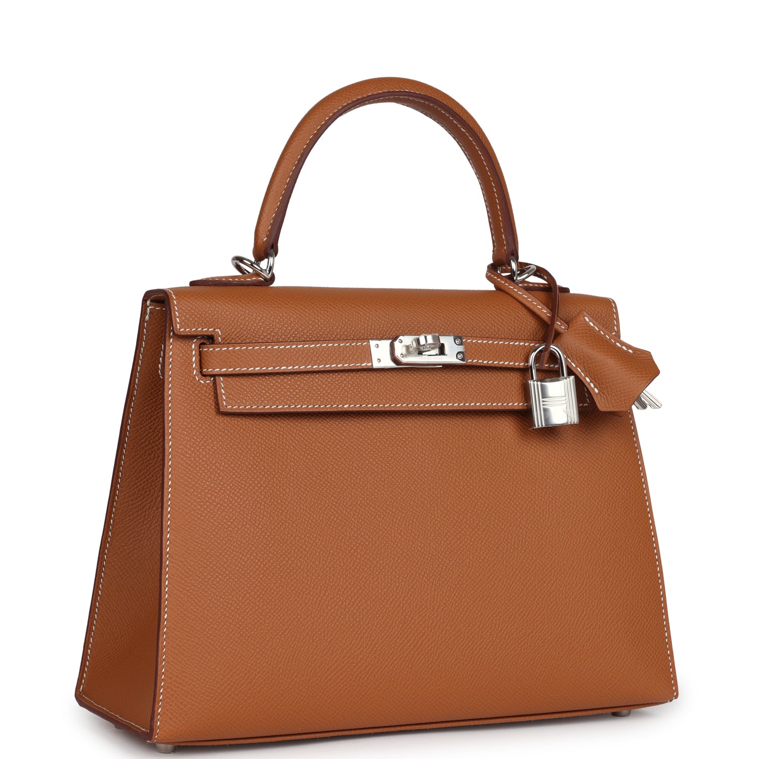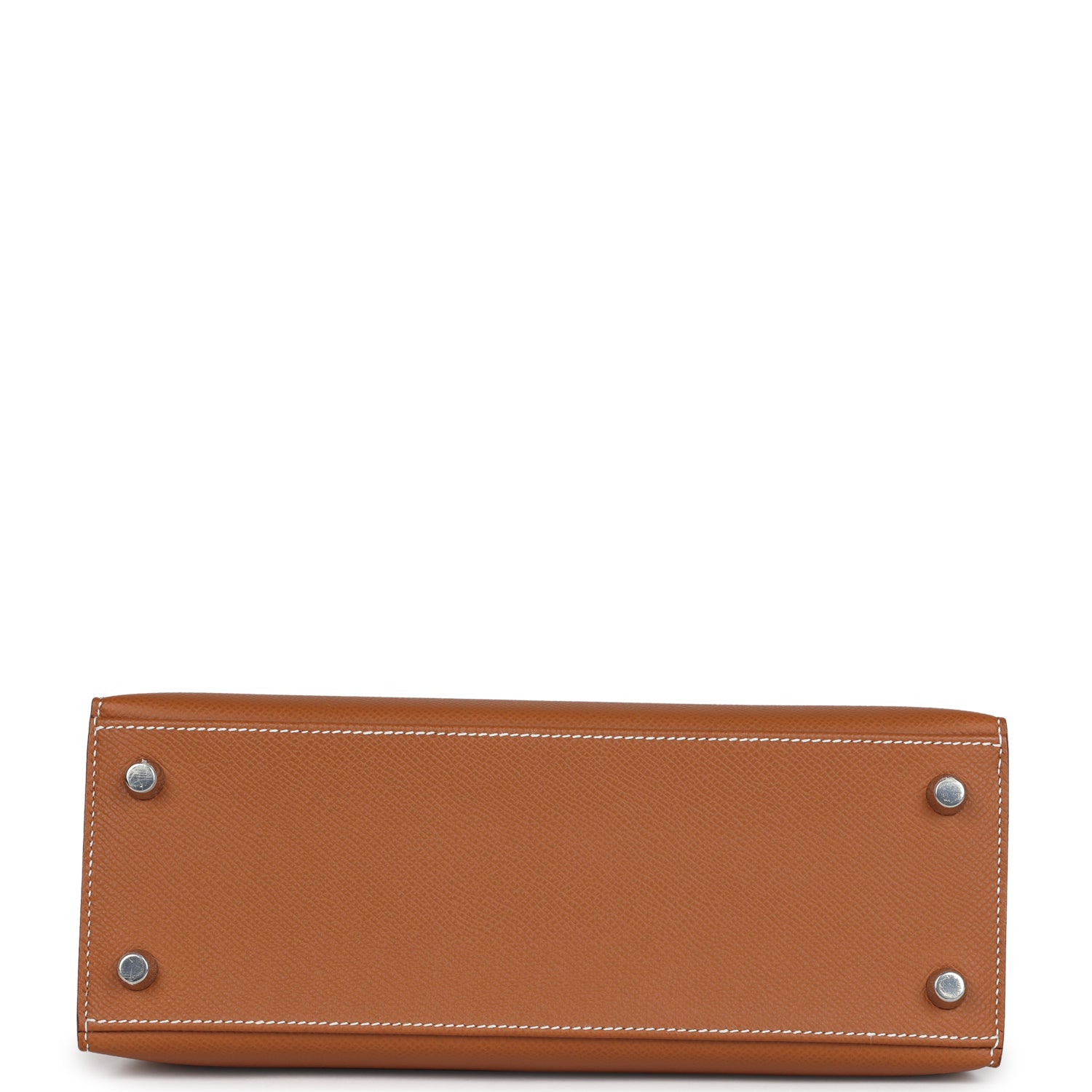 Kelly, in the Sellier style, is in Gold epsom leather with palladium hardware, has contrast stitching, two straps with front toggle closure, clochette with lock and two keys, a single rolled handle and removable shoulder strap.