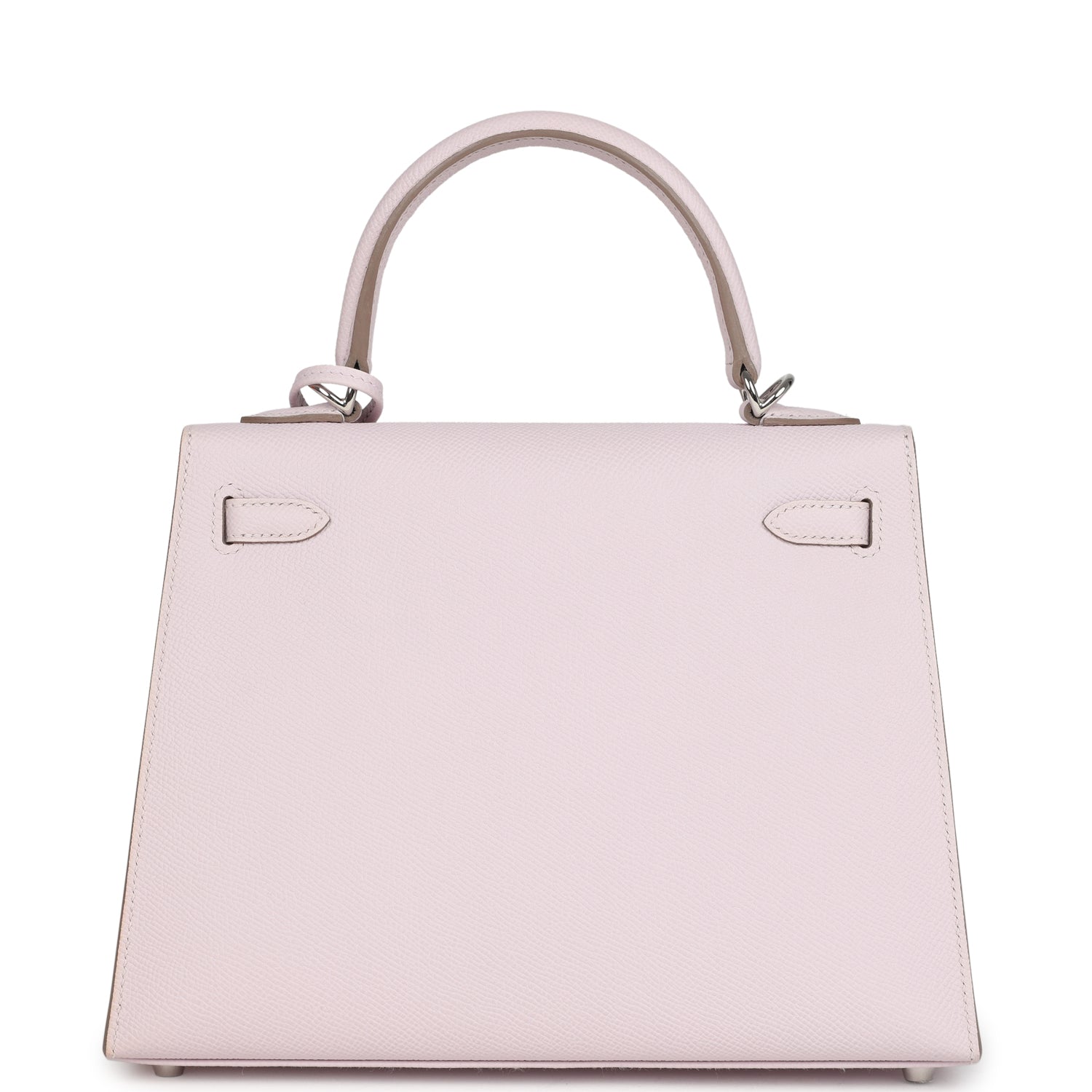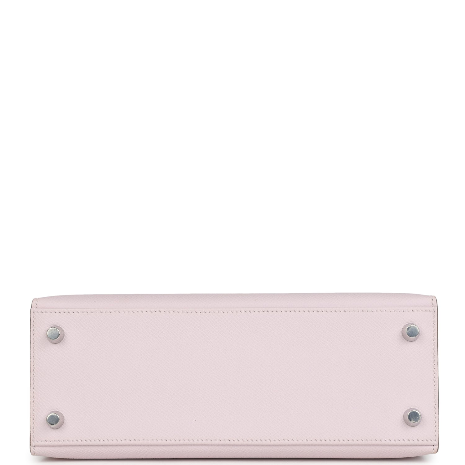 This Kelly, in the Sellier style, is in Mauve Pale epsom leather with palladium hardware and has tonal stitching, two front straps with toggle closure, clochette with lock and two keys, single rolled handle and removable shoulder strap.