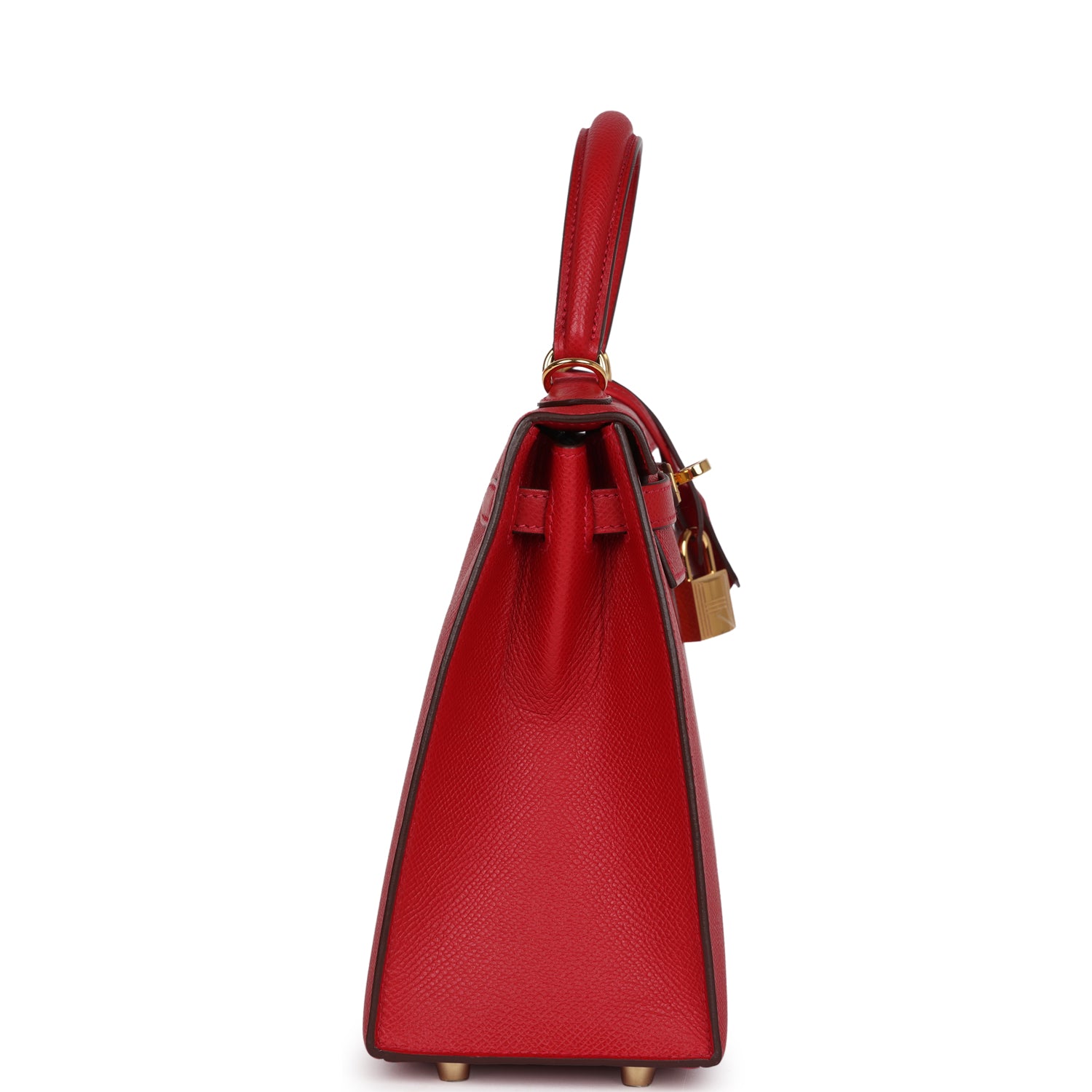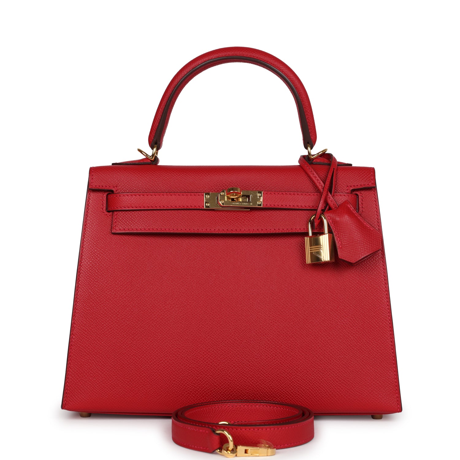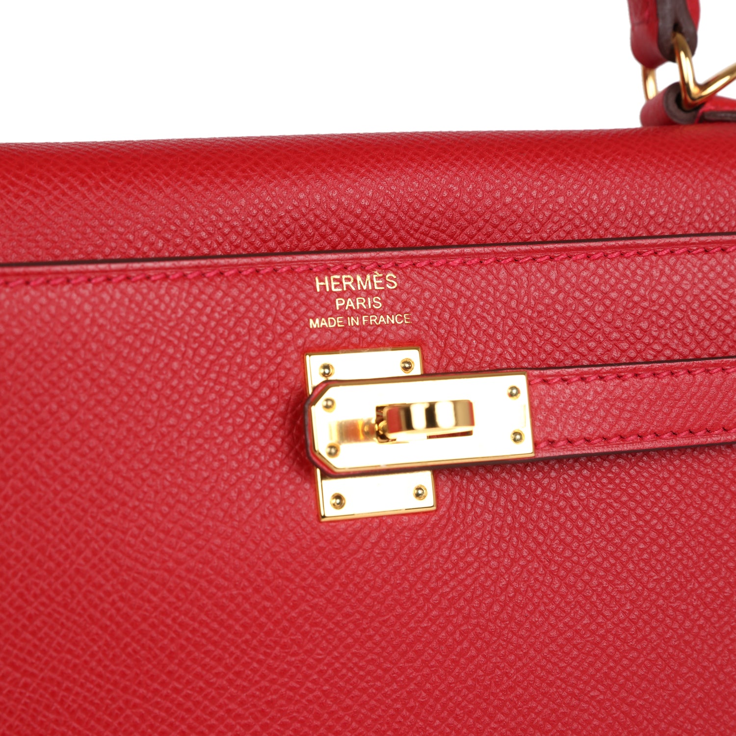 Kelly, in the Sellier style, is of Rouge Casaque epsom leather with gold hardware and has tonal stitching, front flap, two straps with center toggle closure, clochette with lock and two keys, single rolled handle and an optional shoulder strap.