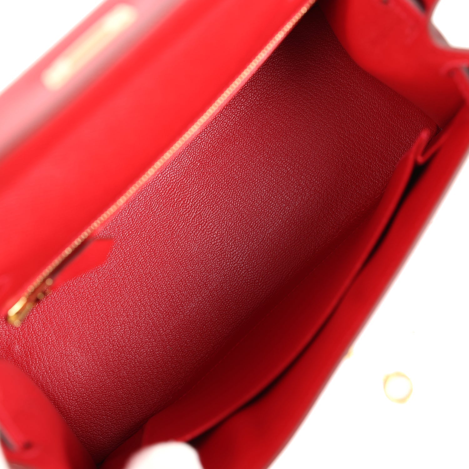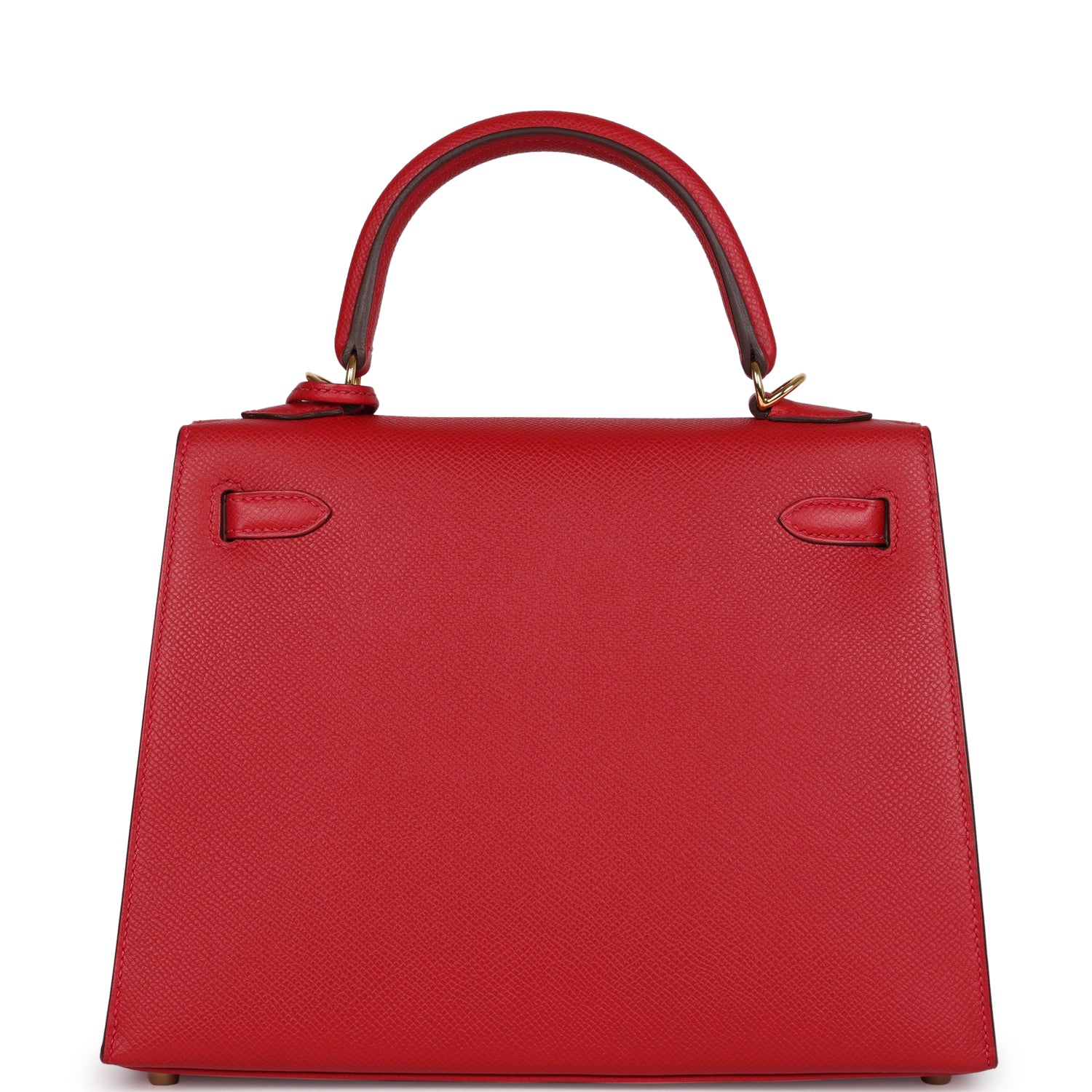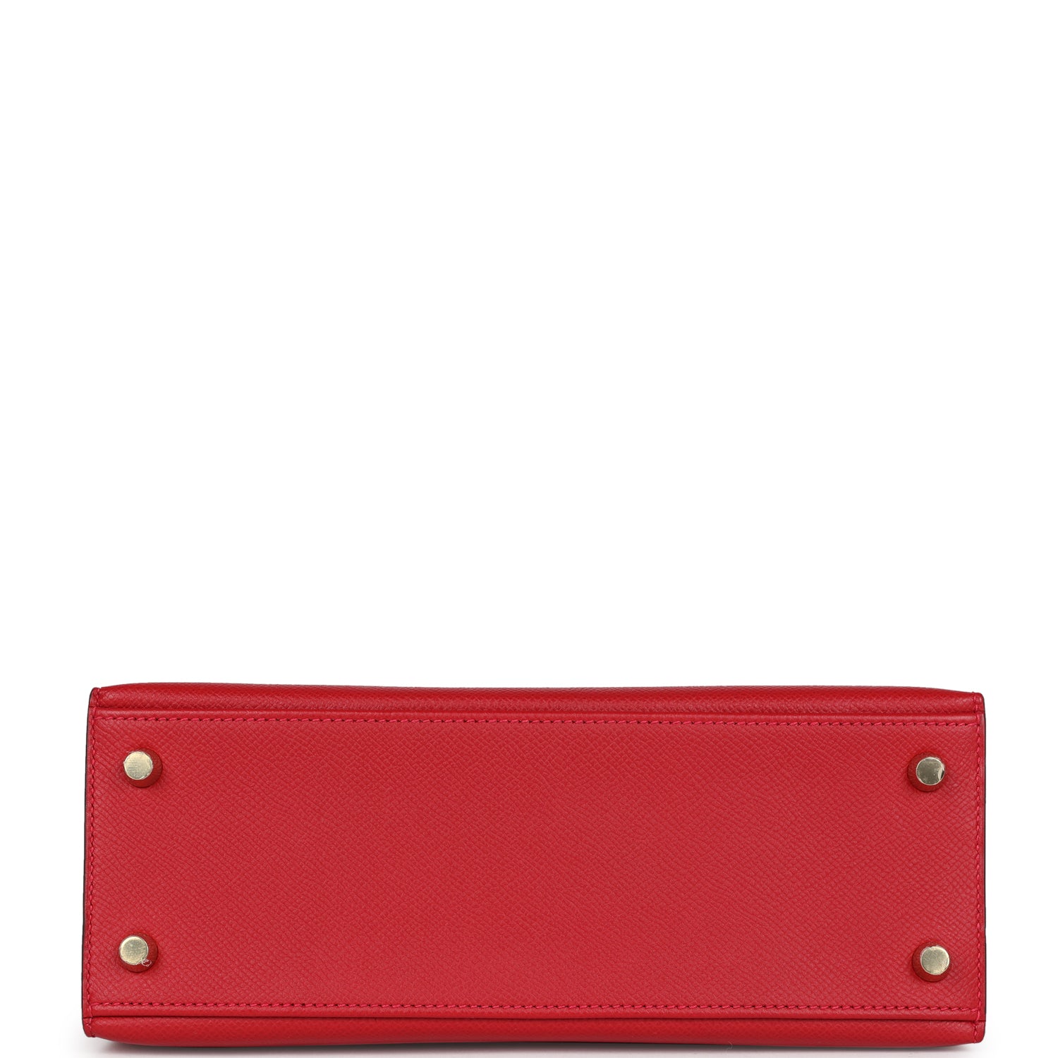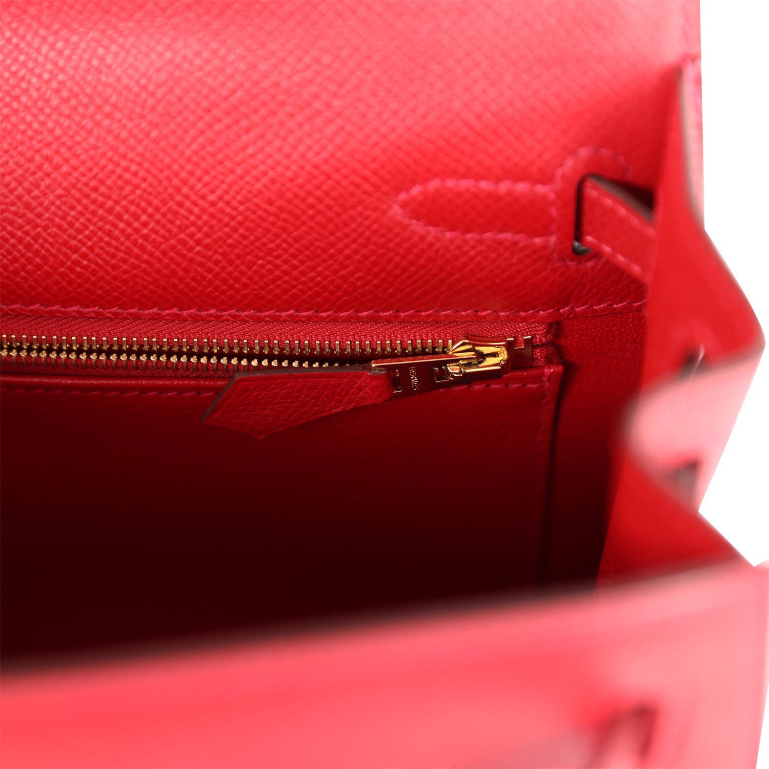 Kelly, in the Sellier style, is of Rouge Casaque epsom leather with gold hardware and has tonal stitching, front flap, two straps with center toggle closure, clochette with lock and two keys, single rolled handle and an optional shoulder strap.